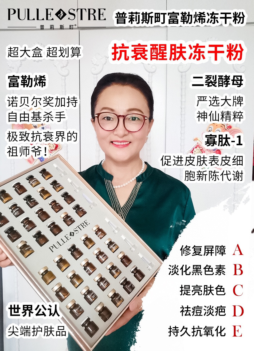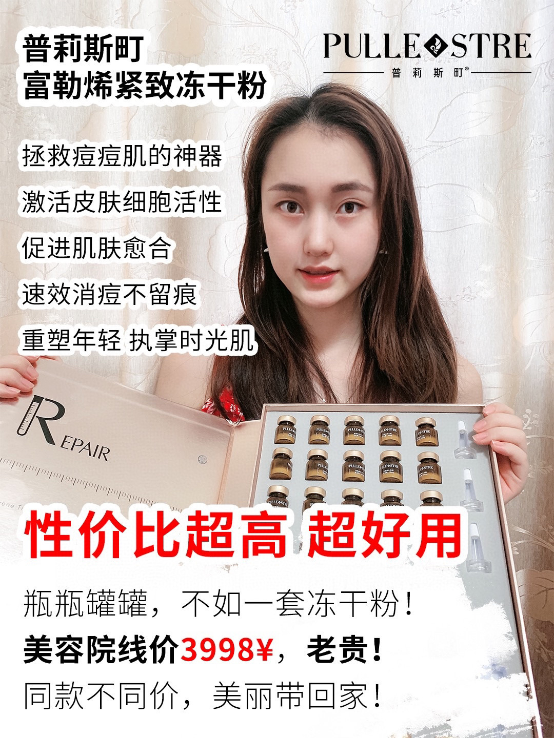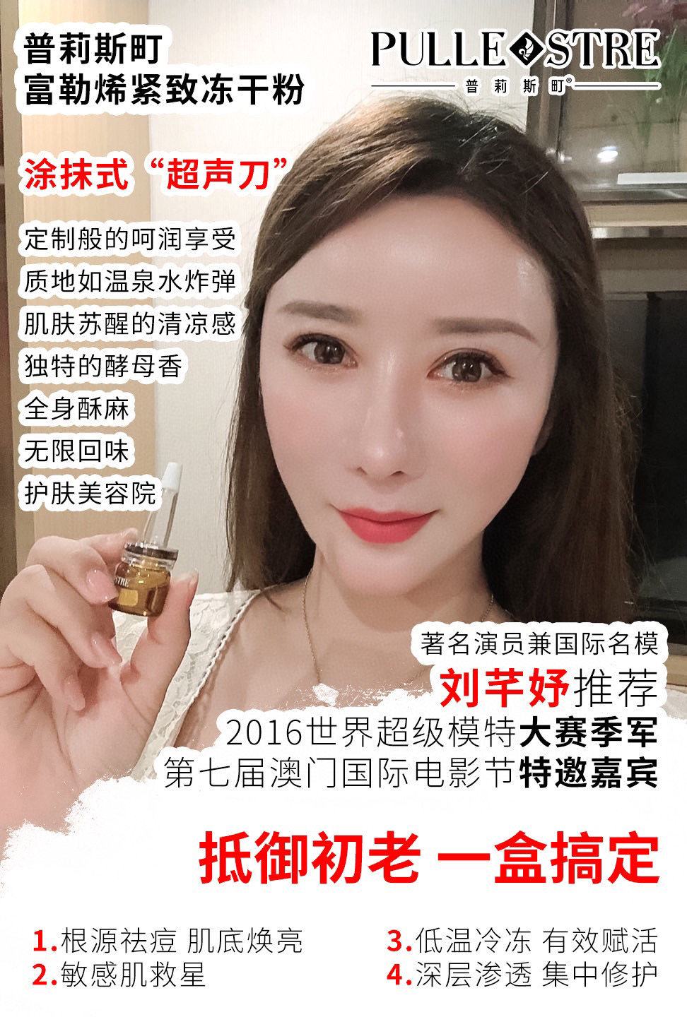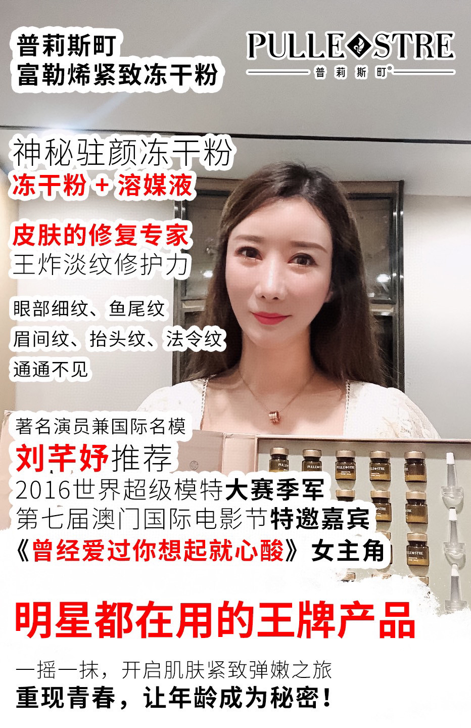 这款普莉斯町冻干粉是我们直接去谈的,已经有4200家美容院都在用,著名演员兼国际名模刘芊妤推荐,