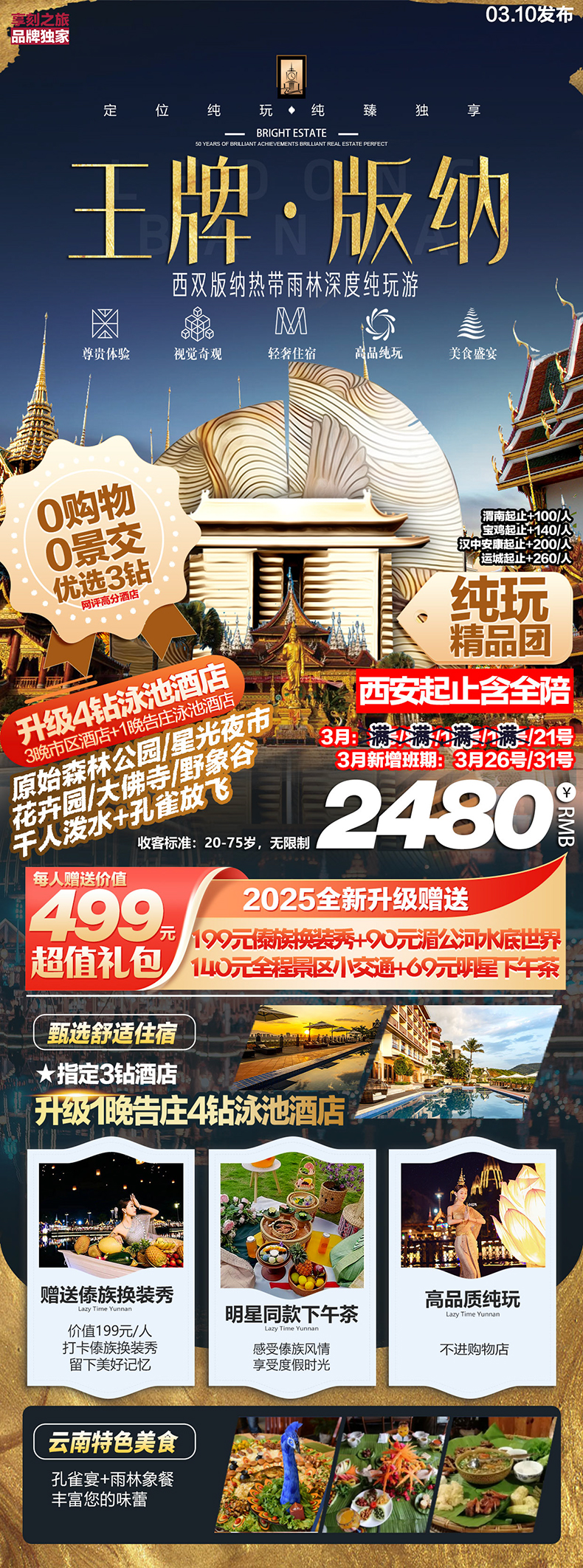 西双版纳双飞5日游 热带雨林深度纯玩游精品团 体验云南美食 打卡傣族换装秀