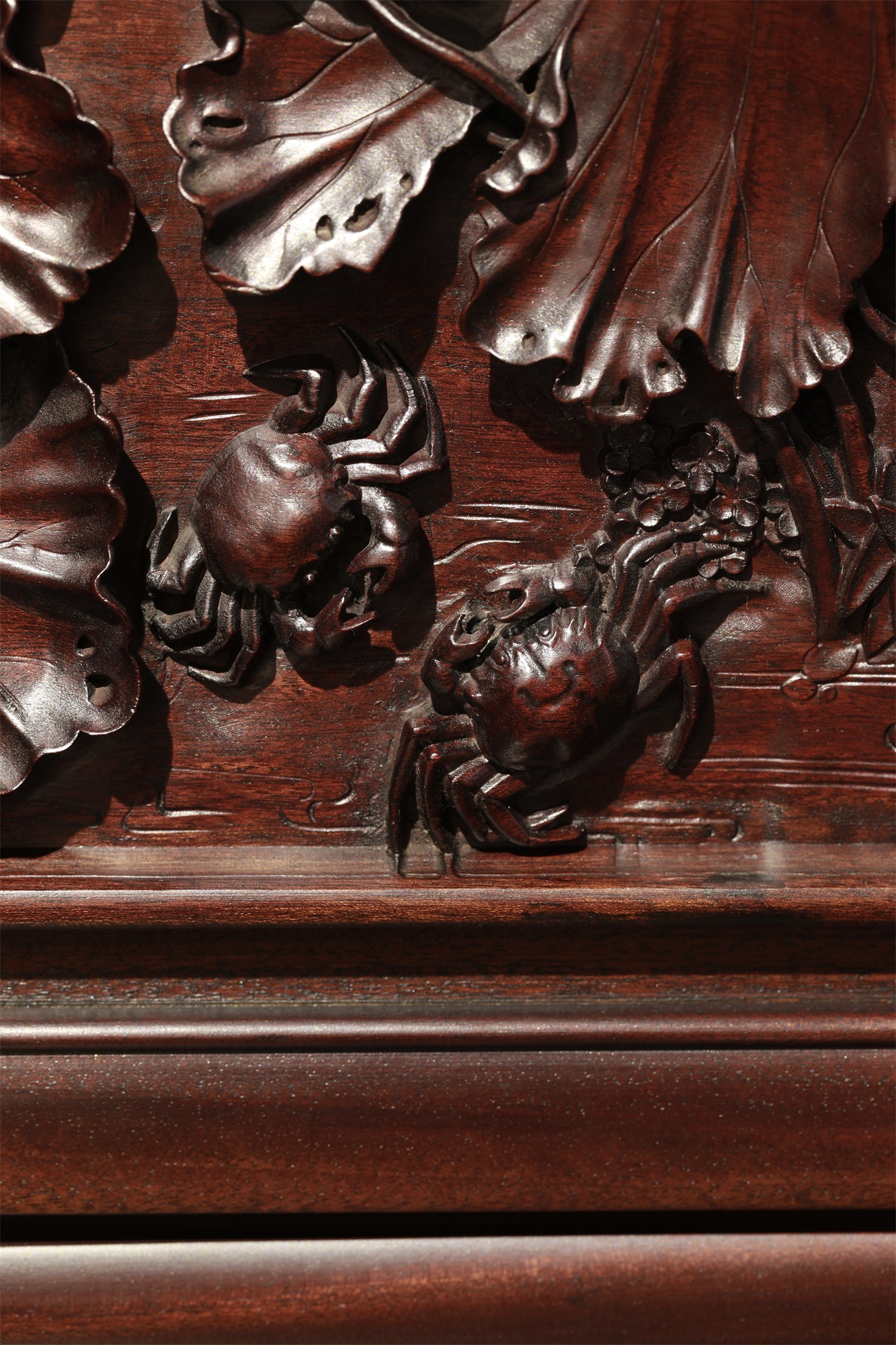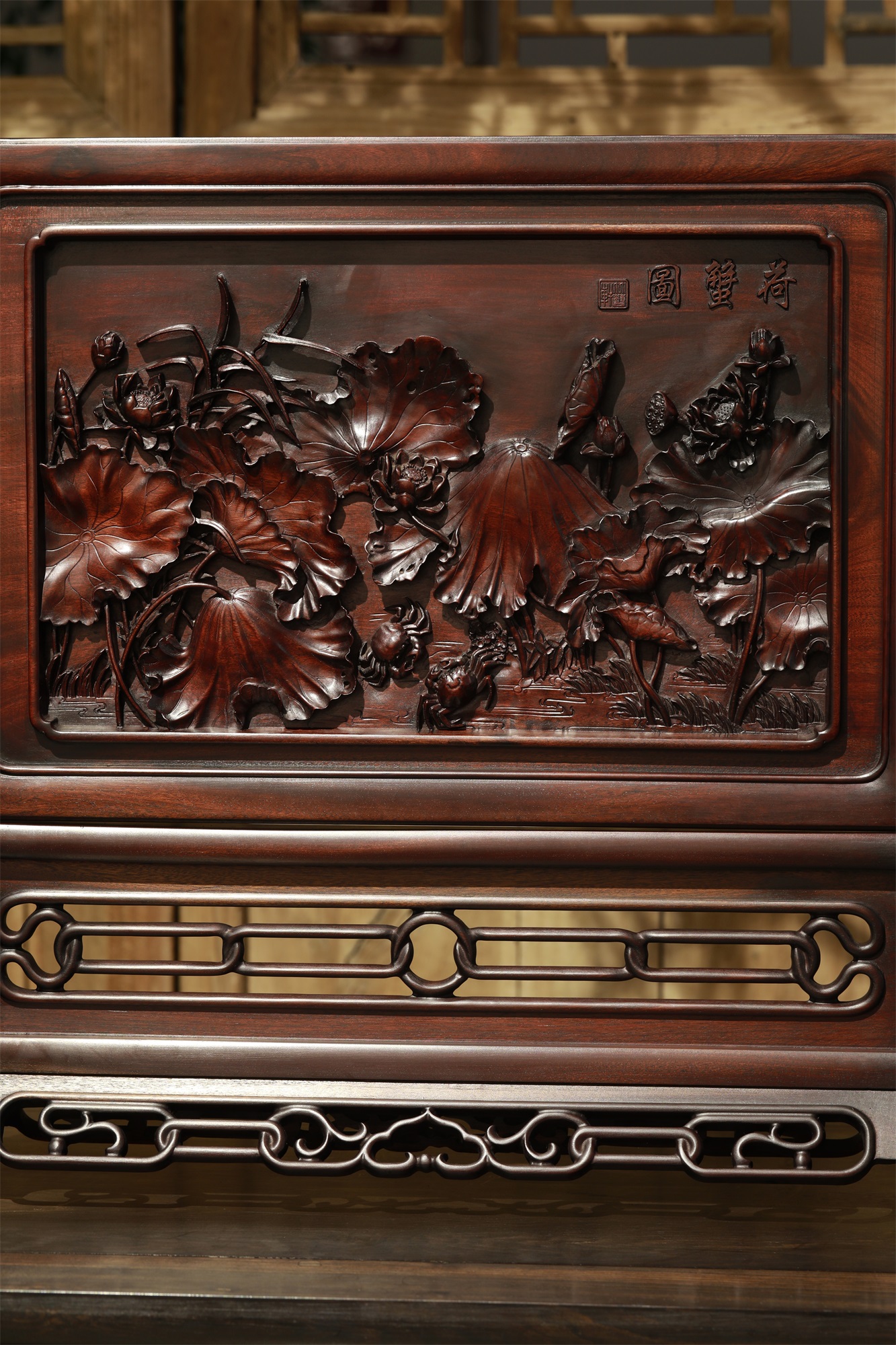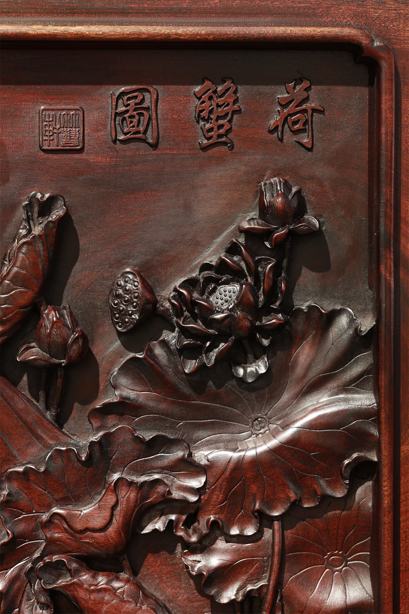 作品采用徽州传统手工艺雕刻而成。方寸间荷花枝干灵动,穿插有致,花与叶的层次、位置、穿插、向背,繁而不乱,显示出高妙的匠意。踞于荷叶间的小螃蟹成为构图的点睛之笔,刻划自然生动细腻,增添了画面的趣味。荷花、螃蟹均为中国传统的吉祥图案。“荷”“和”谐音,赋予荷和气、和平、祥和、和合、和好的美好寓意。也承载了文人墨客的生活情趣和人文情怀。