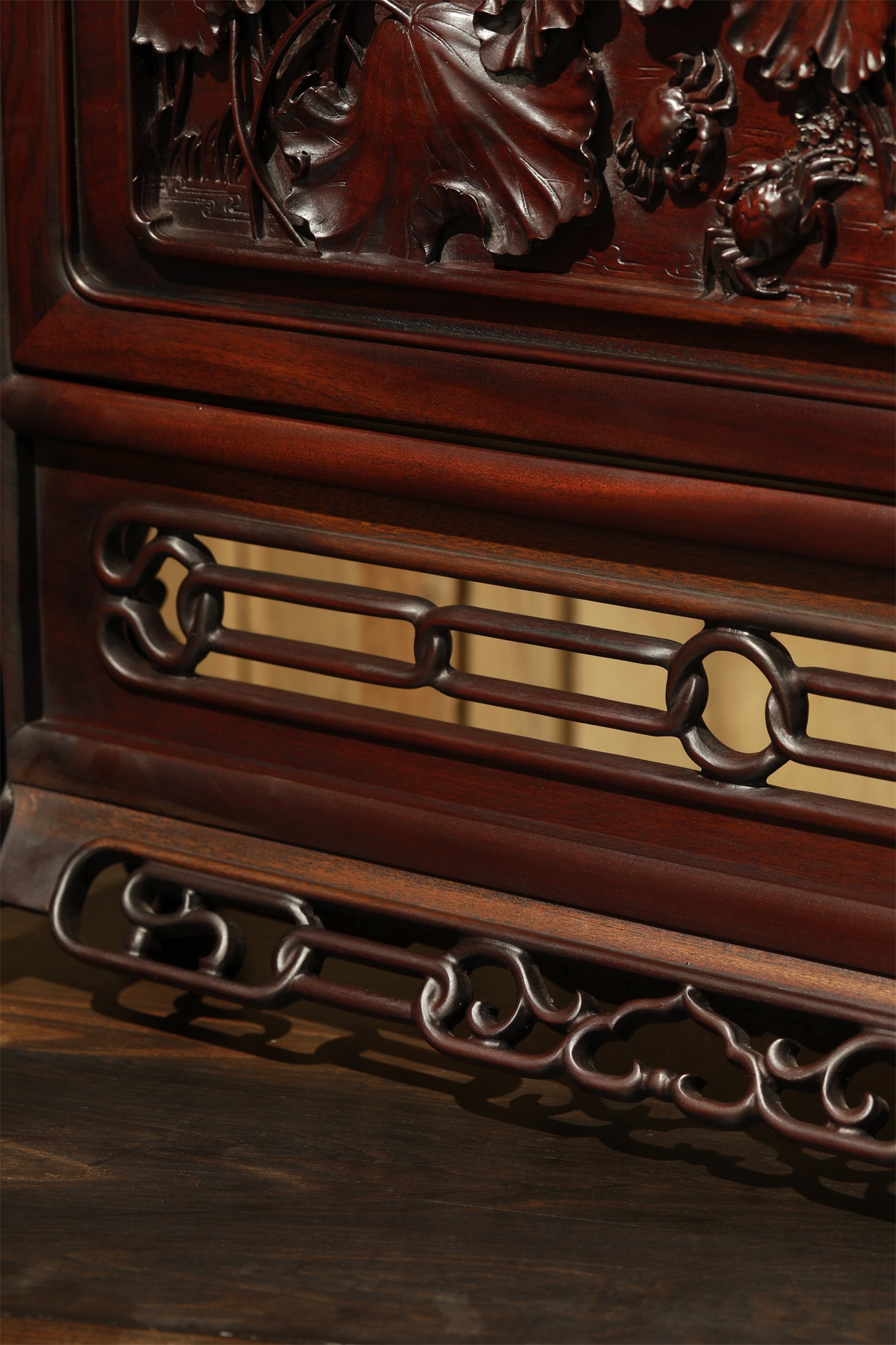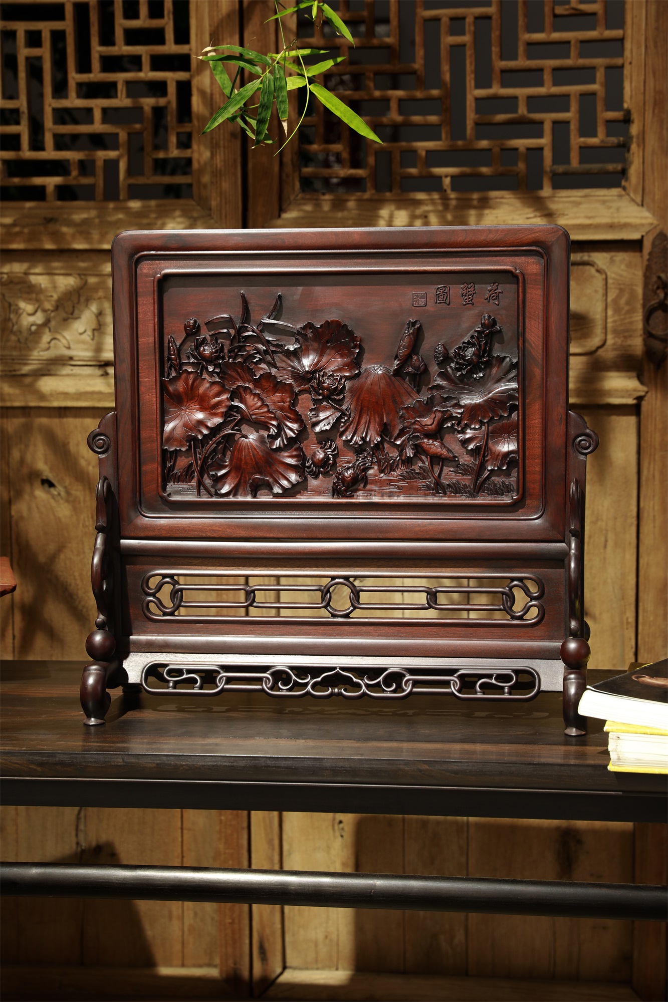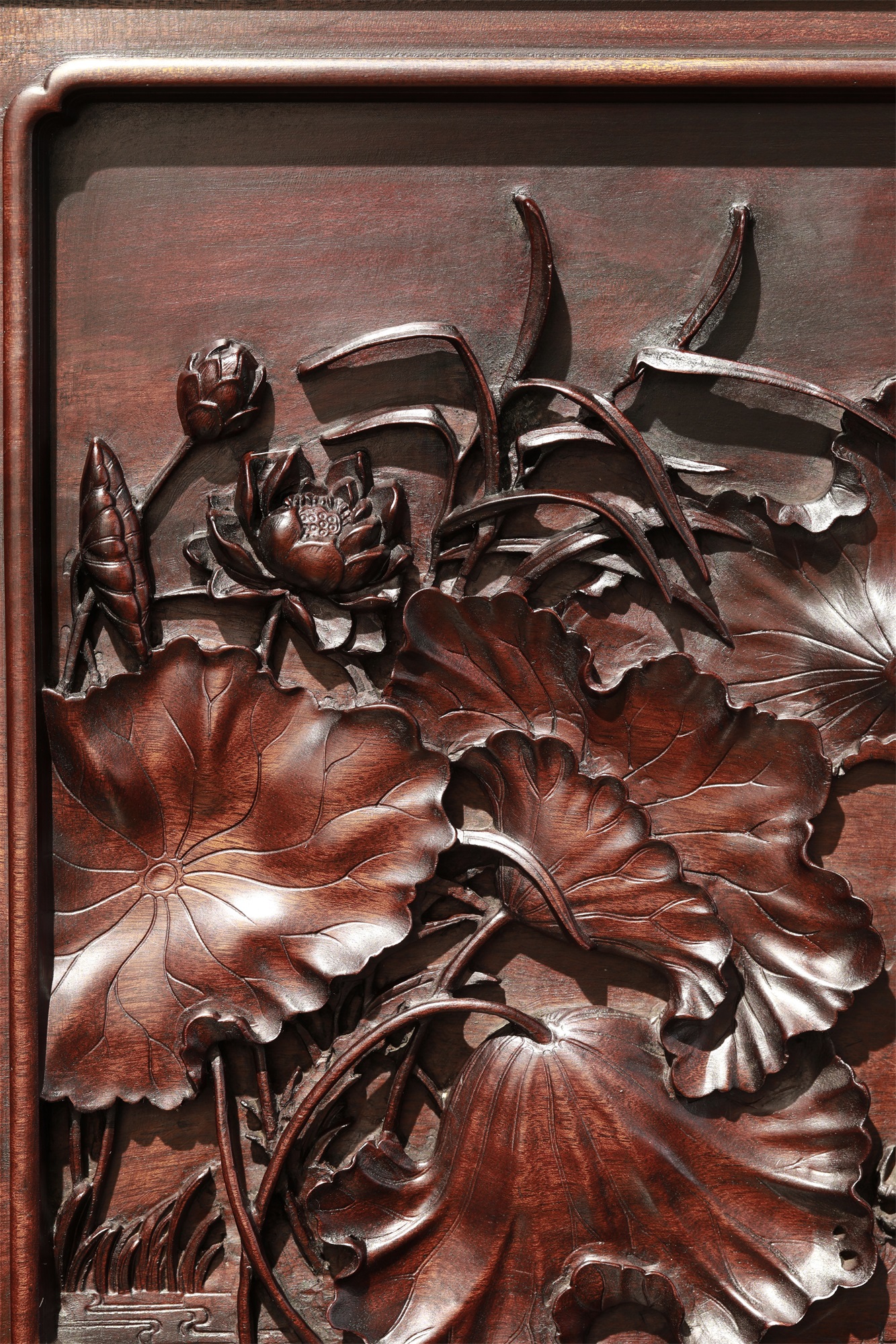 作品采用徽州传统手工艺雕刻而成。方寸间荷花枝干灵动,穿插有致,花与叶的层次、位置、穿插、向背,繁而不乱,显示出高妙的匠意。踞于荷叶间的小螃蟹成为构图的点睛之笔,刻划自然生动细腻,增添了画面的趣味。荷花、螃蟹均为中国传统的吉祥图案。“荷”“和”谐音,赋予荷和气、和平、祥和、和合、和好的美好寓意。也承载了文人墨客的生活情趣和人文情怀。
