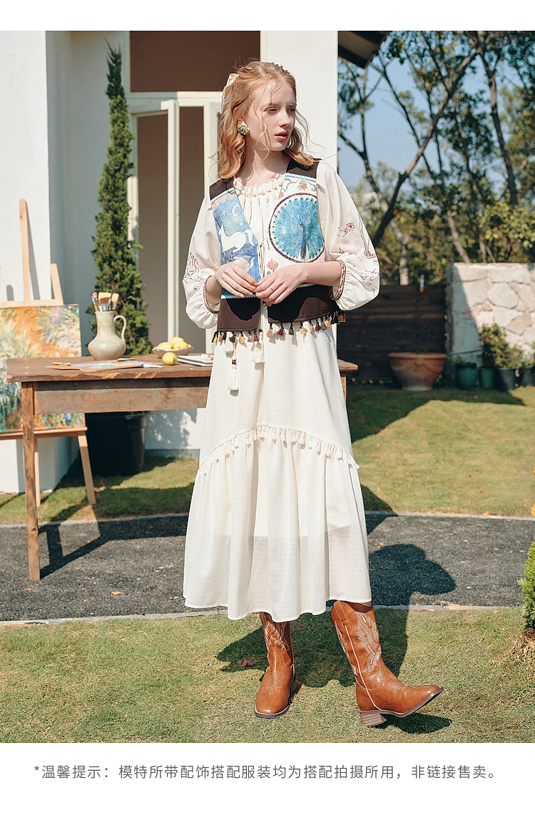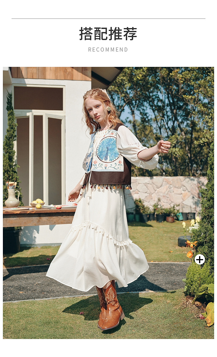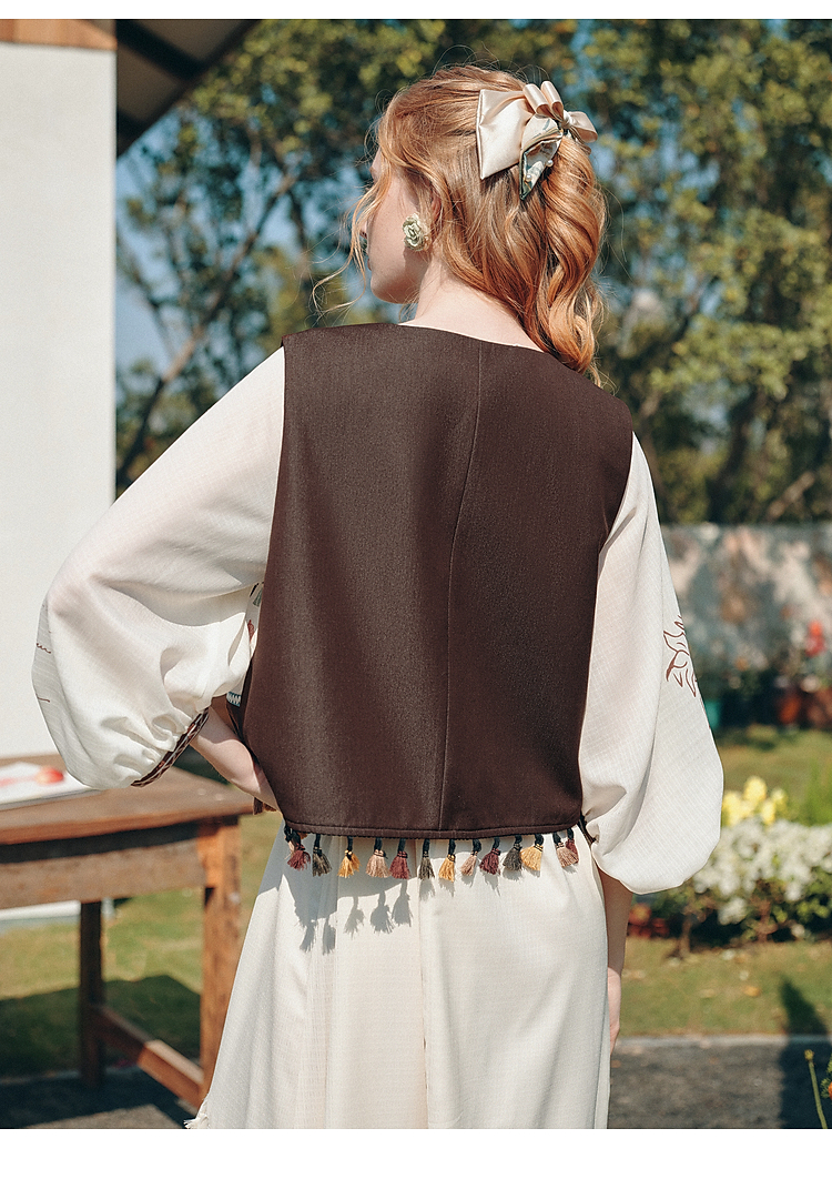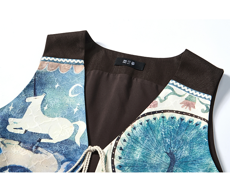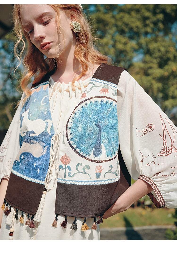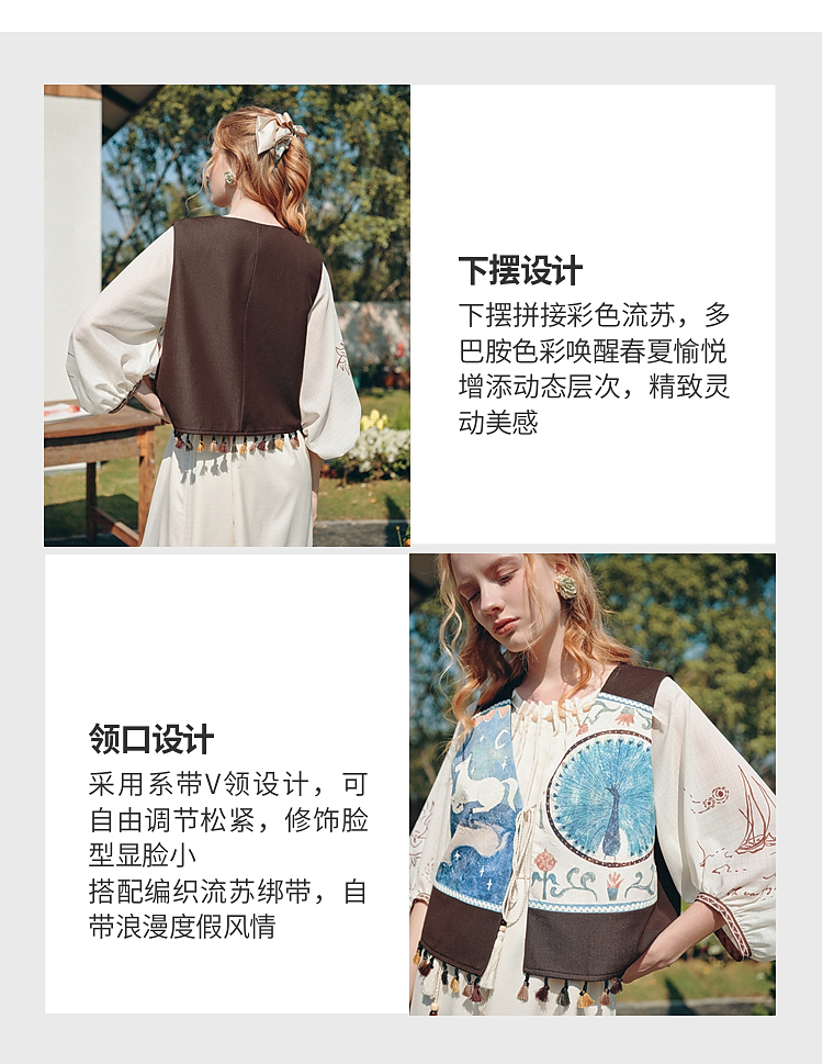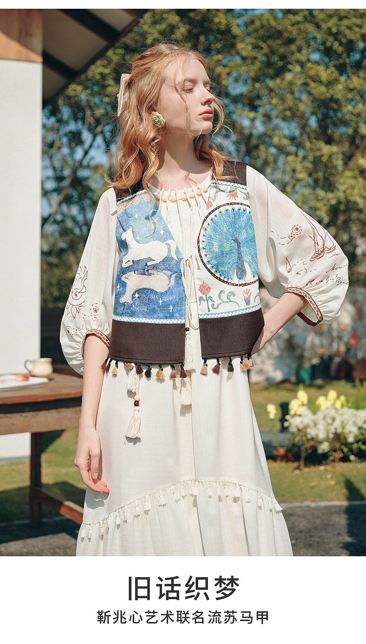 两三事旧话织梦2026夏新款复古流苏下摆绑带印花马甲女宽松马夹女