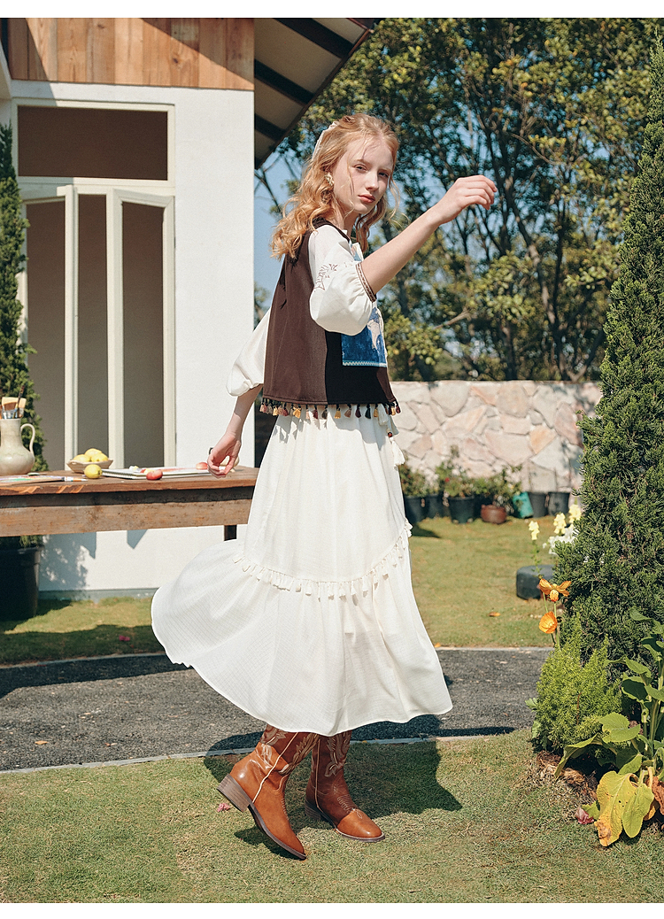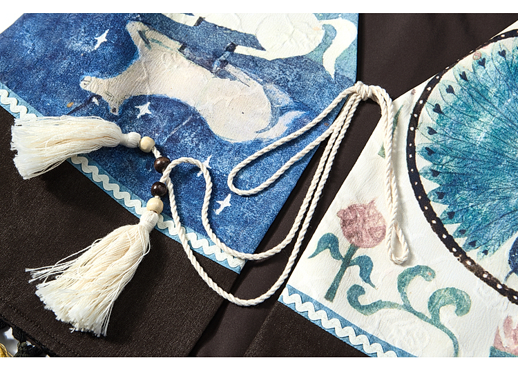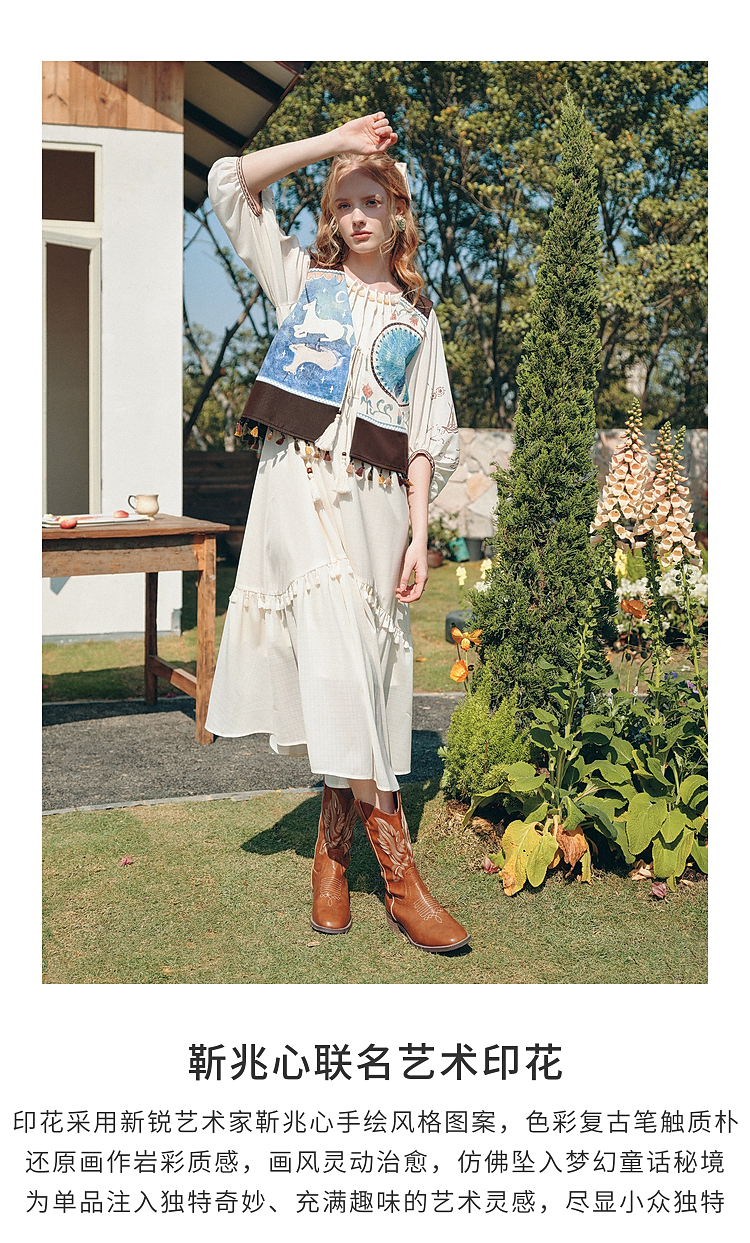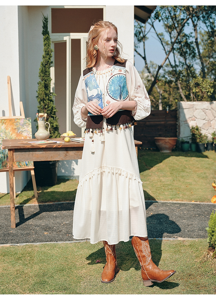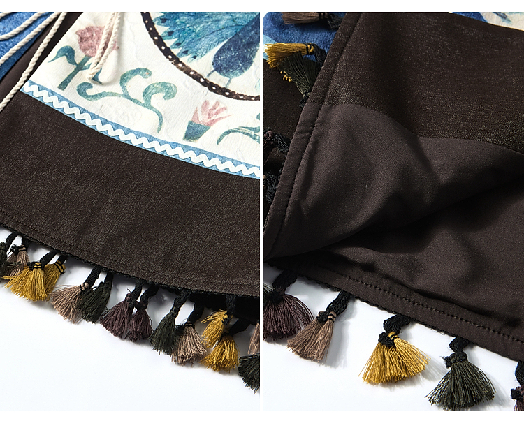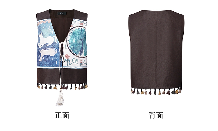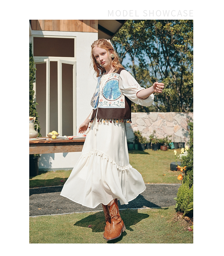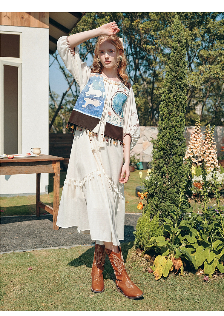 两三事旧话织梦2026夏新款复古流苏下摆绑带印花马甲女宽松马夹女