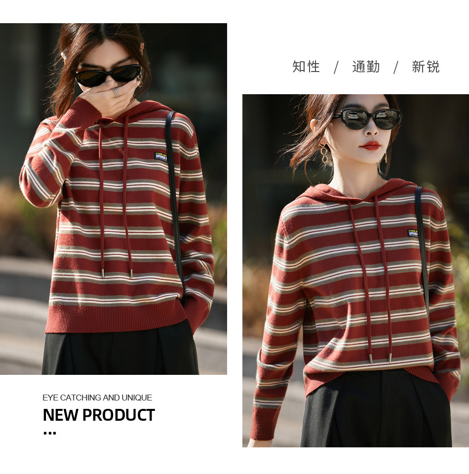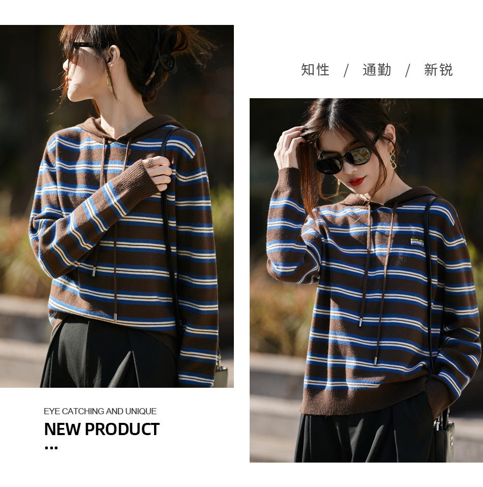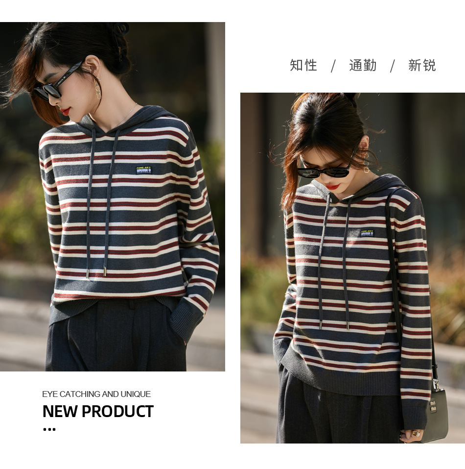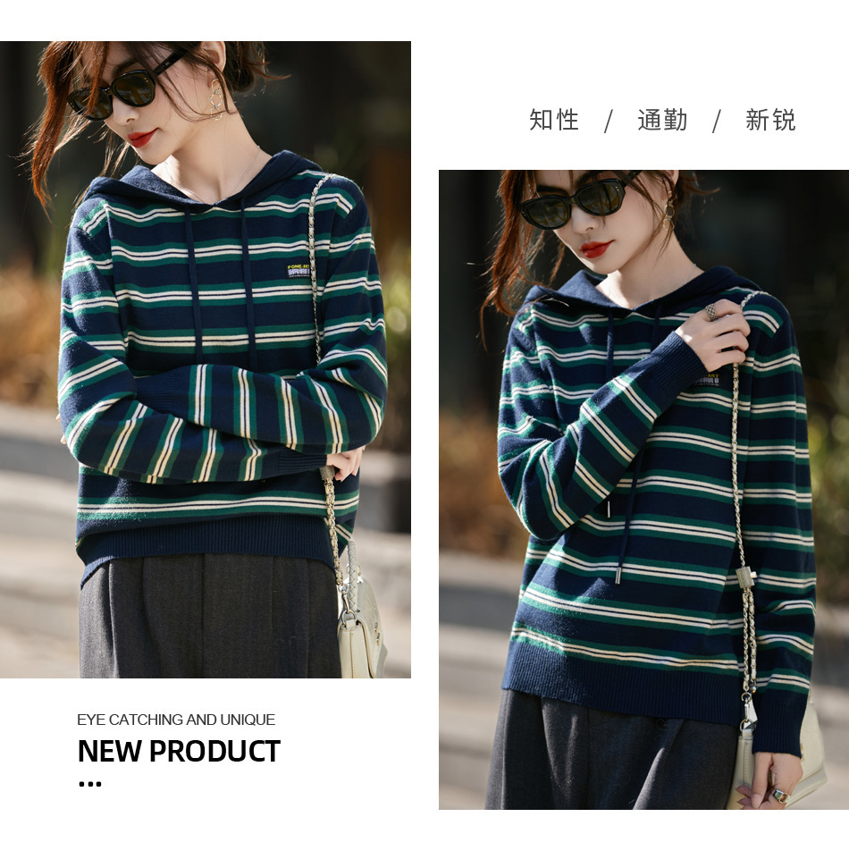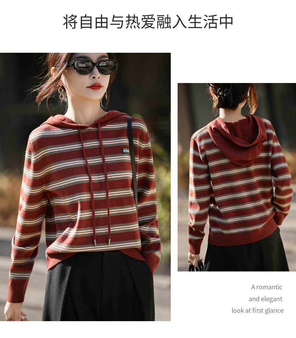 条纹针织衫女内搭外穿都有范 秋冬新款时尚宽松显瘦减龄休闲连帽长袖上衣新款新品女装