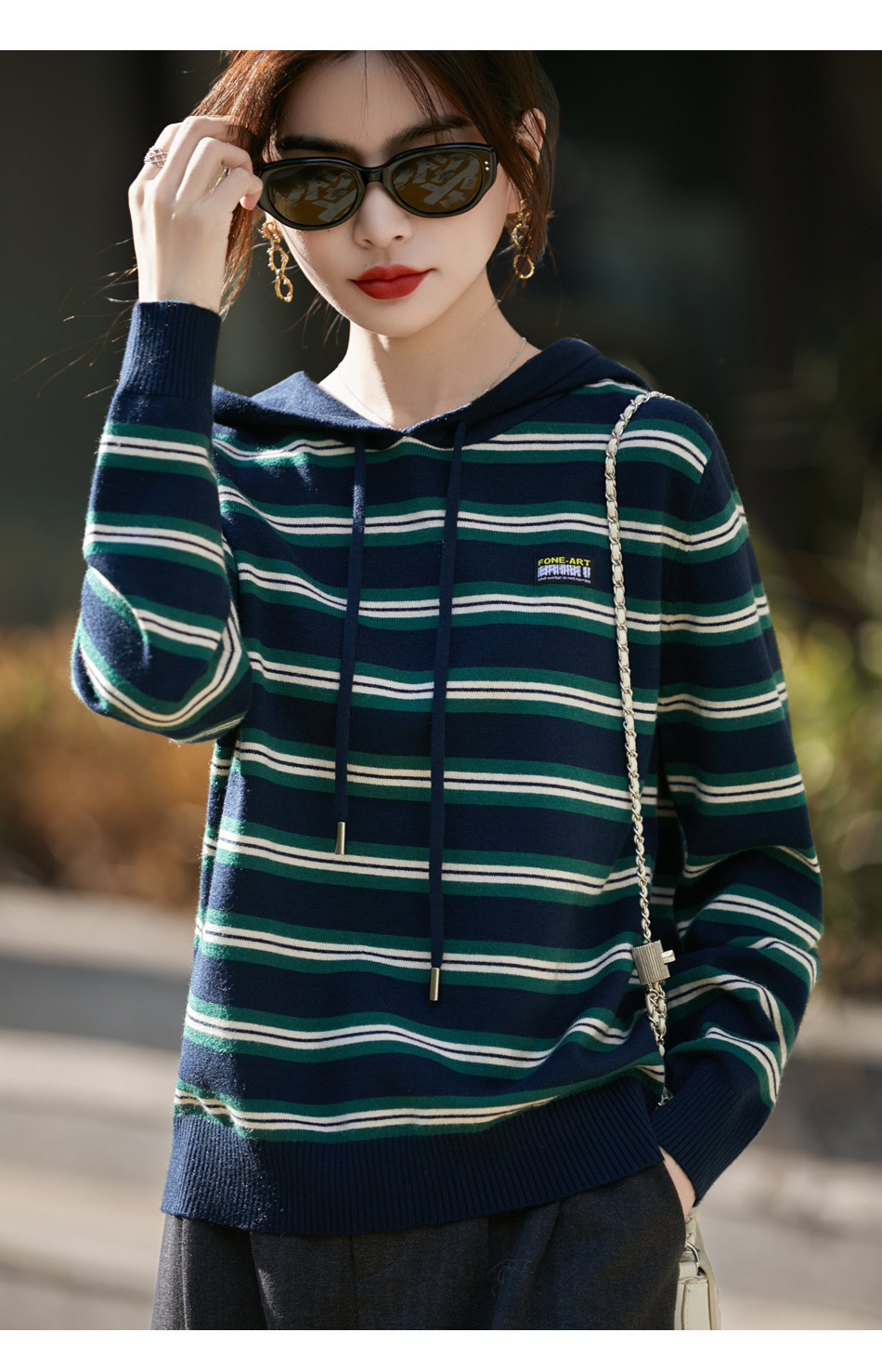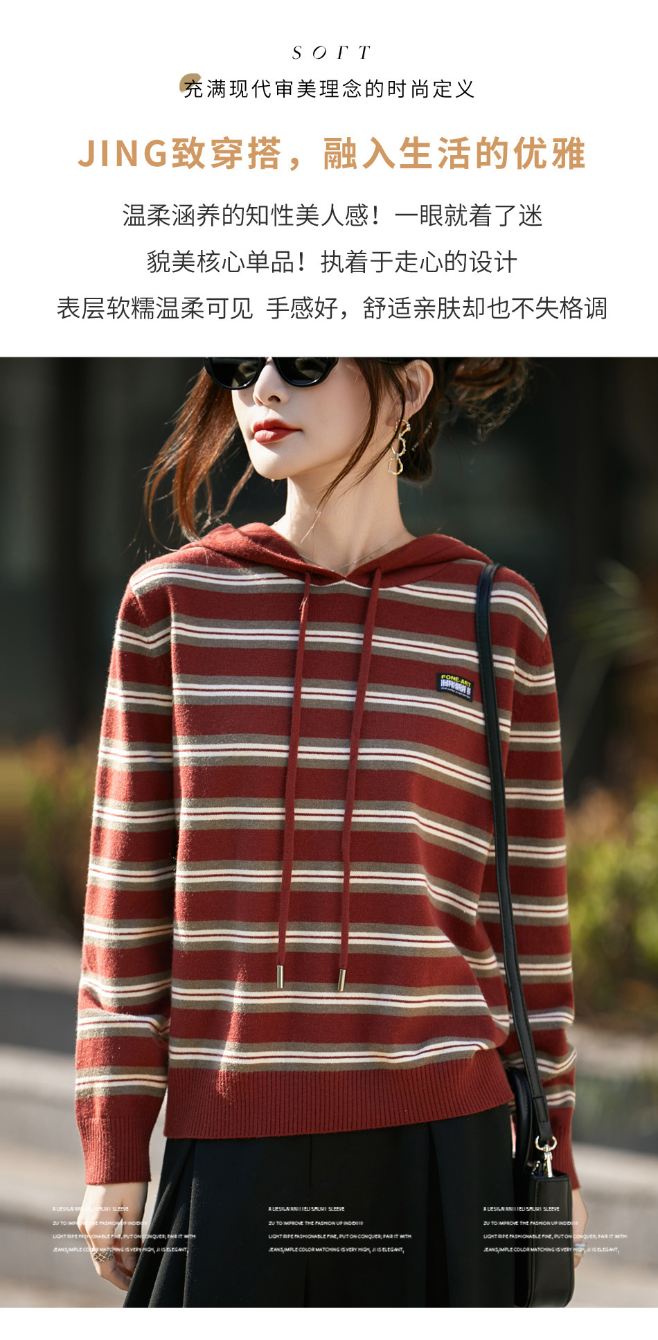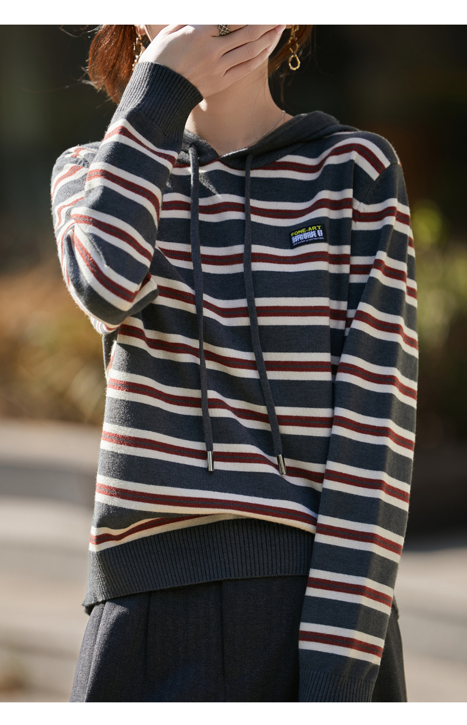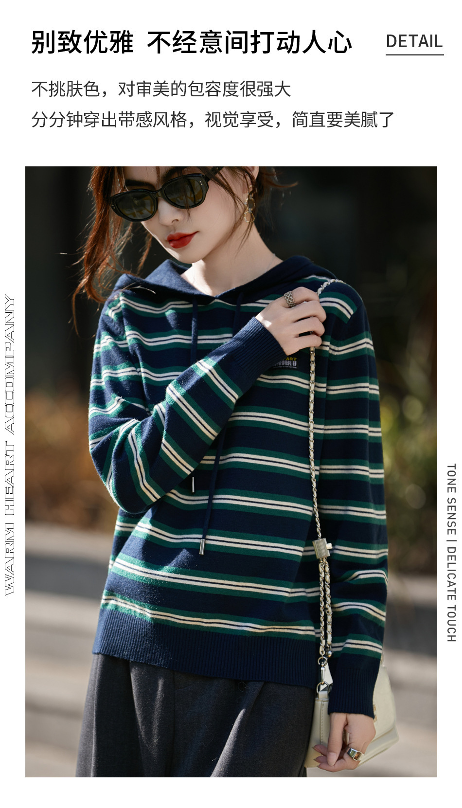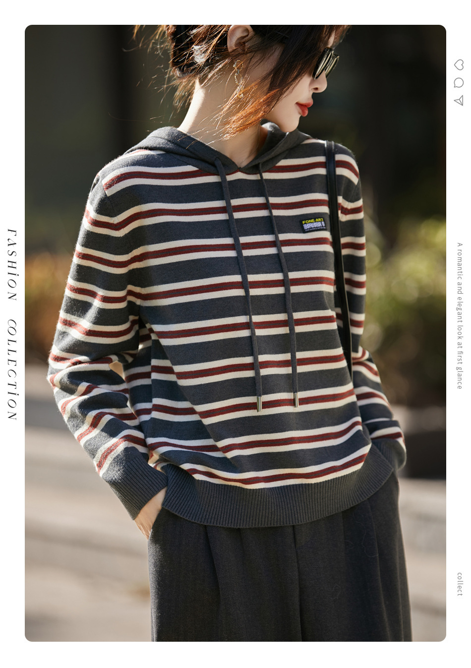 条纹针织衫女内搭外穿都有范 秋冬新款时尚宽松显瘦减龄休闲连帽长袖上衣新款新品女装