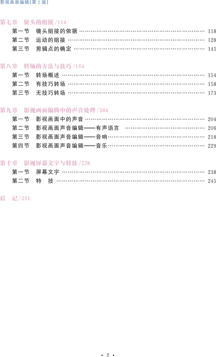 《影视画面编辑》(第2版)结合画面编辑流程的各个环节,以画面编辑的理论阐释和技能方法指导为宗旨,围绕蒙太奇思维、编辑的类型方式、时空结构与节奏、画面组接的基本原则与技巧、时空转场、声音剪辑与画面文字编辑等方面展开编写。教材理论与实践相结合,突出理论对编辑实践的指导性,定位于相关非线性软件编辑课程的指导性教材,因此,可以说本书是力求作为画面编辑实践的方法论而撰写的。
