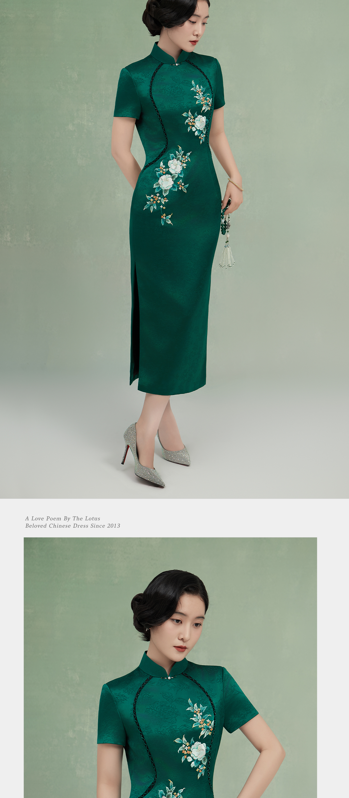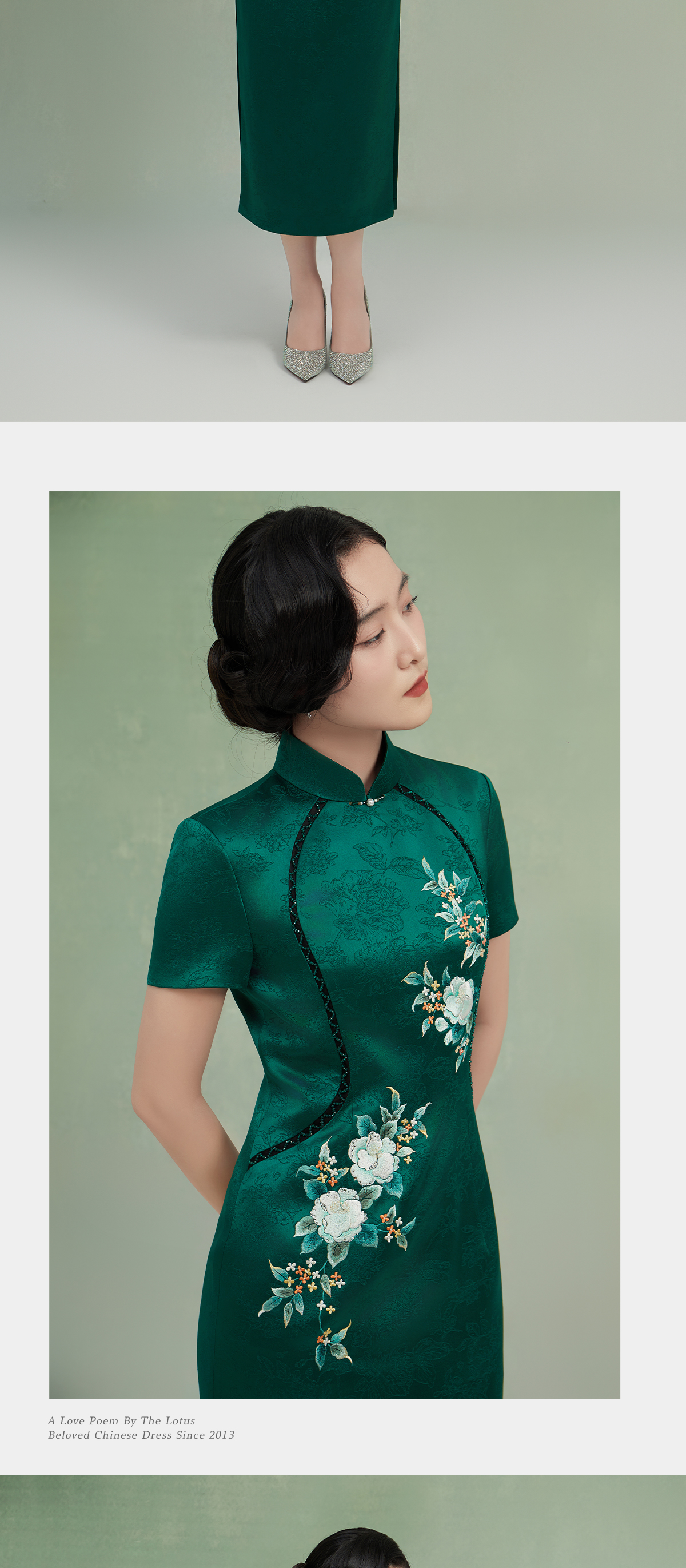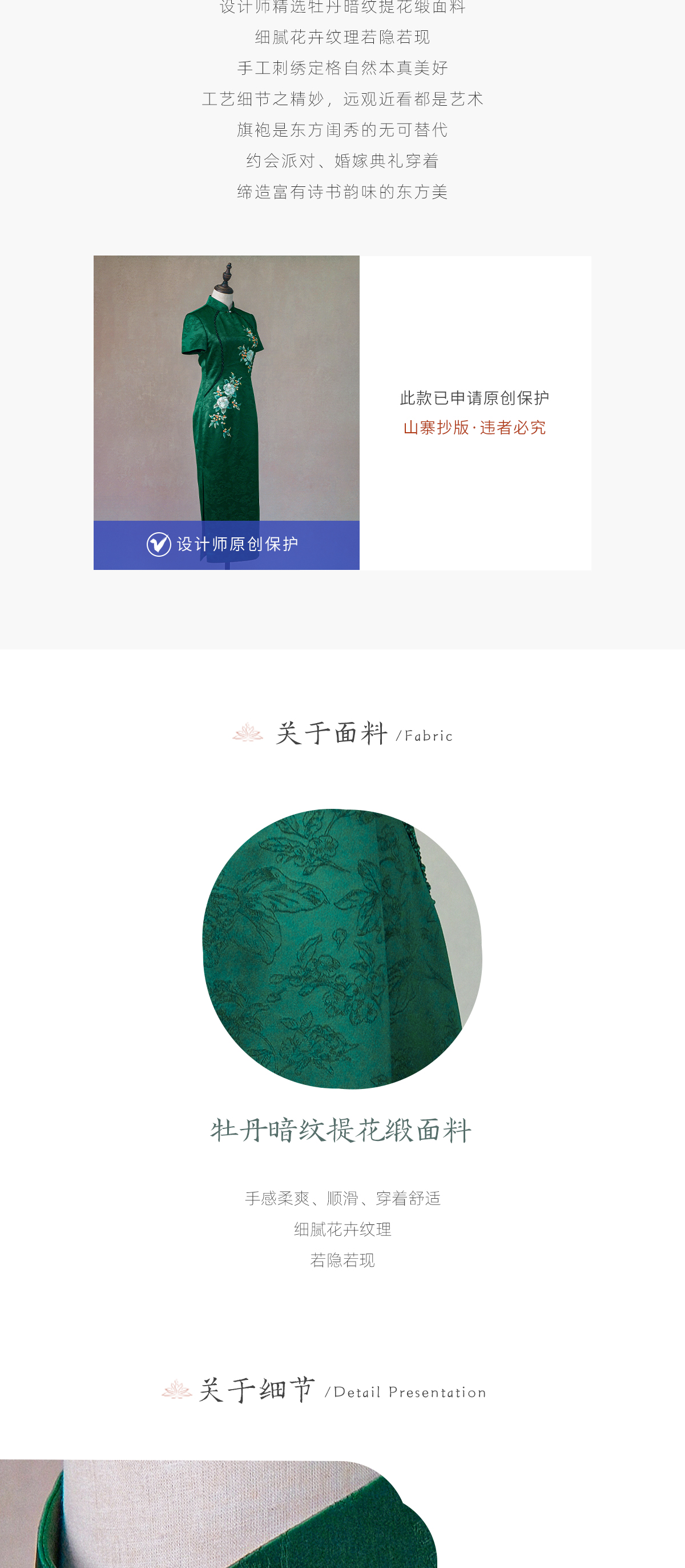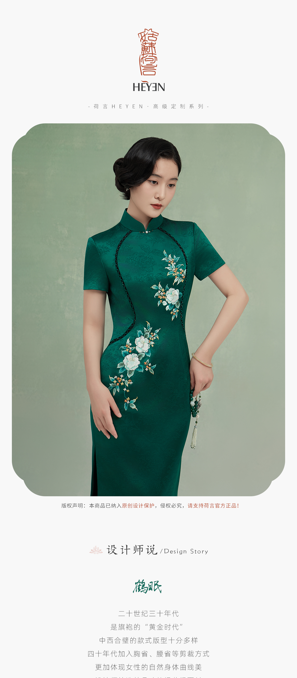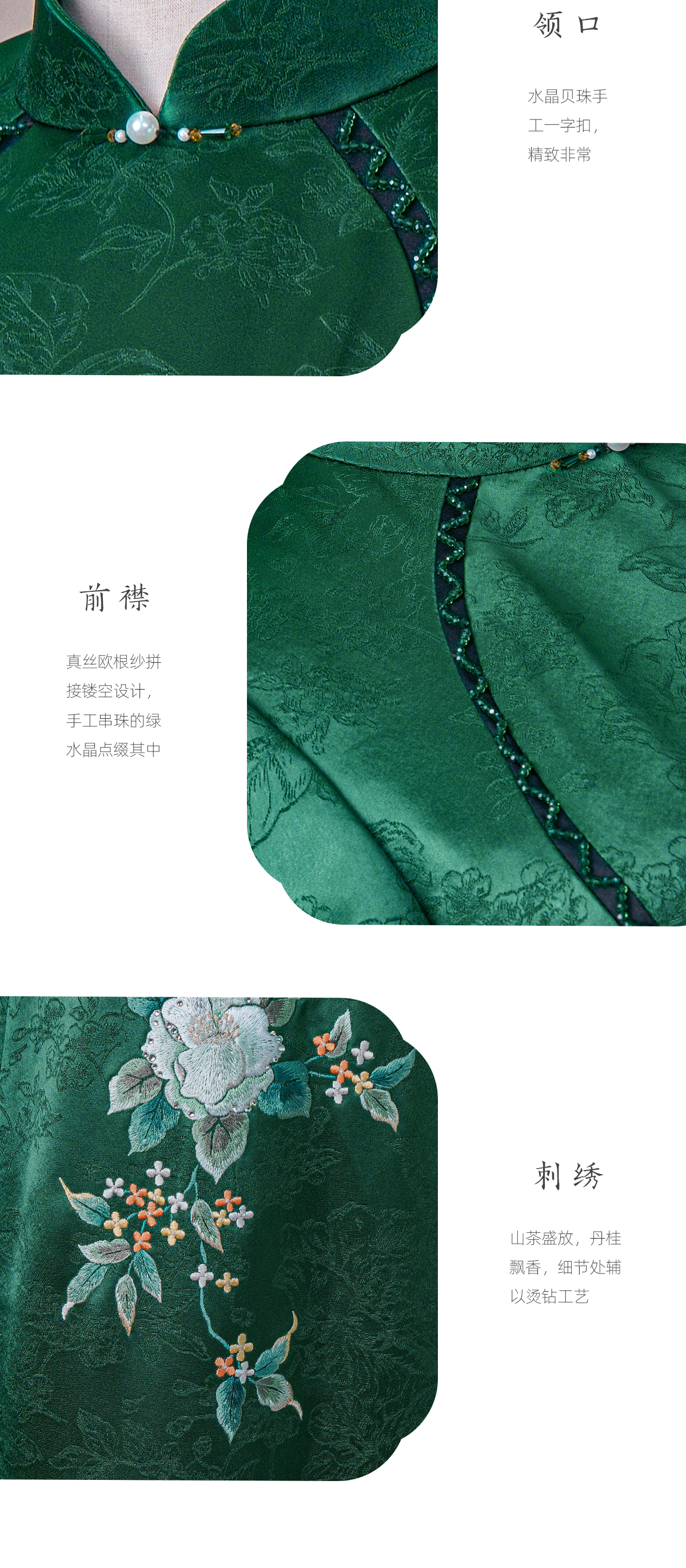 荷言HEYEN 鹤眠 牡丹暗纹提花缎山茶花手工刺绣旗袍 拼接真丝欧根纱绿水晶高级定制