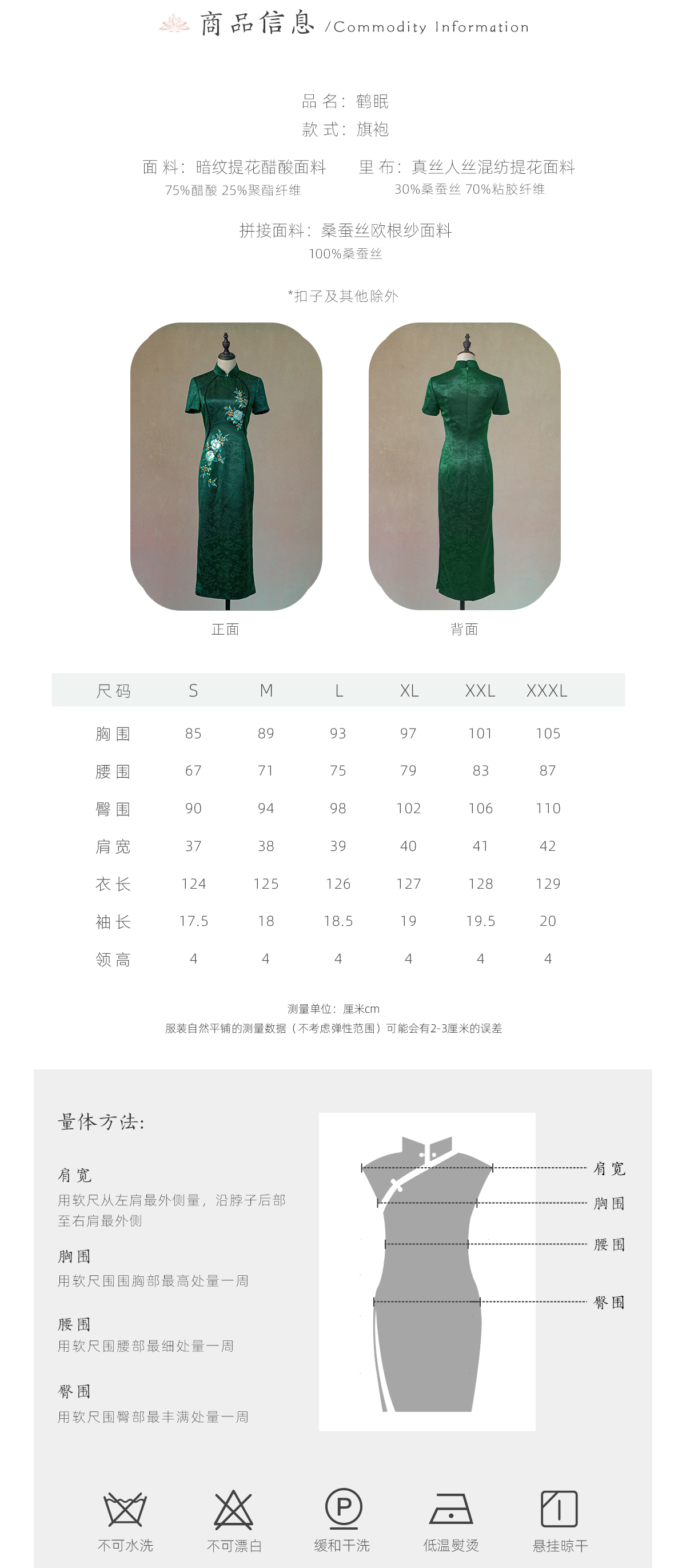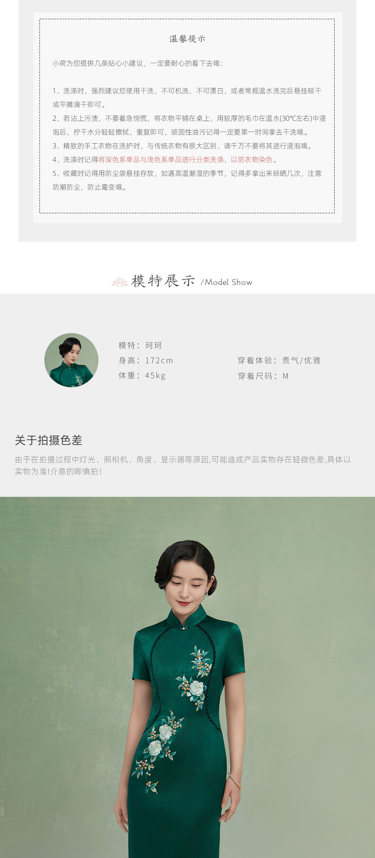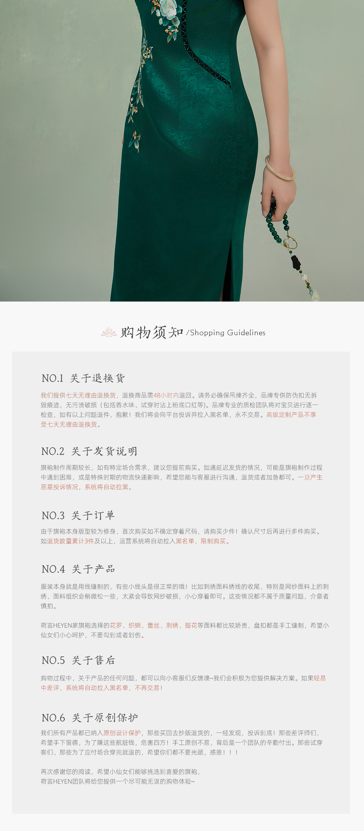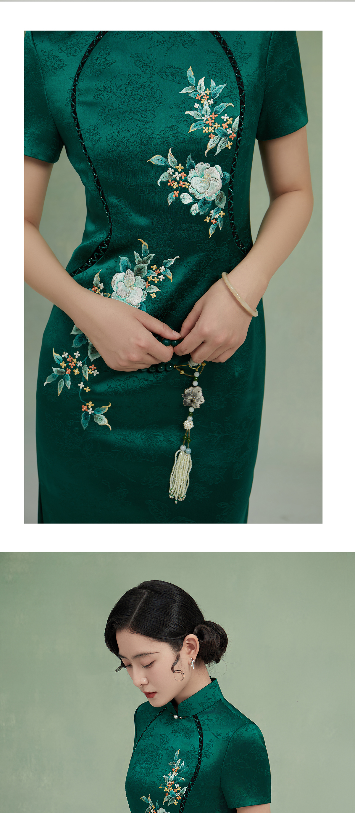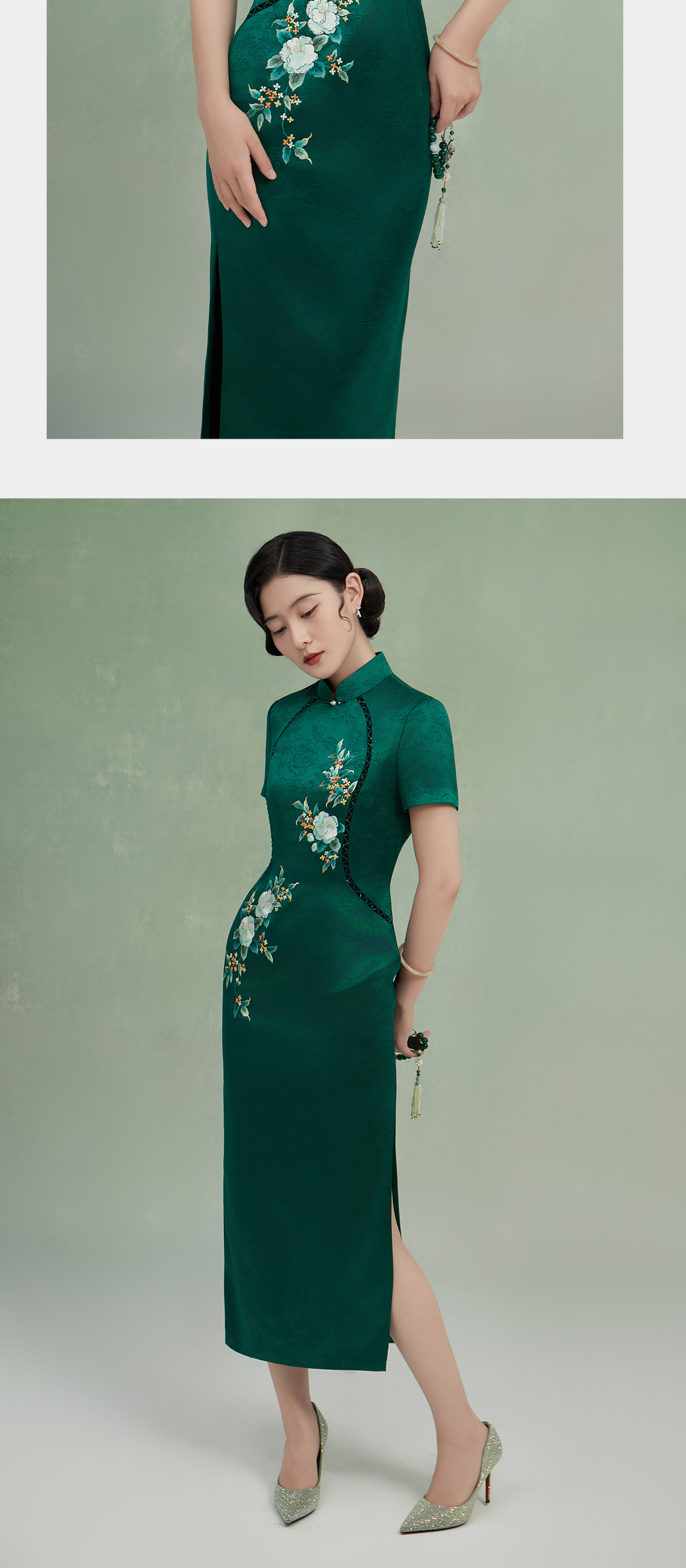 荷言HEYEN 鹤眠 牡丹暗纹提花缎山茶花手工刺绣旗袍 拼接真丝欧根纱绿水晶高级定制