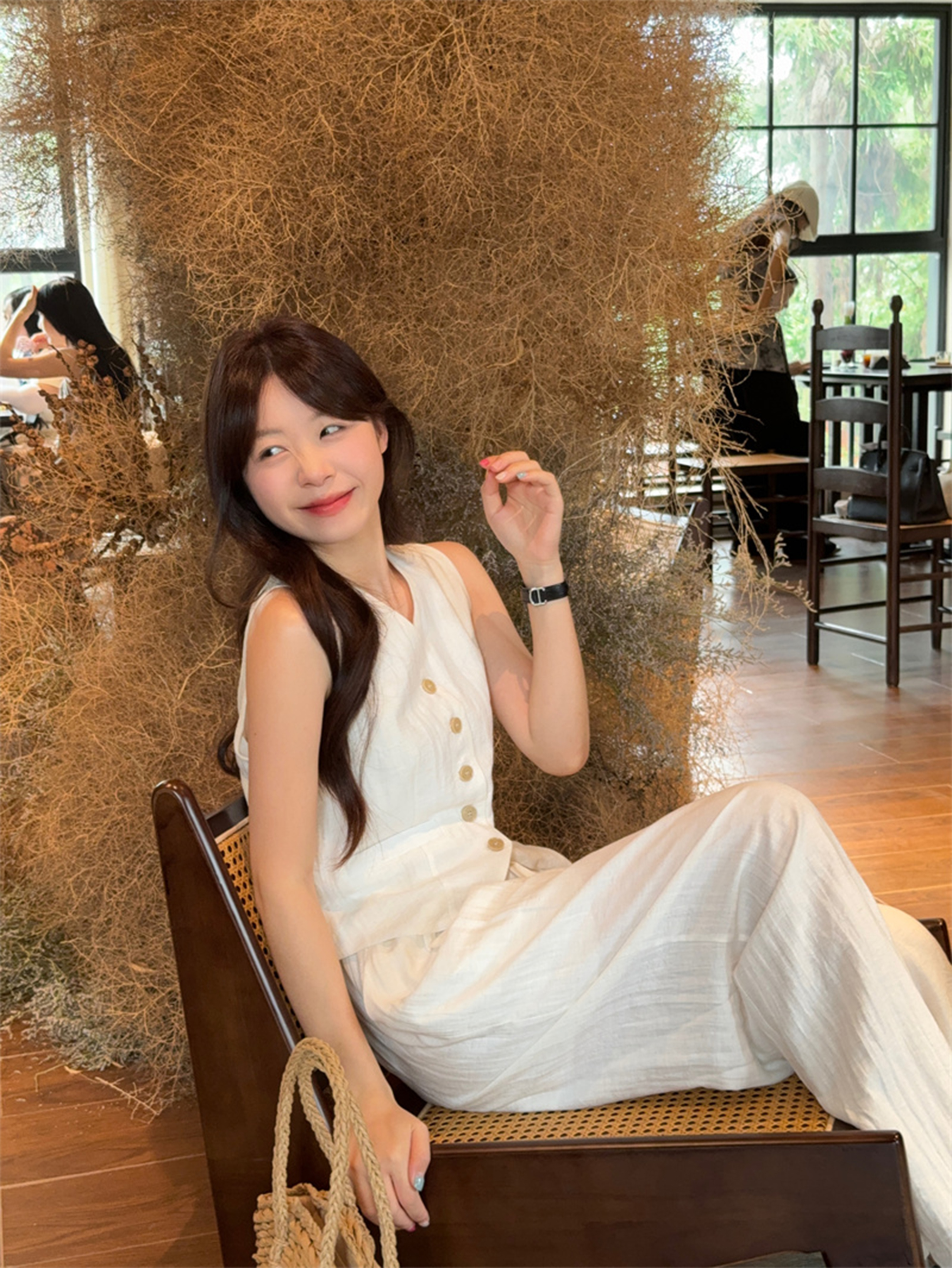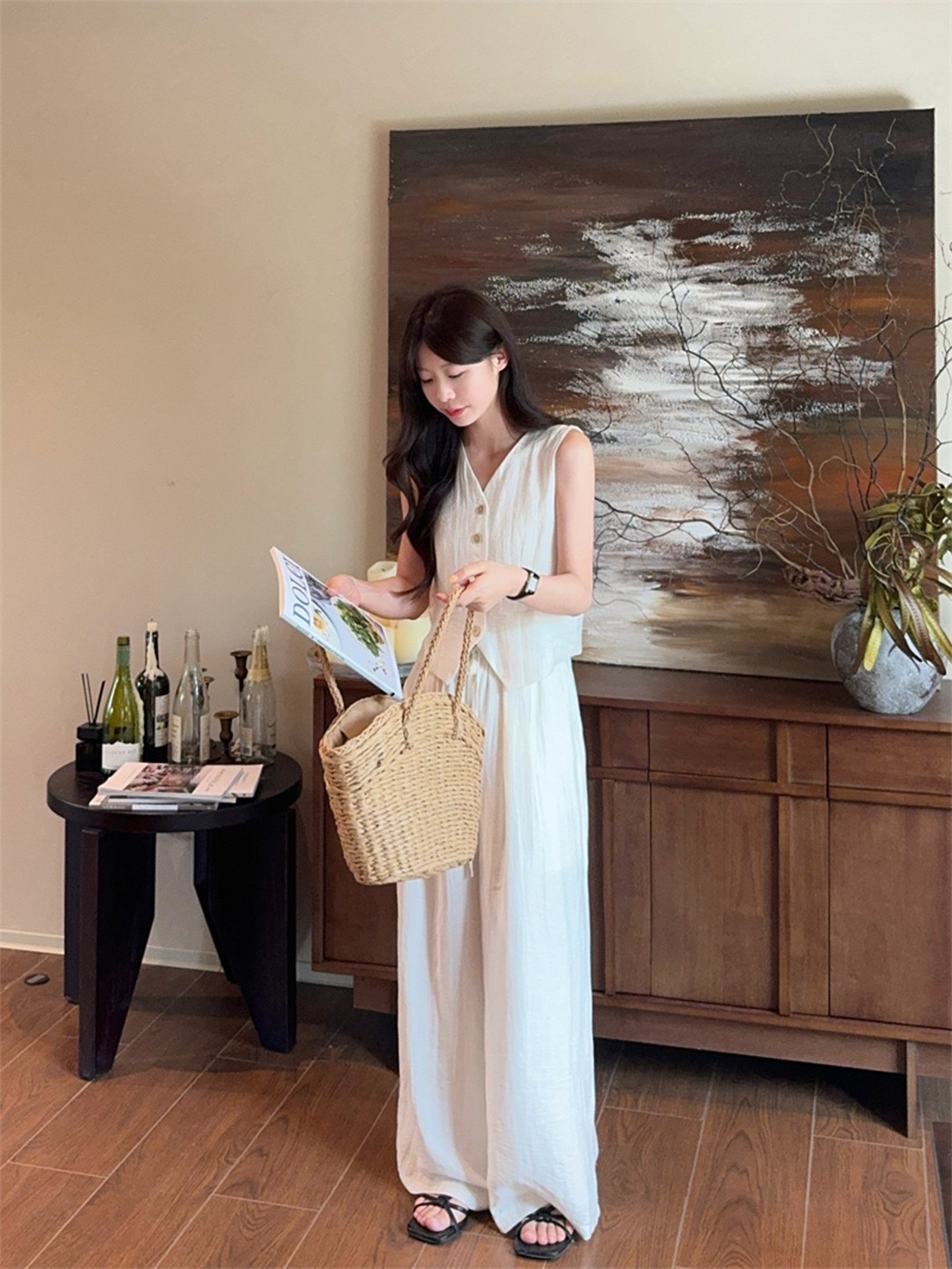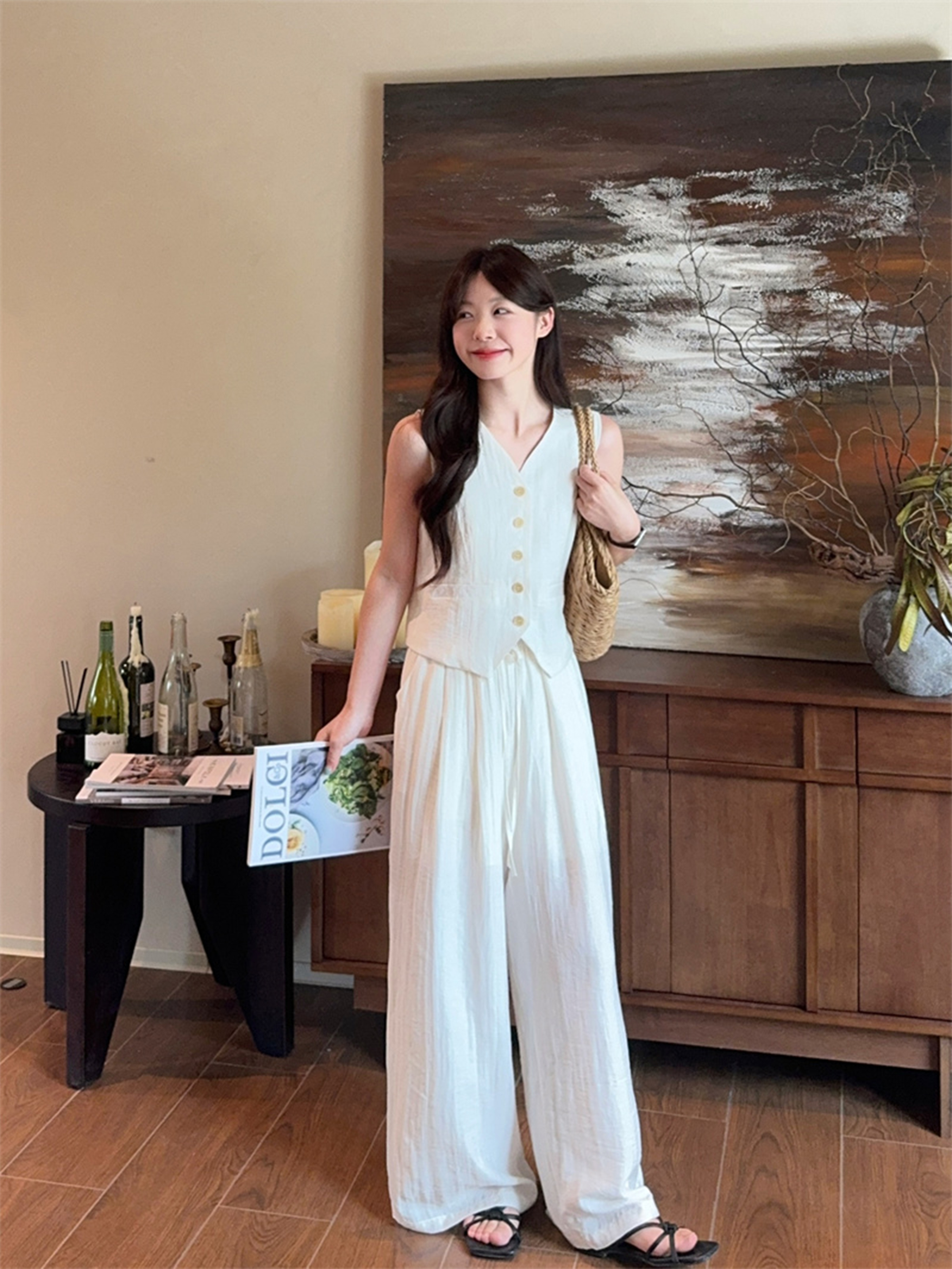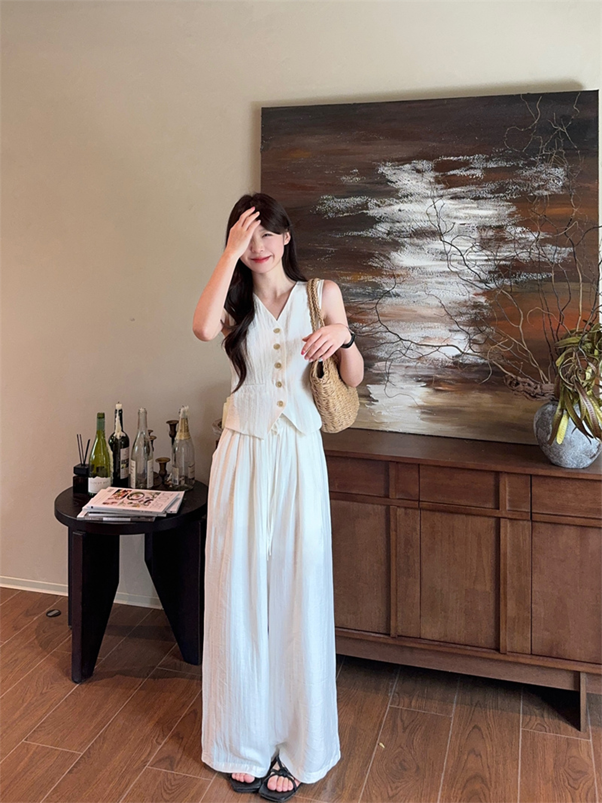 西遇法式气质套装女春夏新款V领无袖背心宽松阔腿裤两件套SS150320