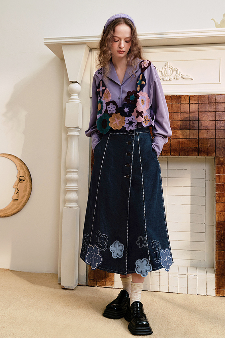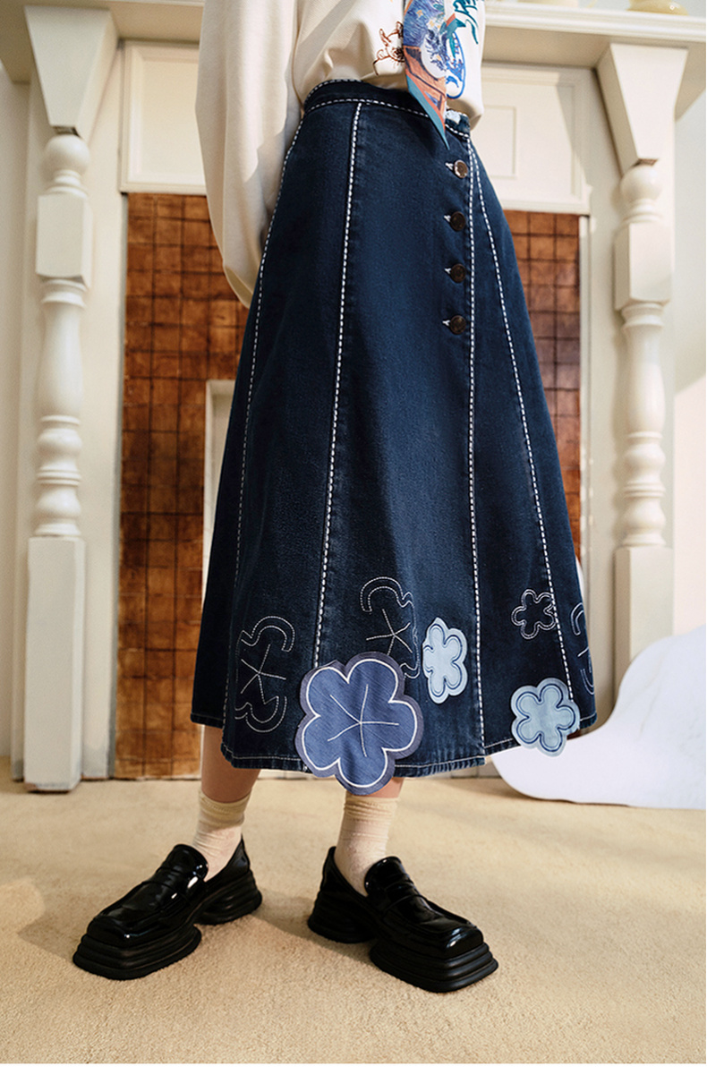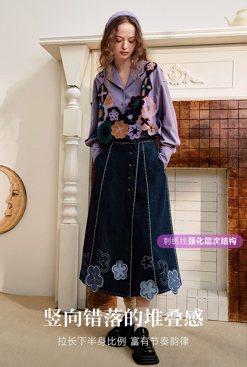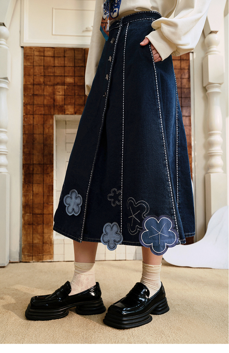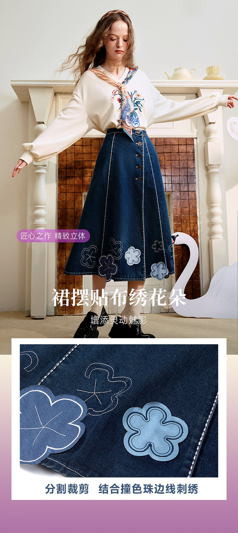 【38女王节】两三事 荆棘之舞 2024秋季新款时尚花朵贴布绣明线装饰牛仔半身裙