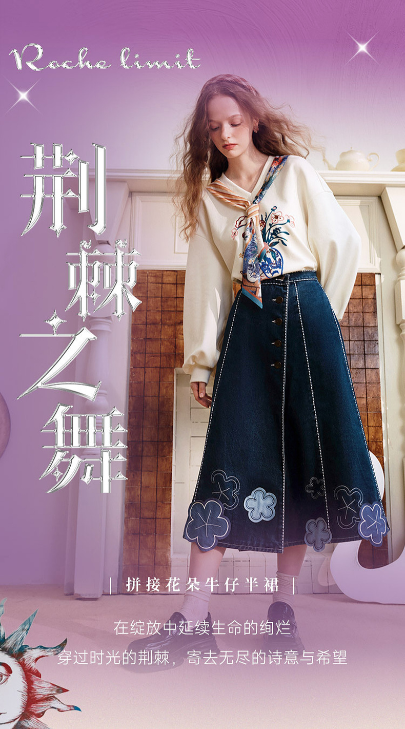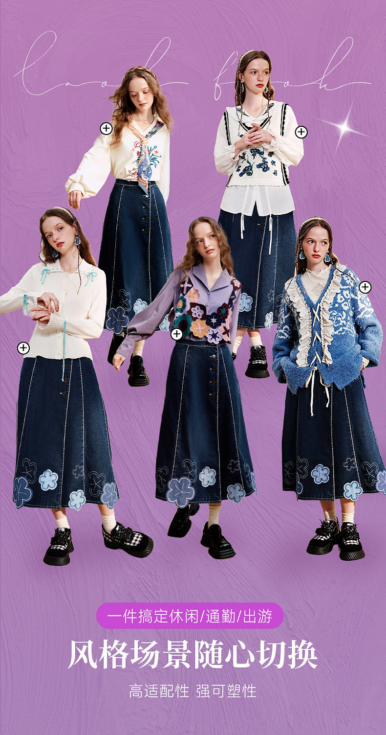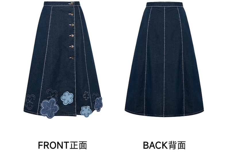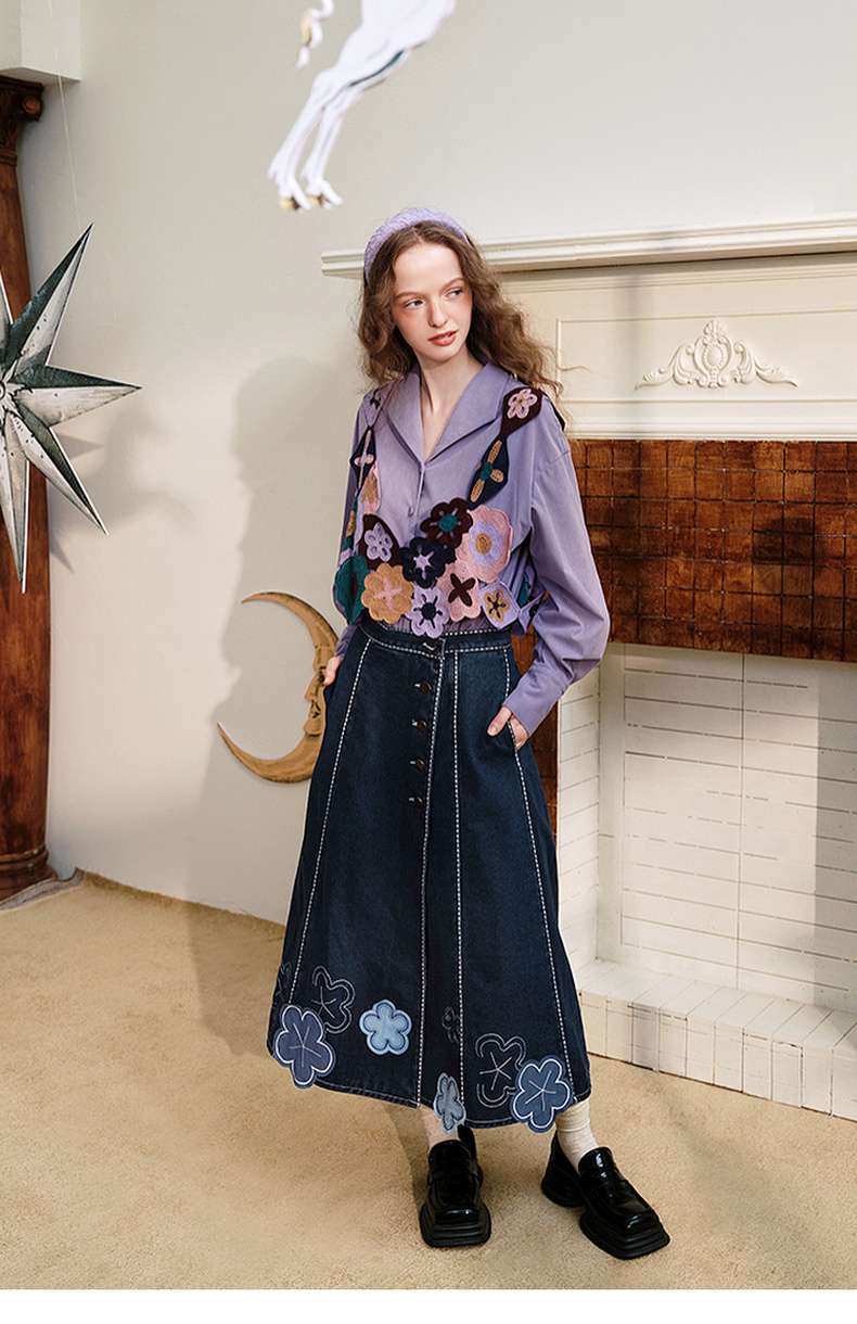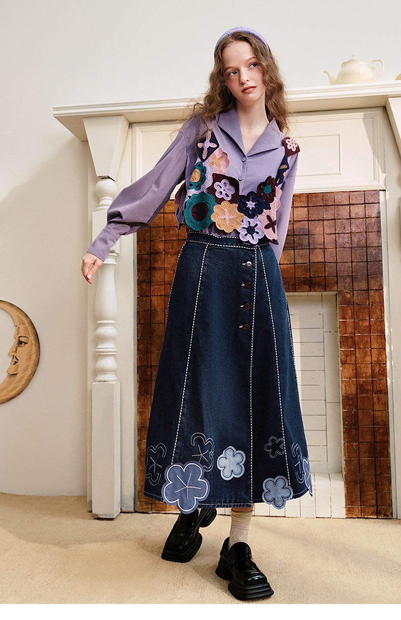 【38女王节】两三事 荆棘之舞 2024秋季新款时尚花朵贴布绣明线装饰牛仔半身裙