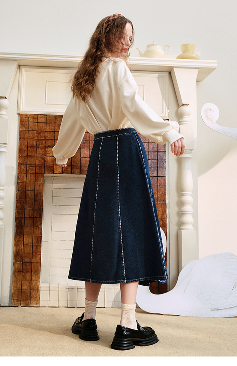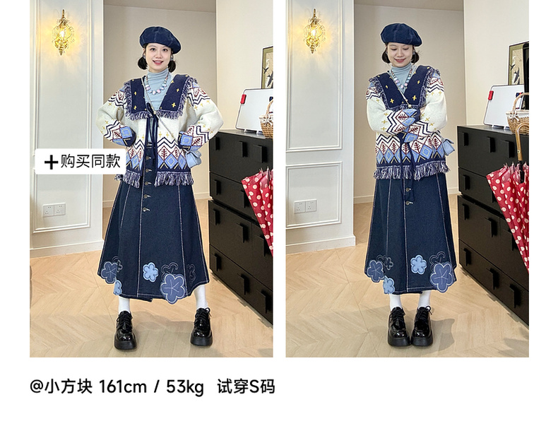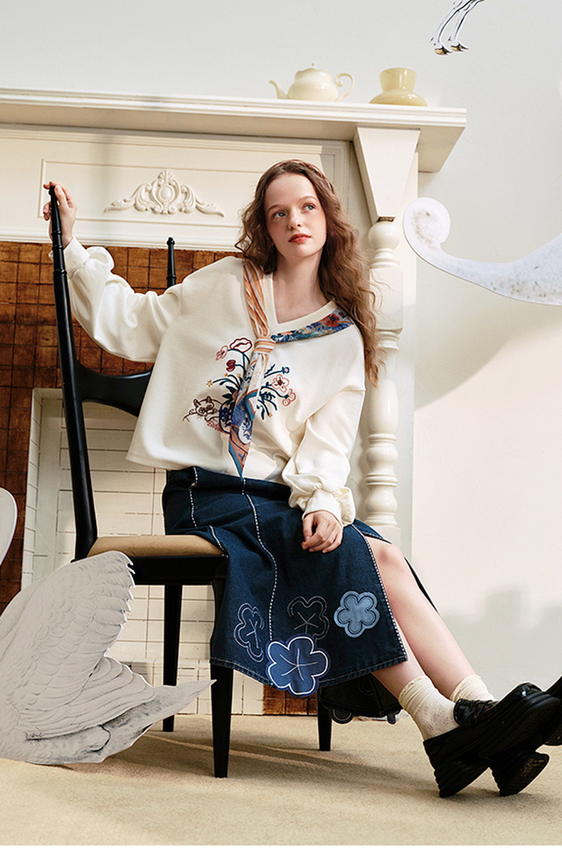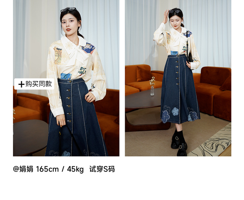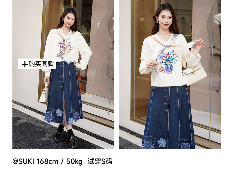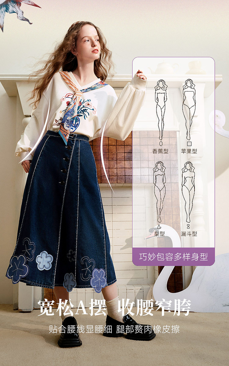 【38女王节】两三事 荆棘之舞 2024秋季新款时尚花朵贴布绣明线装饰牛仔半身裙