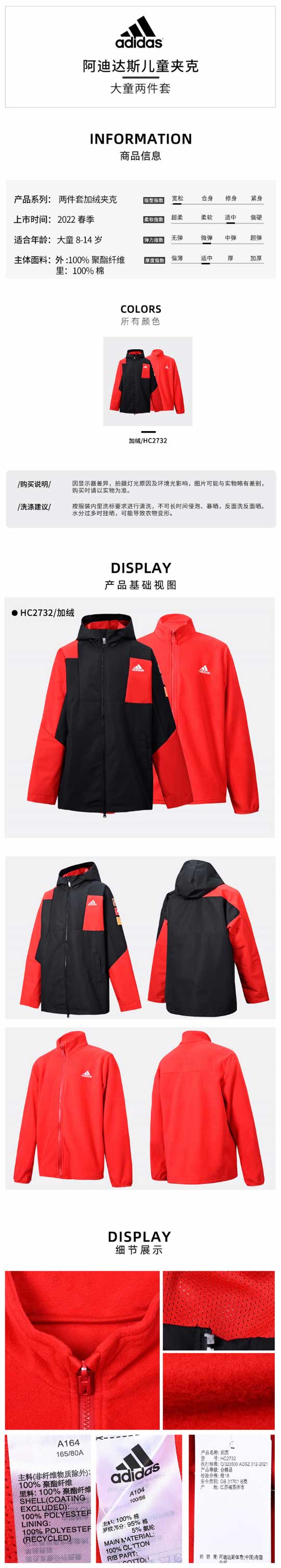 小阿迪2022春季新款男大童运动二合一夹克外套HC2732