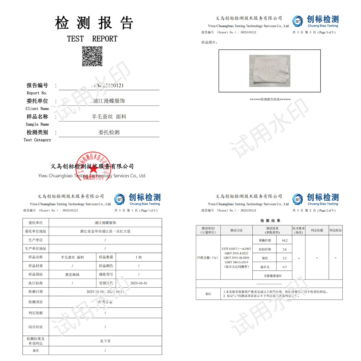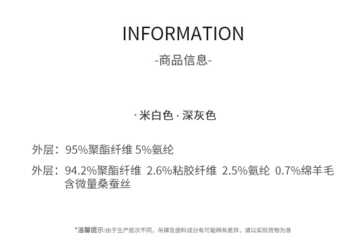 材质:聚酯纤维94.2,粘胶纤维2.6,氨纶2.5,绵羊毛0.7;含微量桑蚕丝