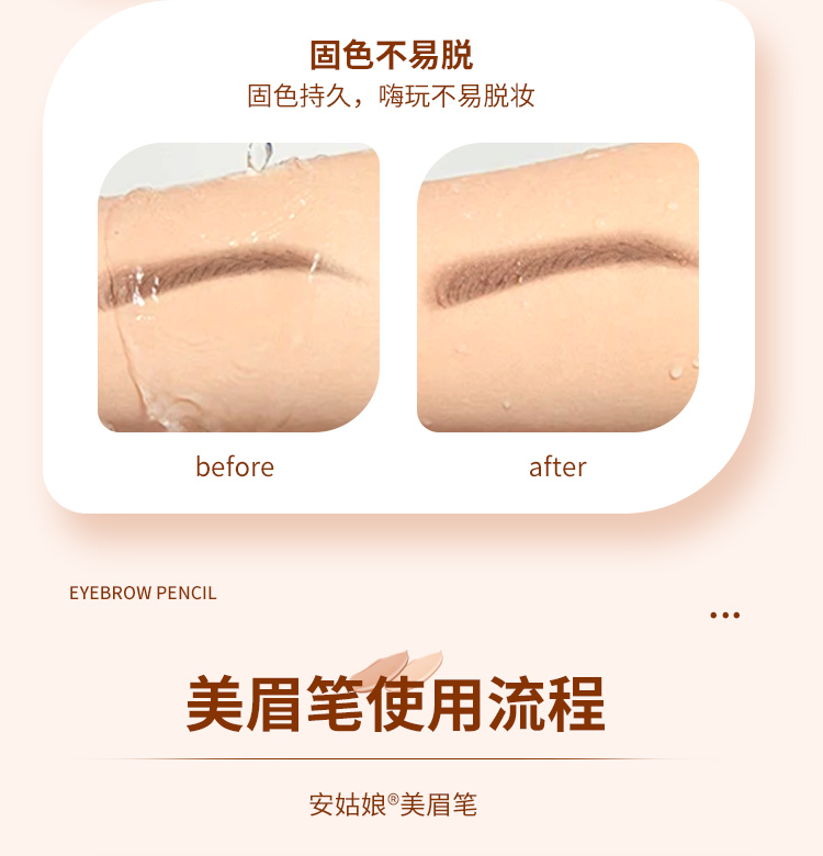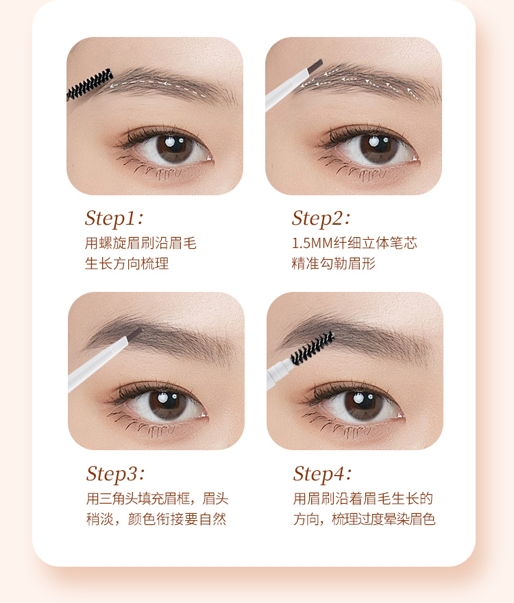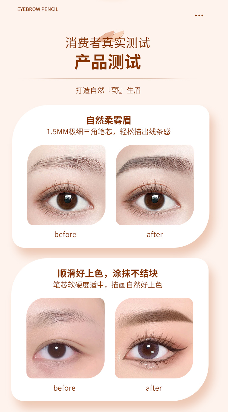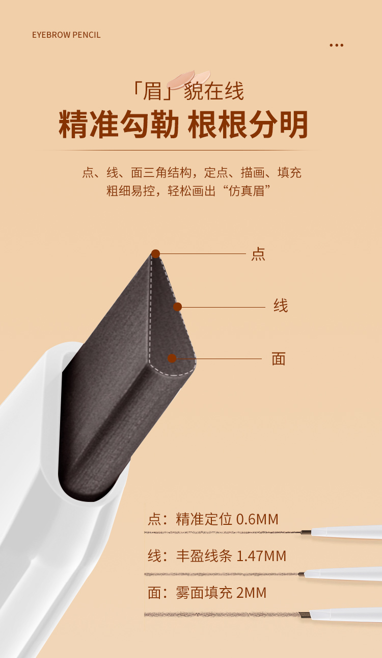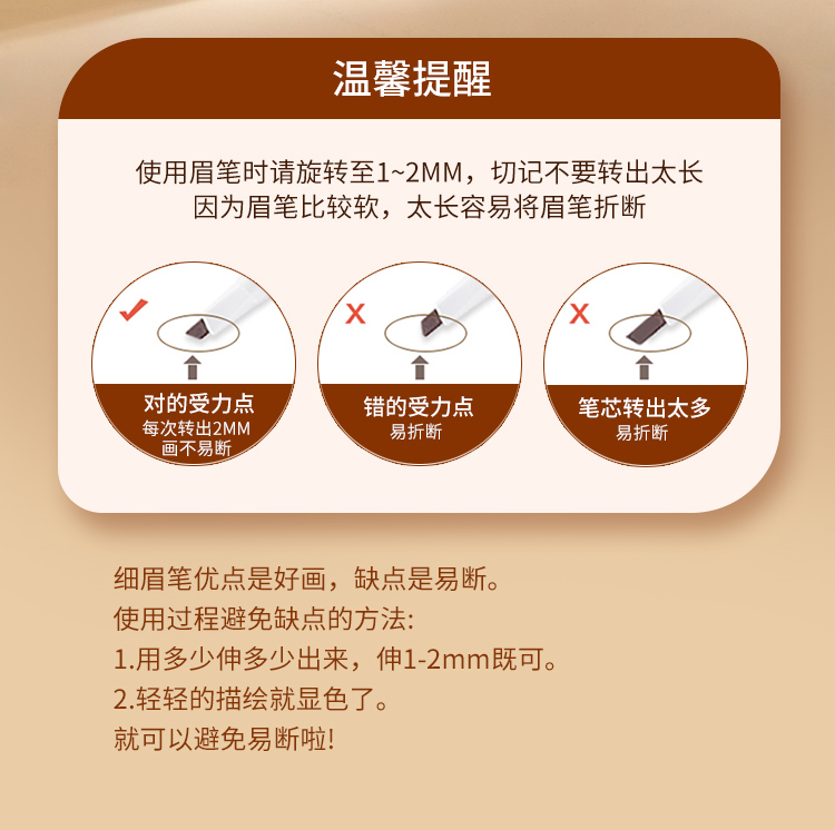 注意小贴士: 色号标签在包装盒的顶部,如果要扔掉包装盒,可以把盒子上的色号标签撕下来 贴在笔管上,方便区分色号。 细眉笔优点是好画,缺点是易断。 使用过程避免缺点的方法: 1.用多少伸多少出来,伸1-2mm既可。 2.轻轻的描绘就显色了。 就可以避免易断啦!