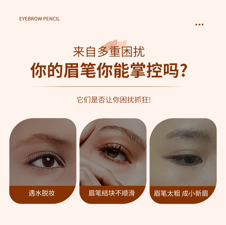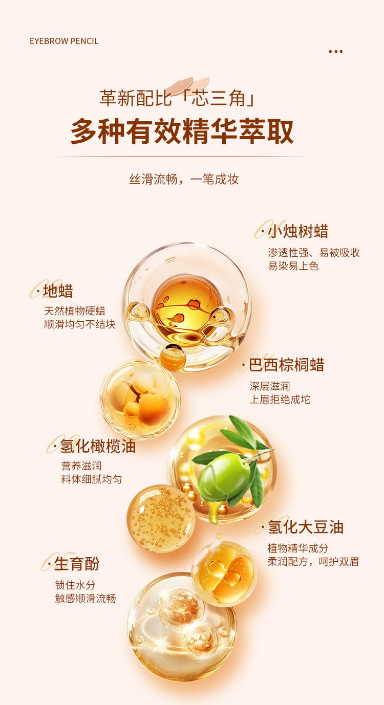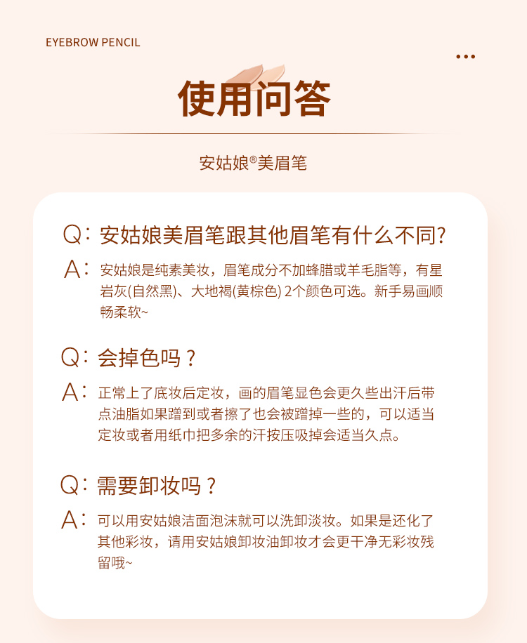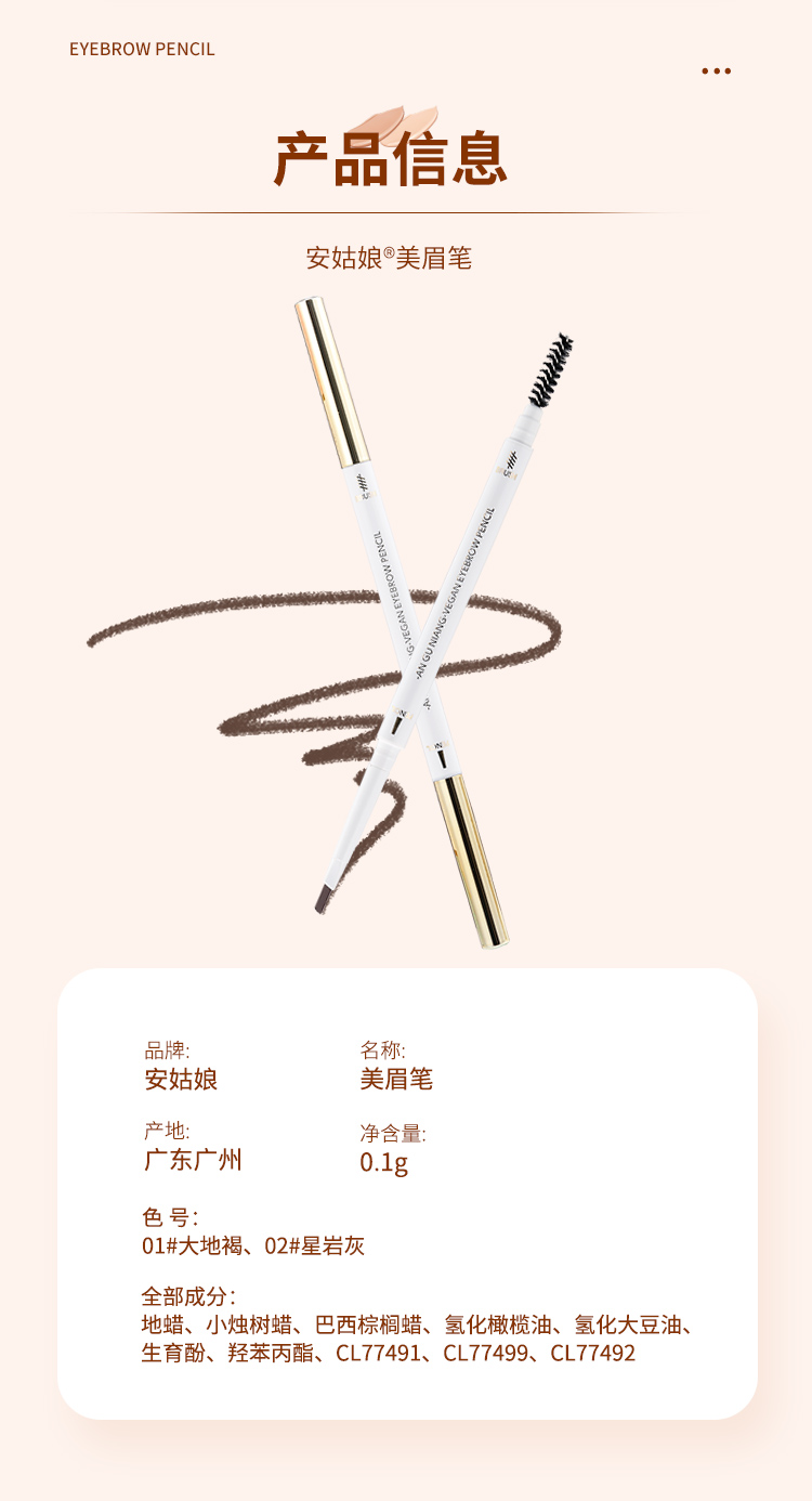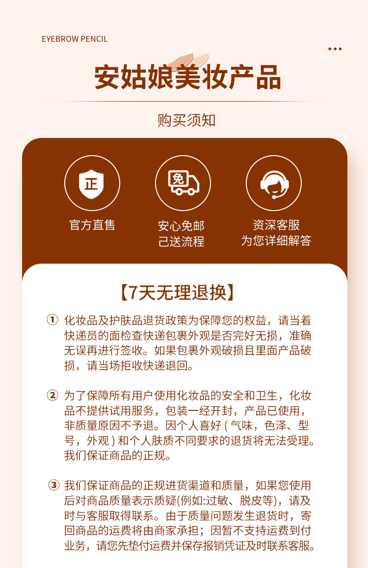 注意小贴士: 色号标签在包装盒的顶部,如果要扔掉包装盒,可以把盒子上的色号标签撕下来 贴在笔管上,方便区分色号。 细眉笔优点是好画,缺点是易断。 使用过程避免缺点的方法: 1.用多少伸多少出来,伸1-2mm既可。 2.轻轻的描绘就显色了。 就可以避免易断啦!