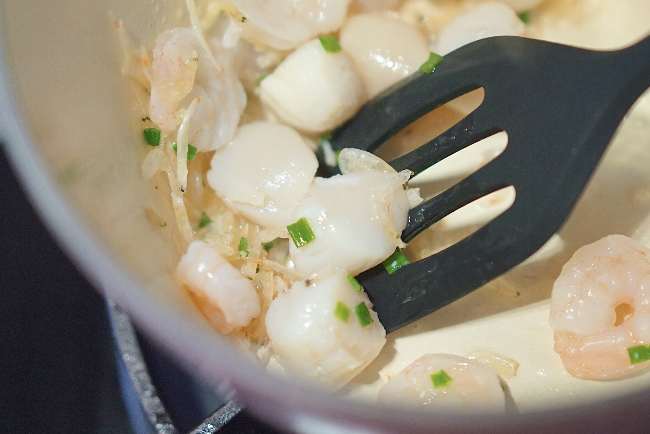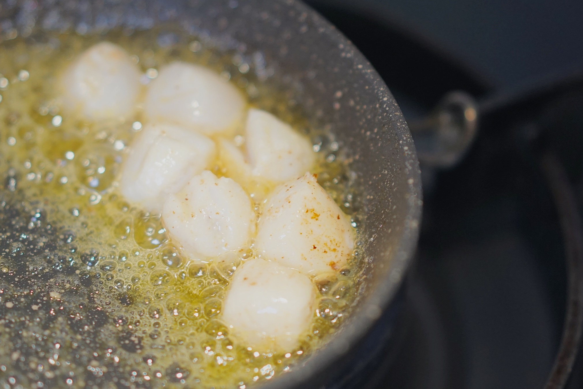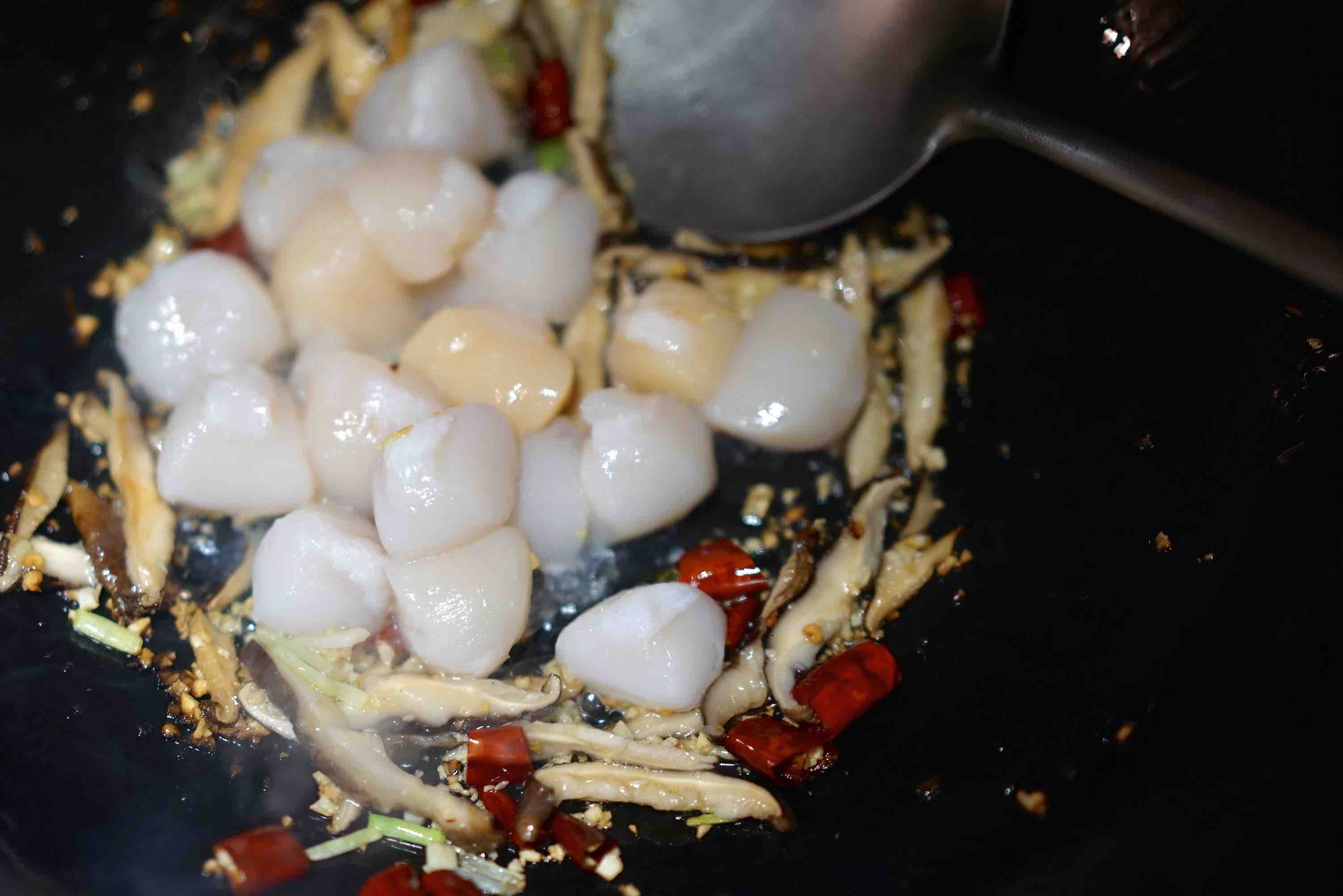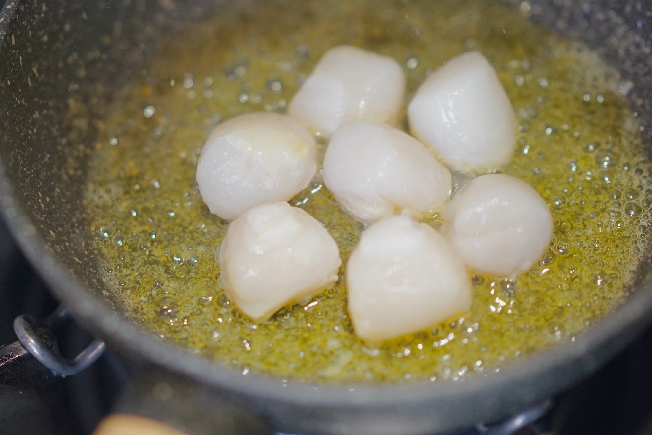 2. 帆立贝入锅, 翻炒至两面金黄