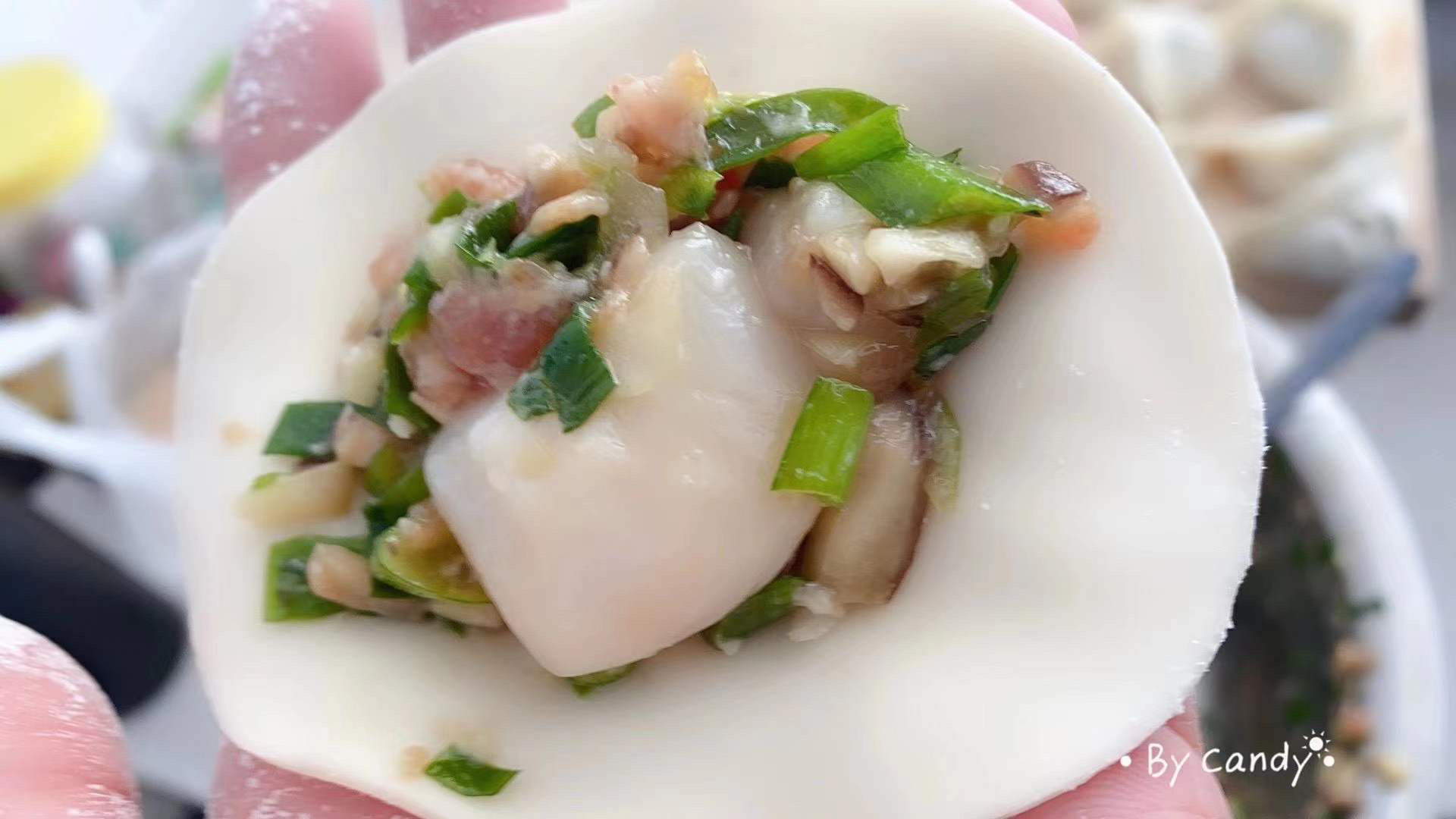 备料 : 帆立贝 韭菜 肉馅 葱 香菇碎 饺子皮