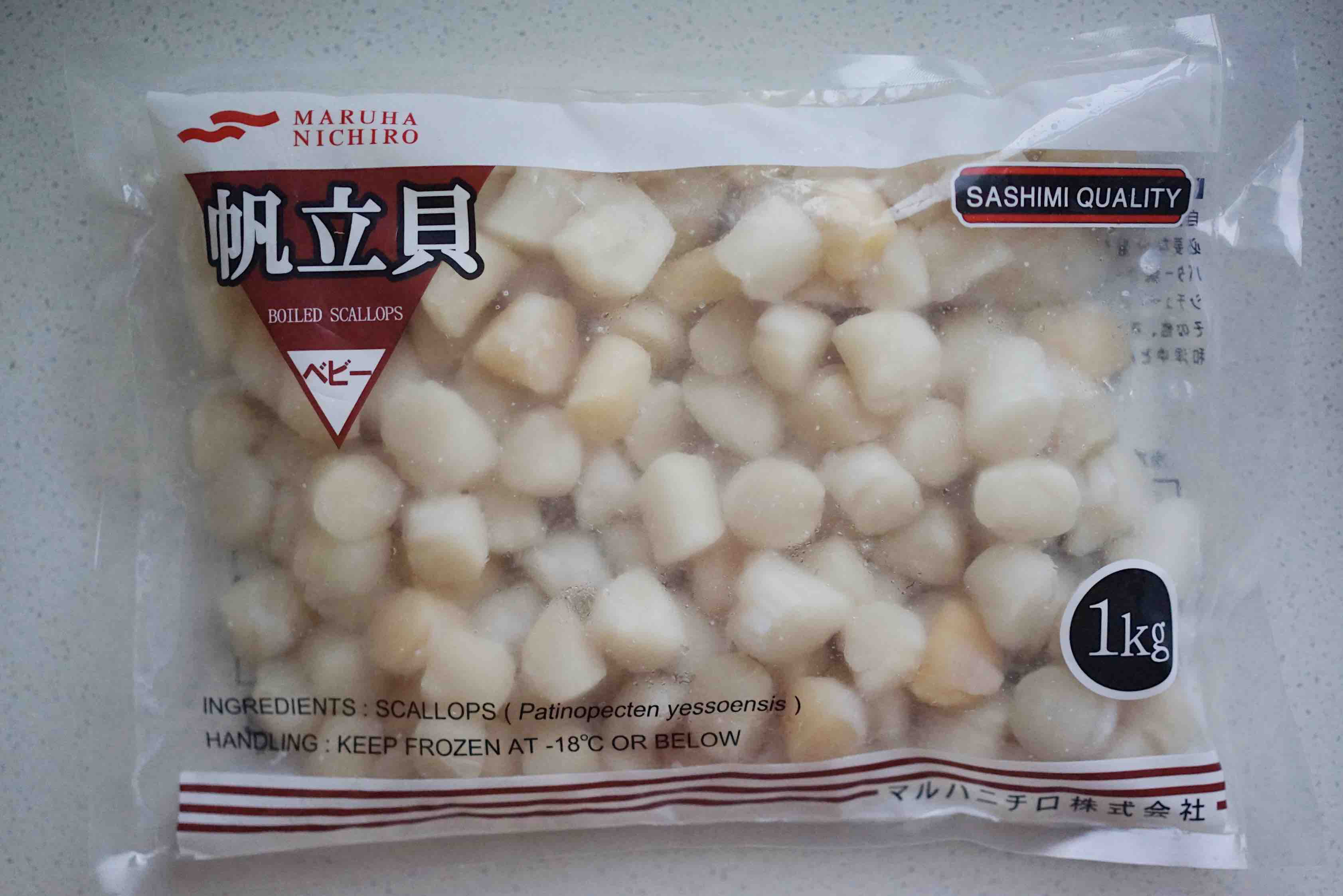 市面见到的国产“原浆贝”, 因为多数工厂没有条件全海水环境加工, 虽然有的没泡水, 可是清洗过程中难免会吃水, 从而品质大打折扣, 个头也要小很多, 常见的300粒/kg 为主流规格,且多呈现为冻结成块, 不方便分次拿取,多次解冻也会流失鲜美。