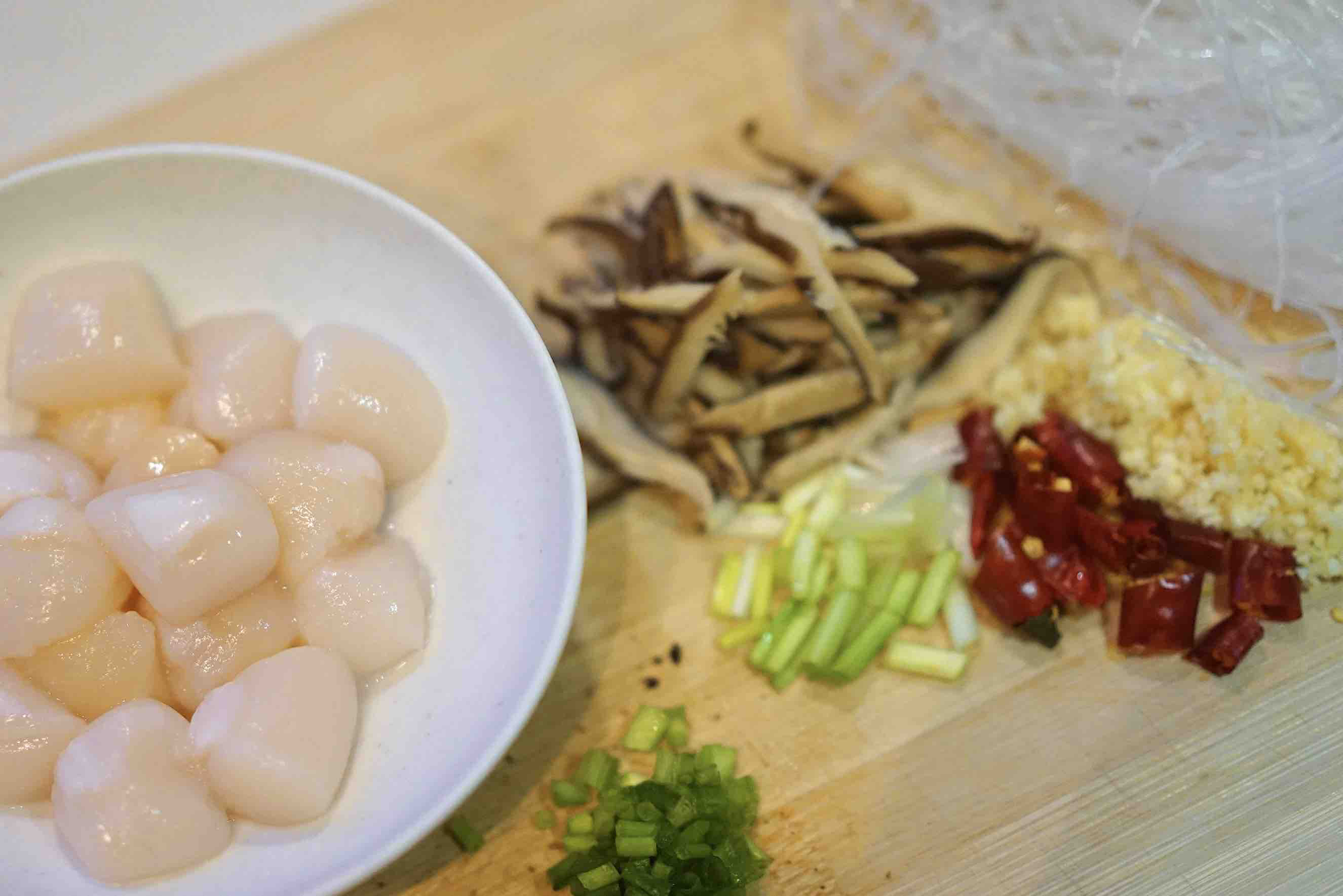 备料: 葱末 蒜泥 香菇 小米辣 粉丝 蒜苗 帆立贝