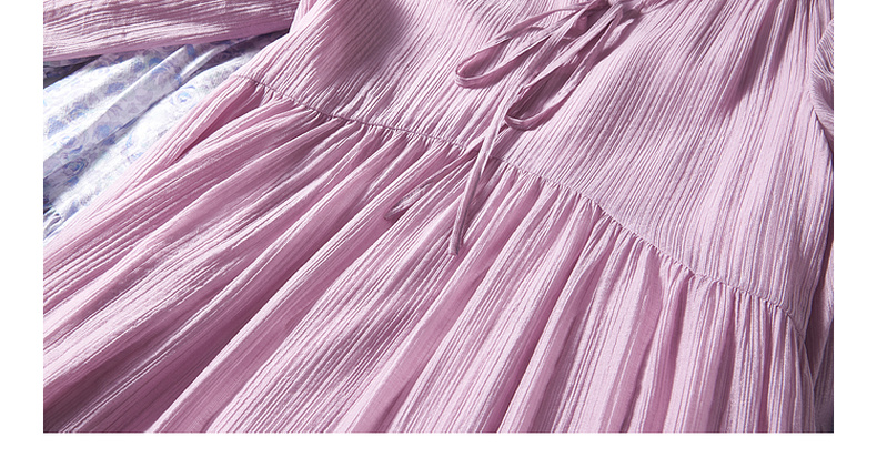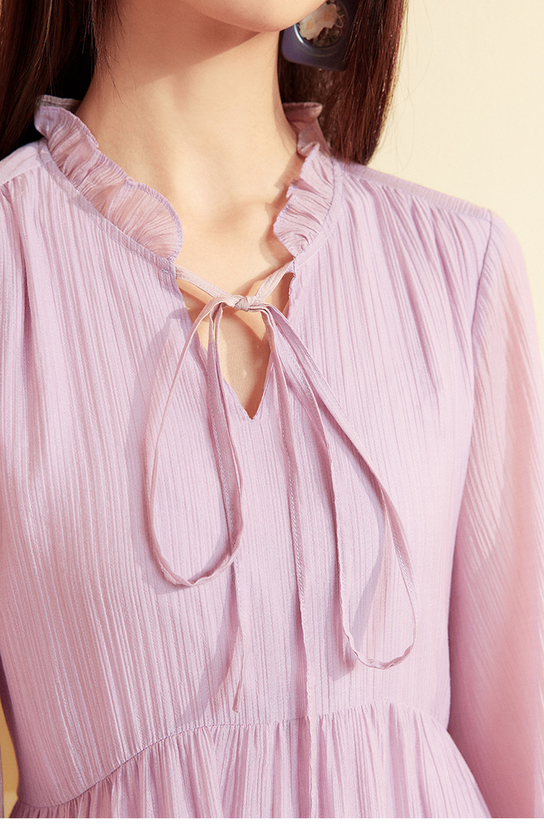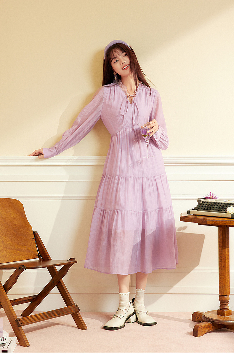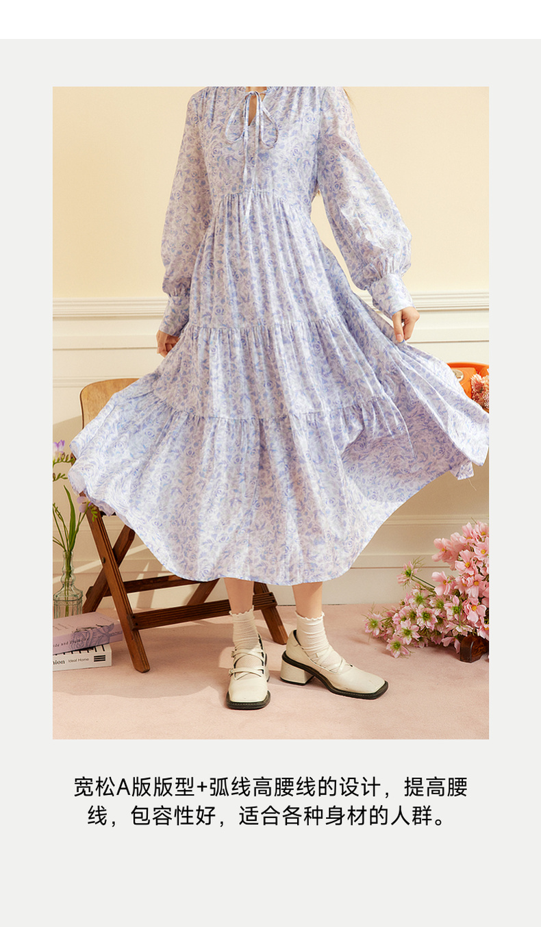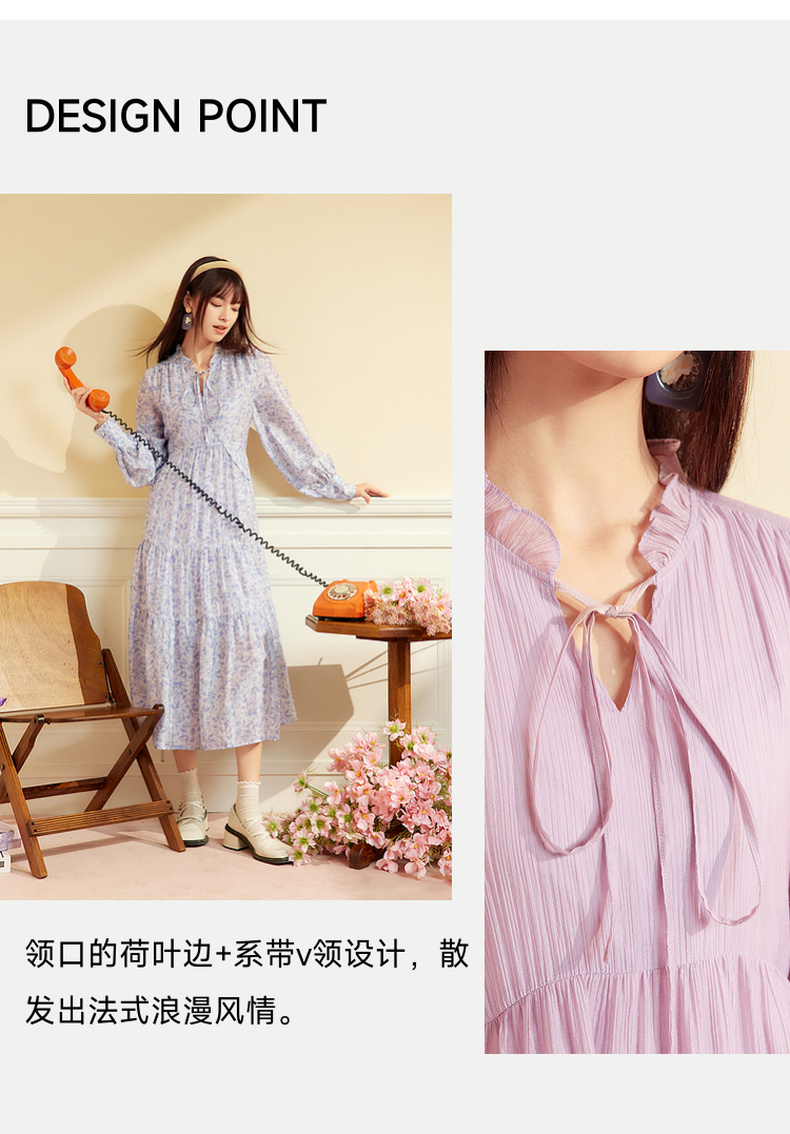 两三事春枝踏浪小清新荷叶边v领绑带连衣裙飘逸长裙