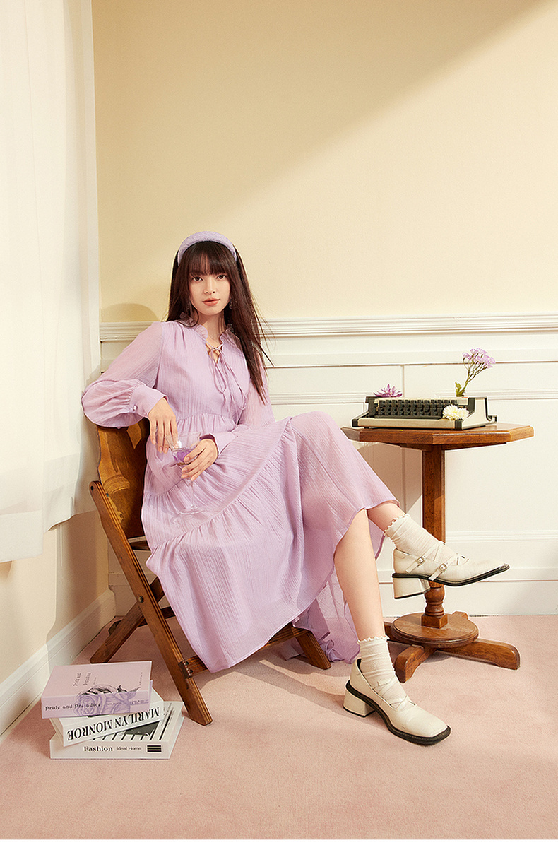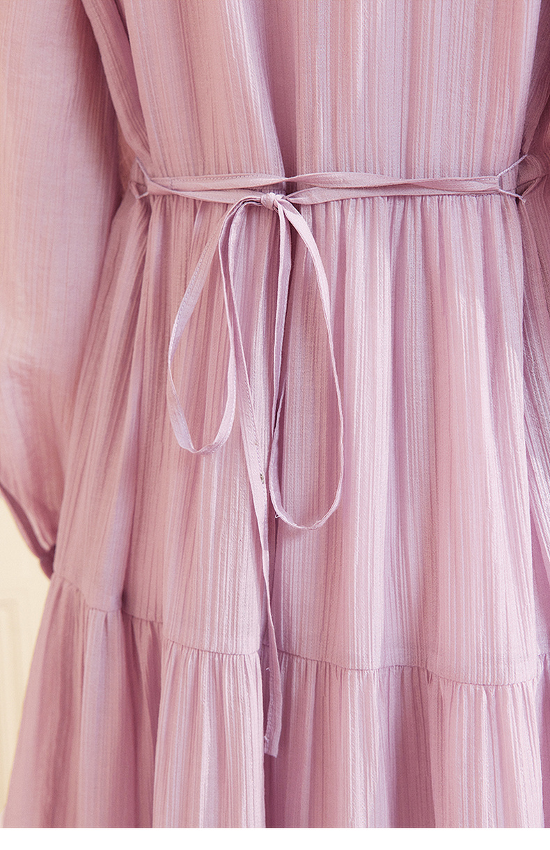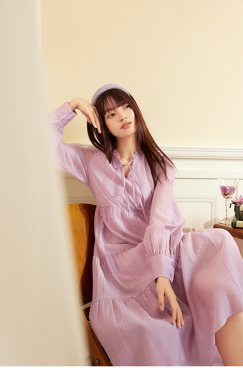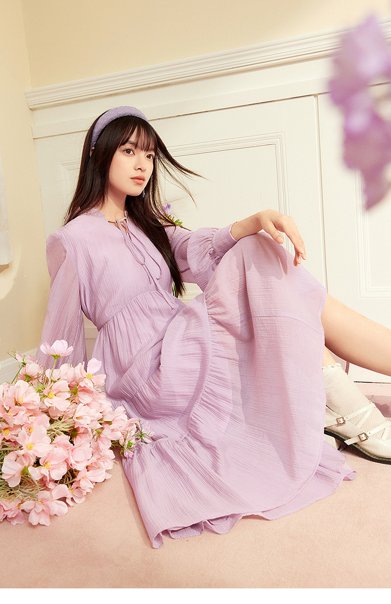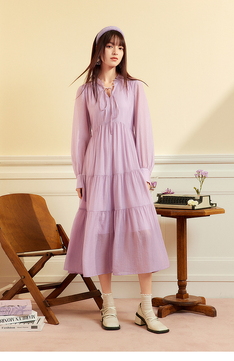 两三事春枝踏浪小清新荷叶边v领绑带连衣裙飘逸长裙