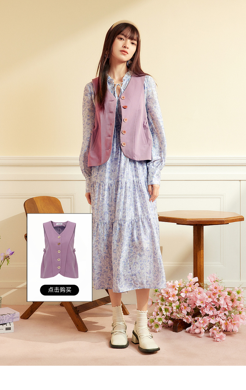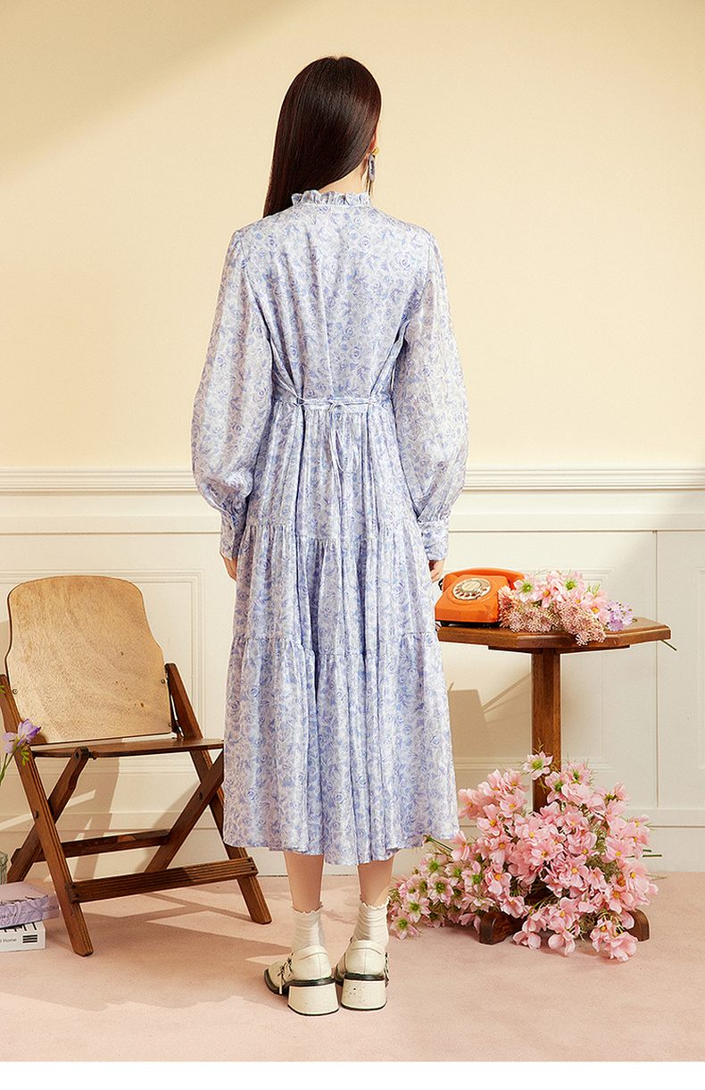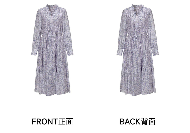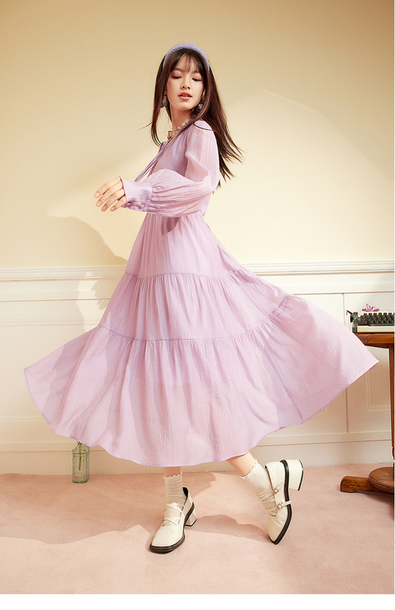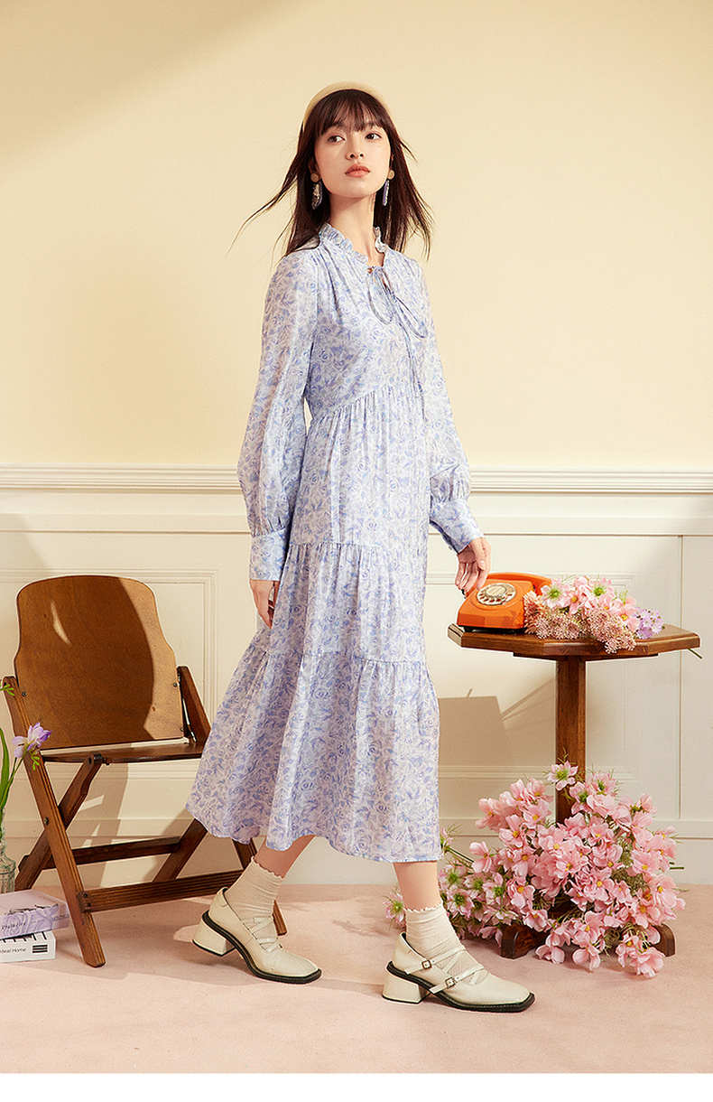 两三事春枝踏浪小清新荷叶边v领绑带连衣裙飘逸长裙