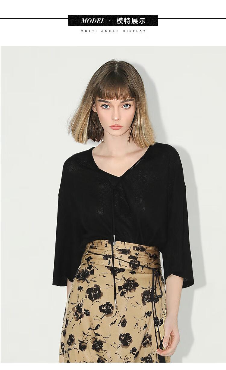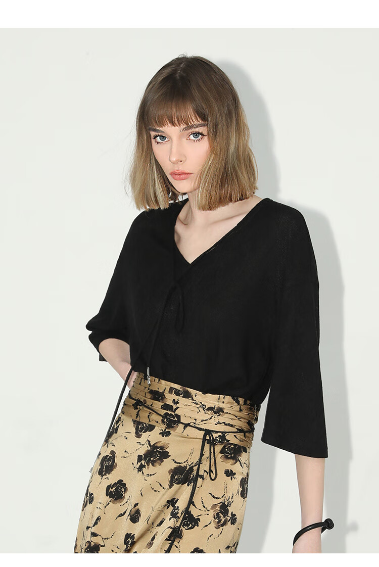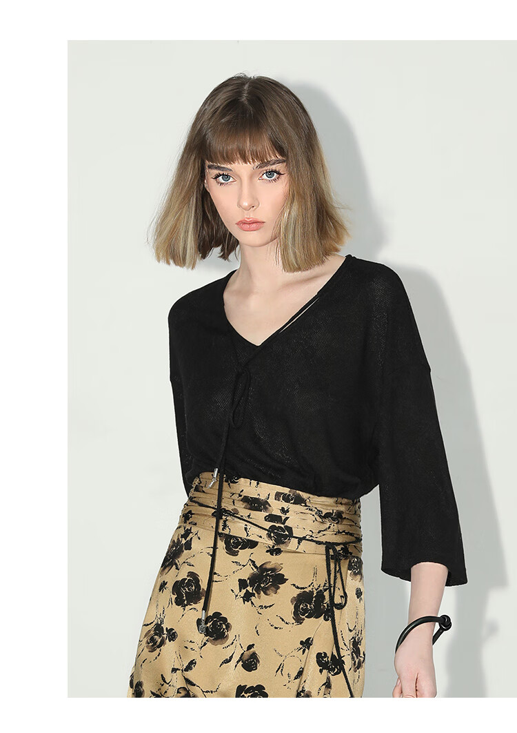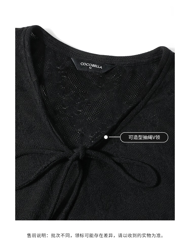 COCOBELLA镂空提花V领系带五分袖针织衫宽松蝙蝠袖上衣TS3002