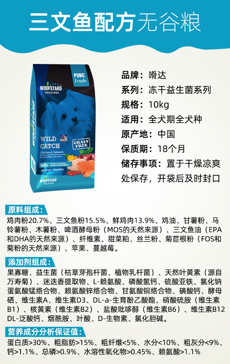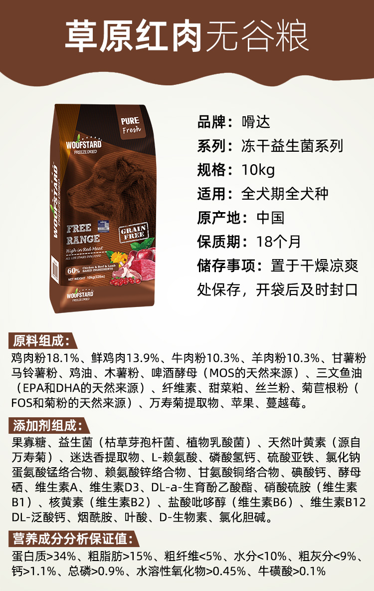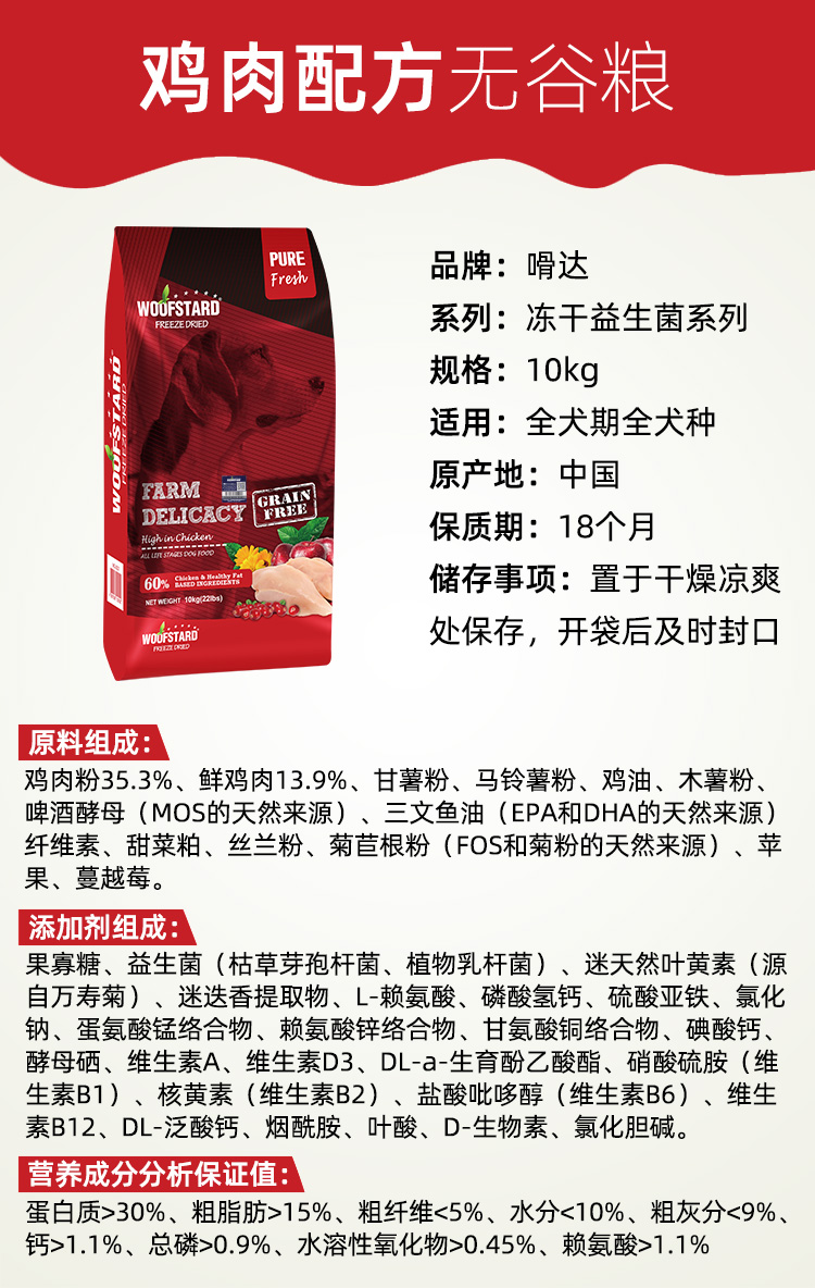 嗗达益生菌冻干狗粮woofstad啃达通用无谷成犬粮去泪痕20斤鲜肉粮