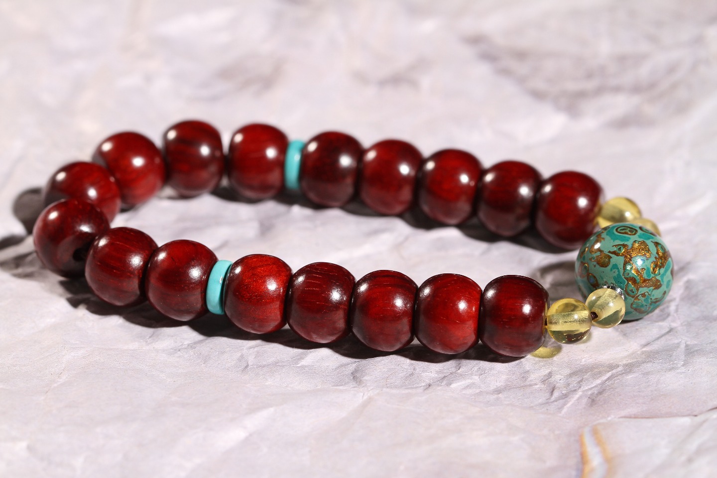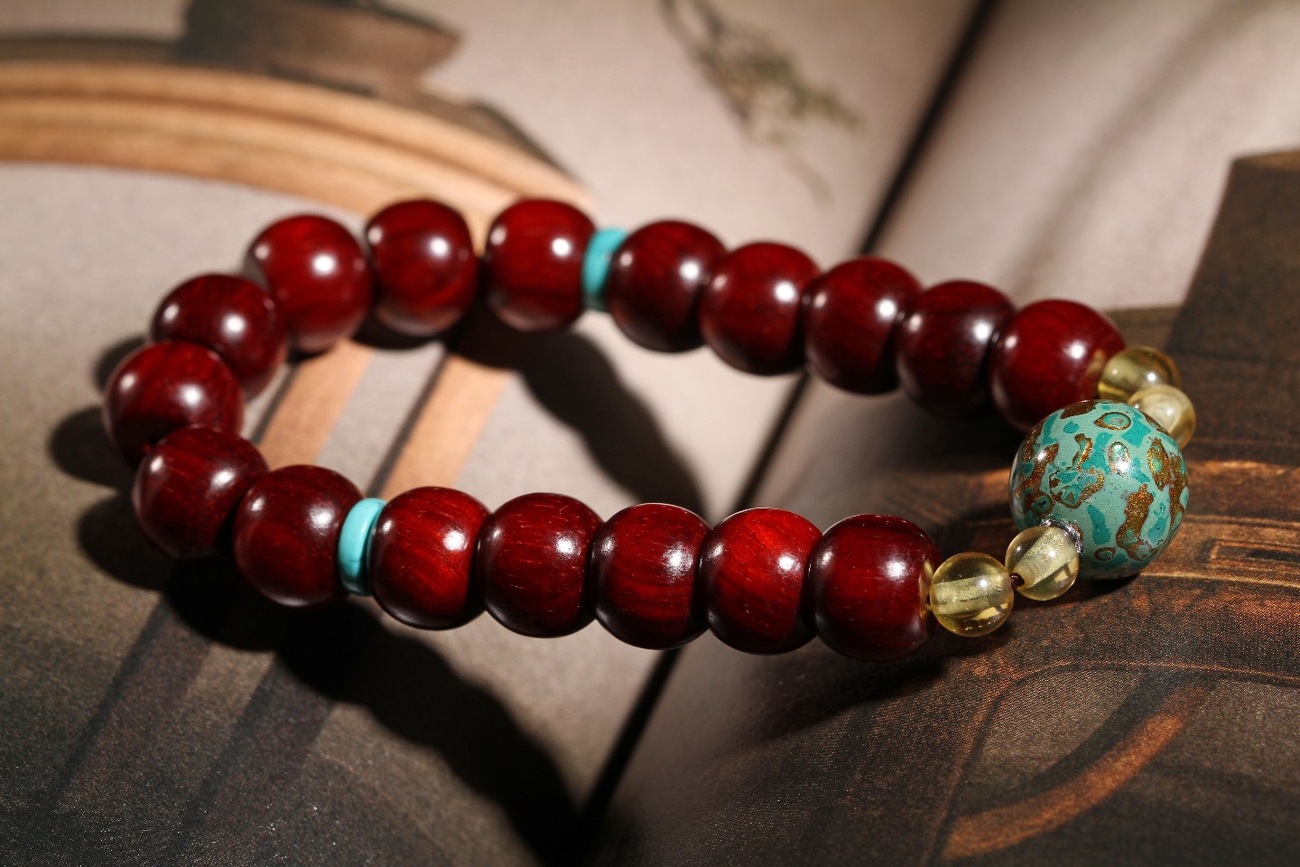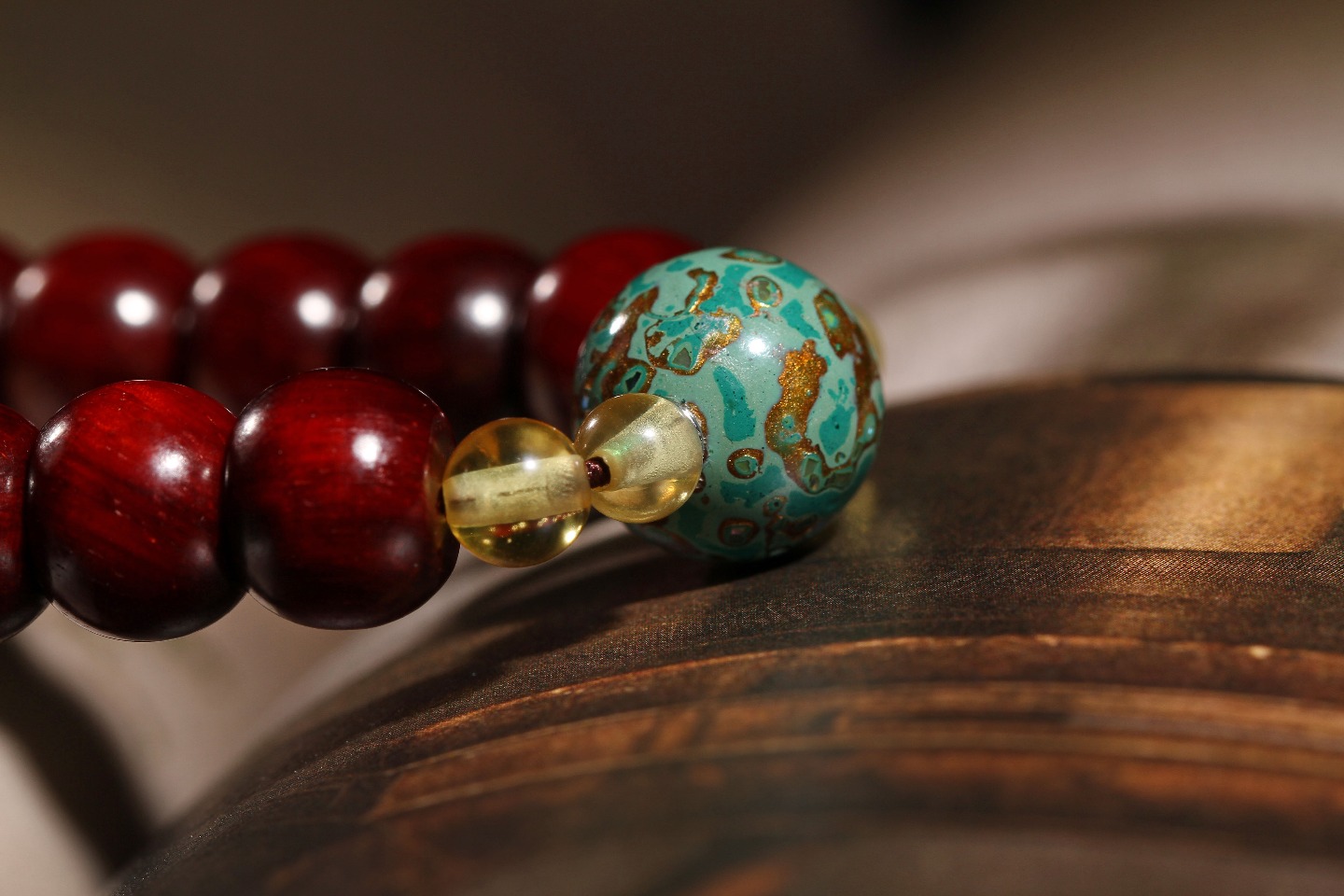 搭配:印度小叶紫檀为主,配绿松隔片,大漆顶珠,以琥珀做点缀,整体看起来大气不失面子。