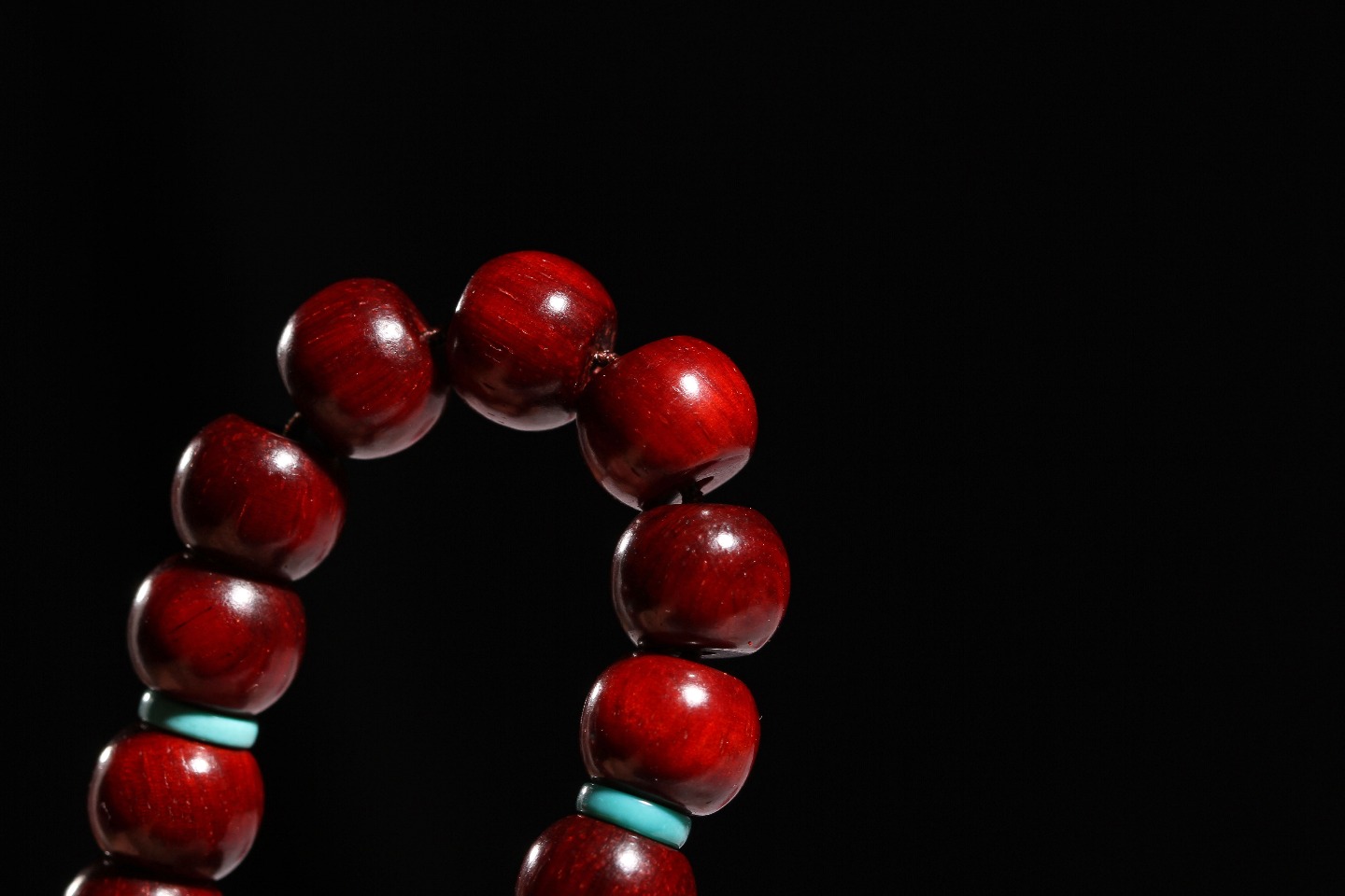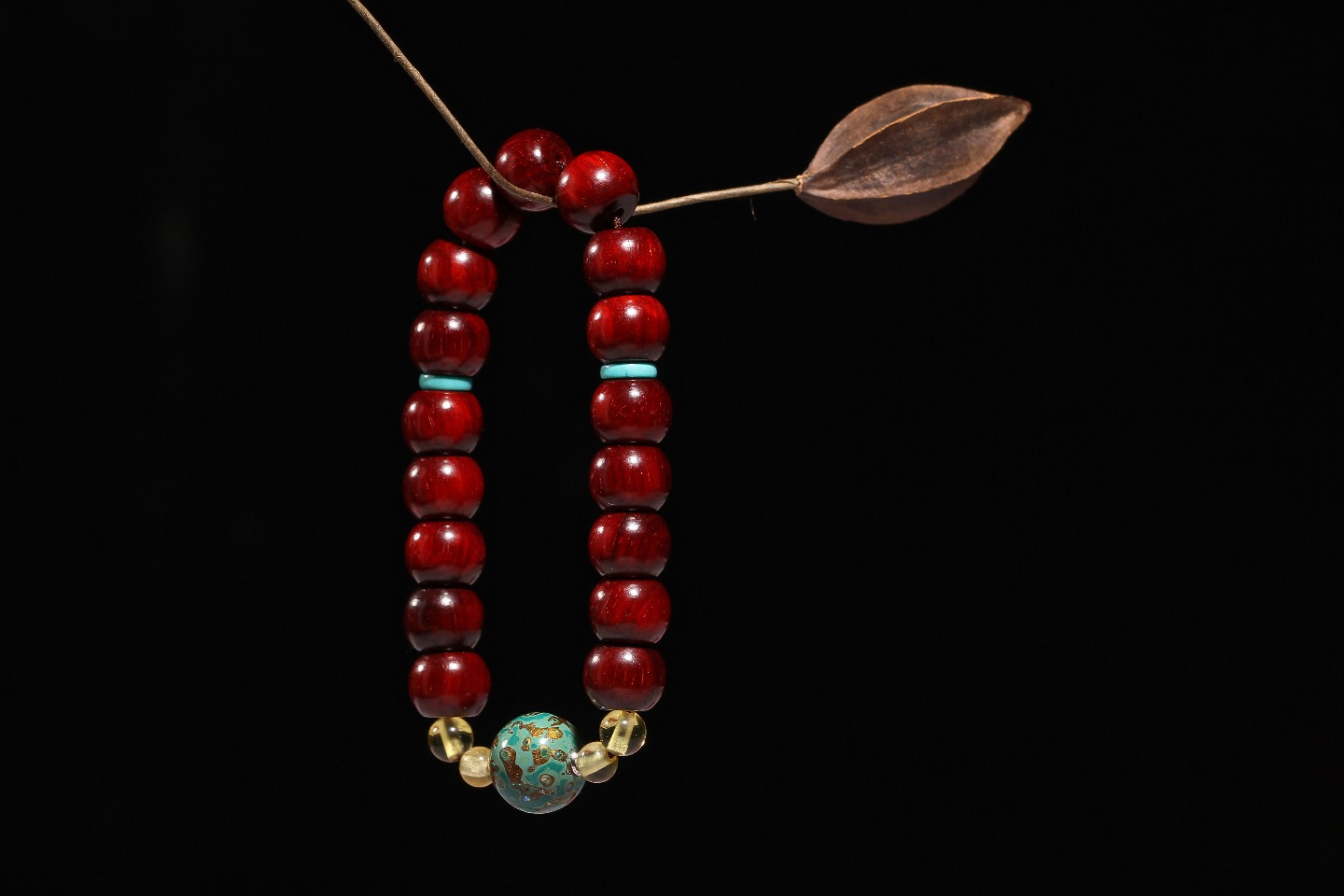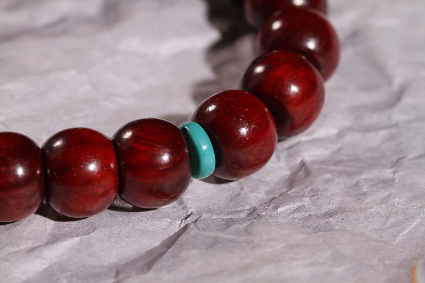 搭配:印度小叶紫檀为主,配绿松隔片,大漆顶珠,以琥珀做点缀,整体看起来大气不失面子。
