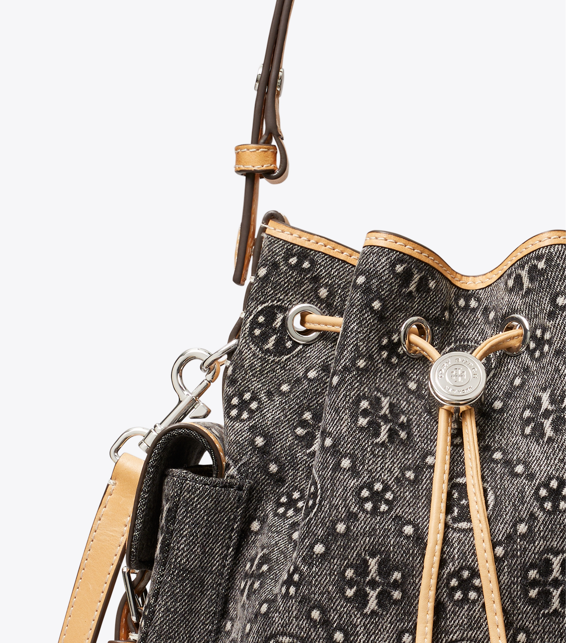 品牌经典图案。TMonogram水桶包精选水洗牛仔面料而制,呈现细腻纹理。配有可调节顶部提柄,可挎在肩部,另有可拆卸斜背带,可随心变换背法。可通过金属双TLogo按扣调节抽绳长度。按压按扣可调节抽绳,松开即会锁上。两个外部侧面口袋,令随身小物触手可及。