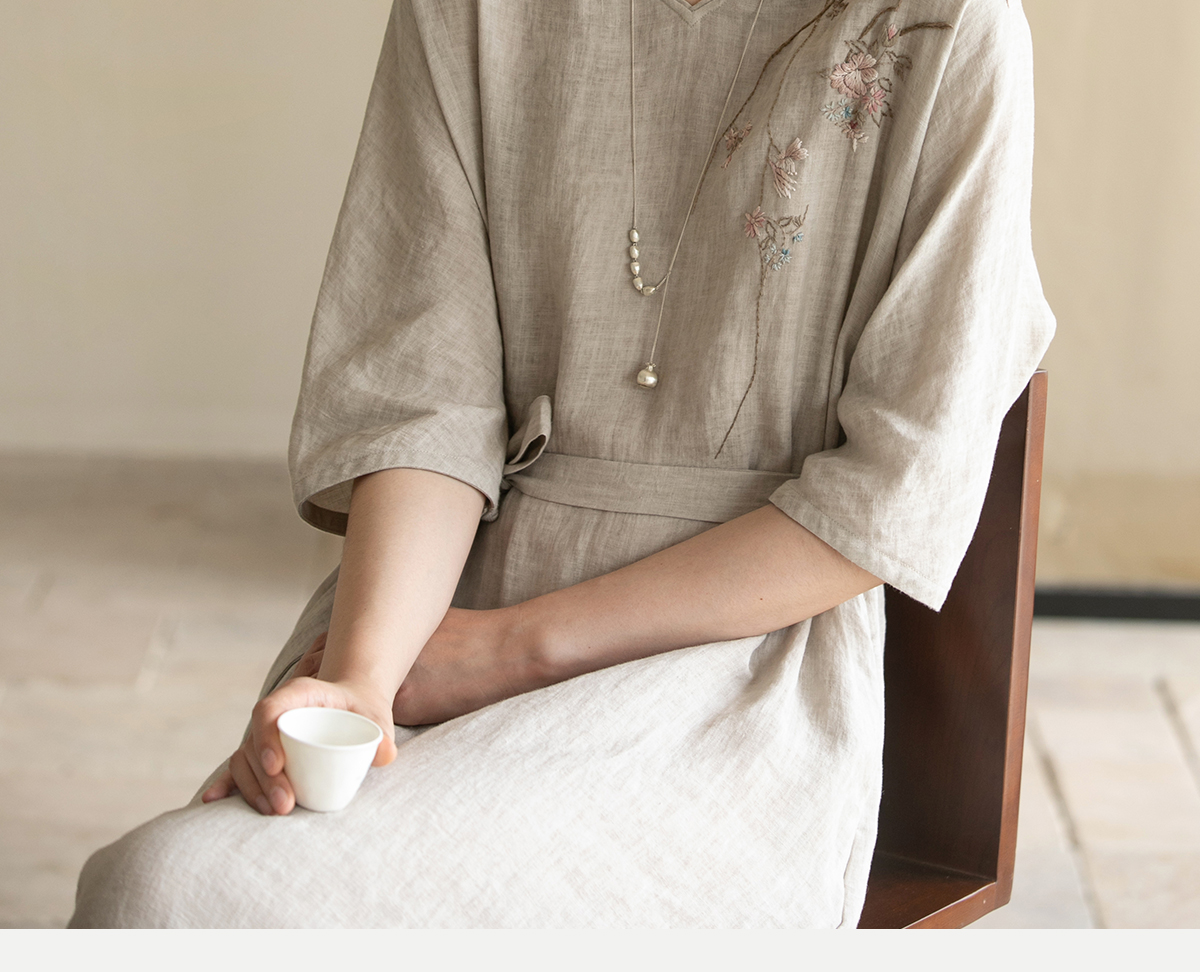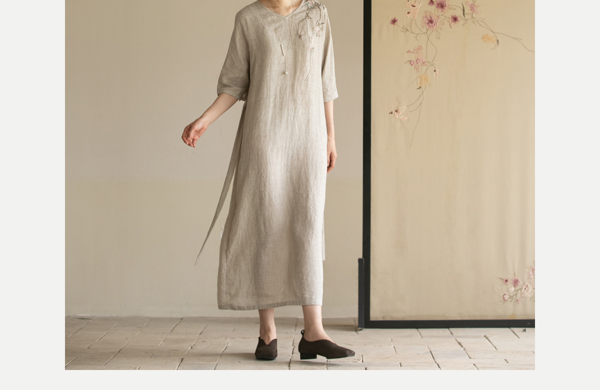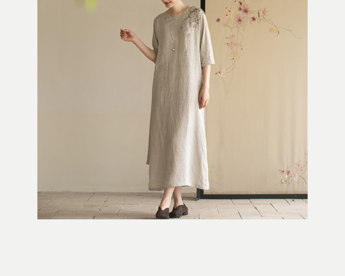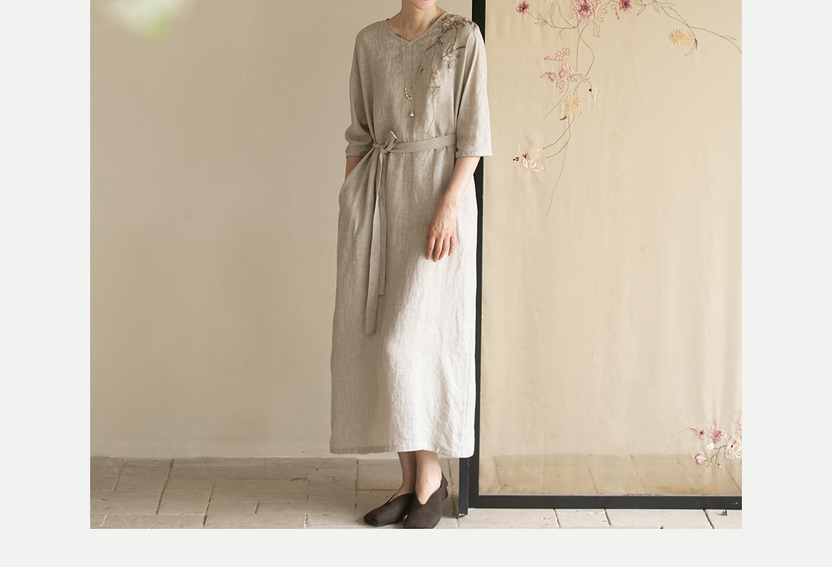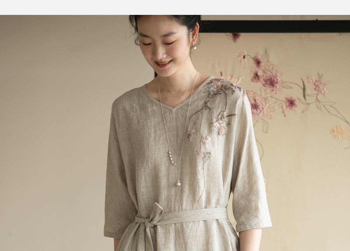 牧衣游原创手工刺绣汉麻连衣裙新品轻薄柔软质朴V领宽松长裙 知源