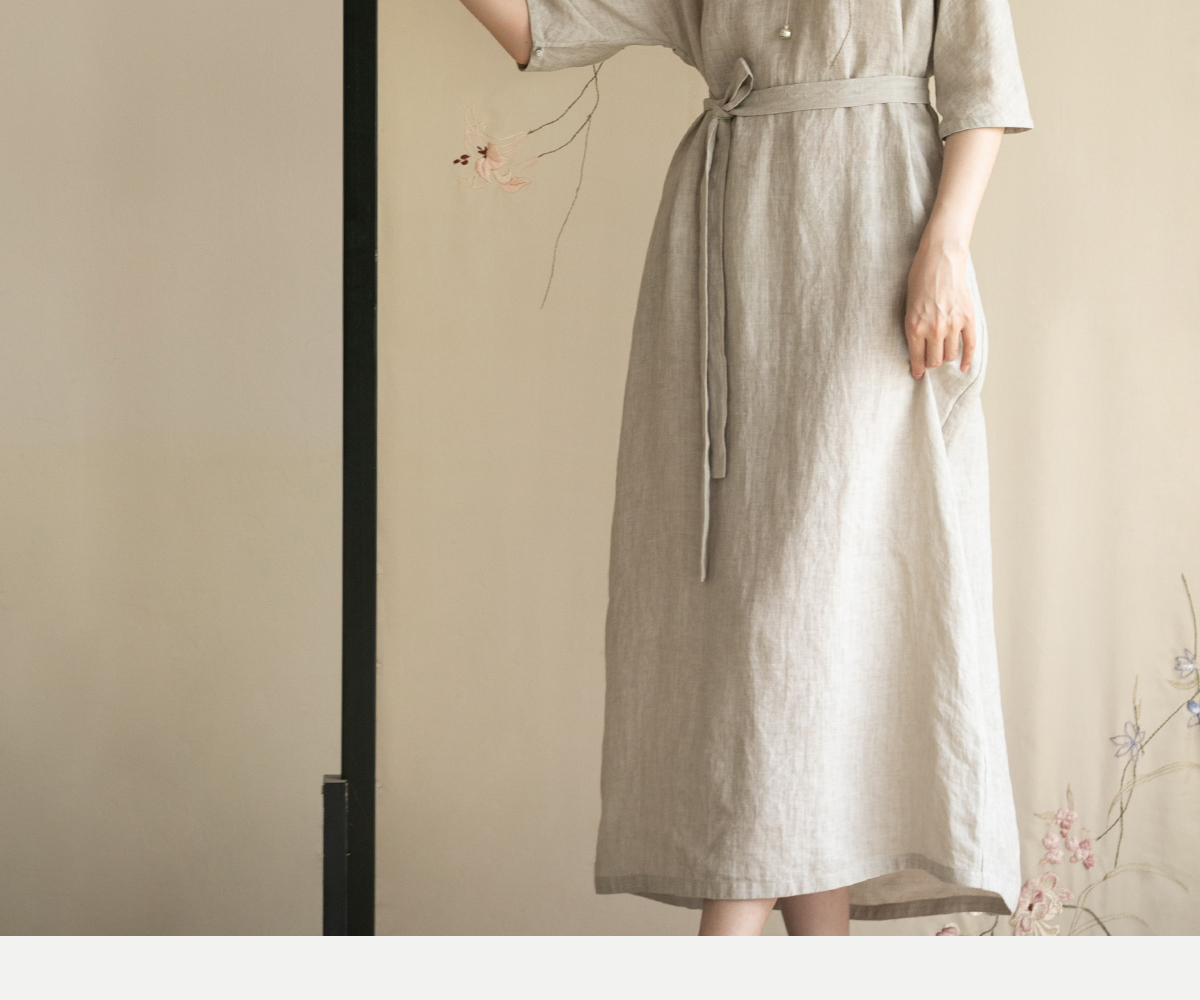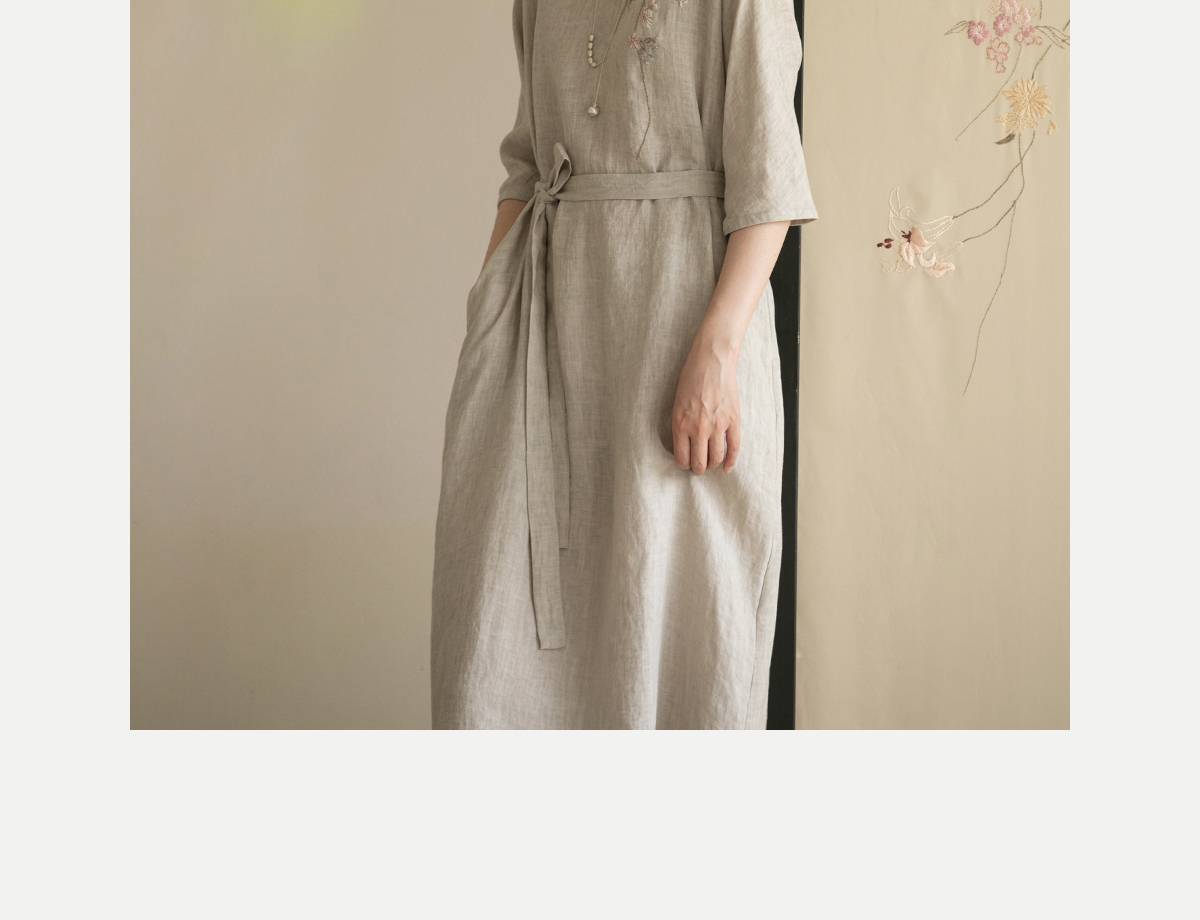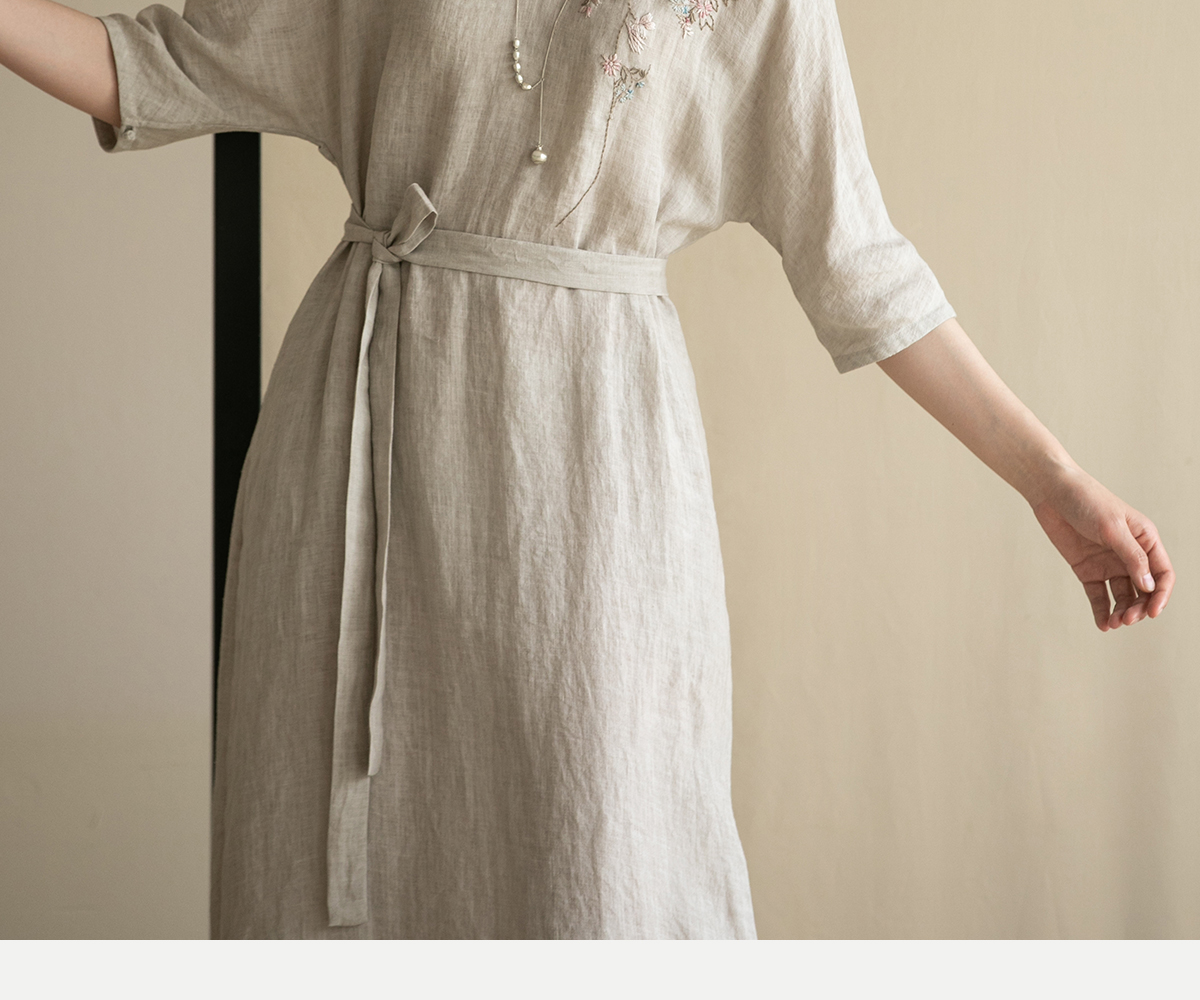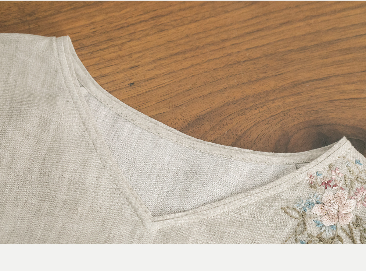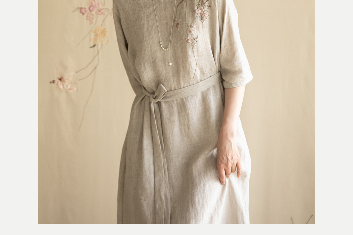牧衣游原创手工刺绣汉麻连衣裙新品轻薄柔软质朴V领宽松长裙 知源