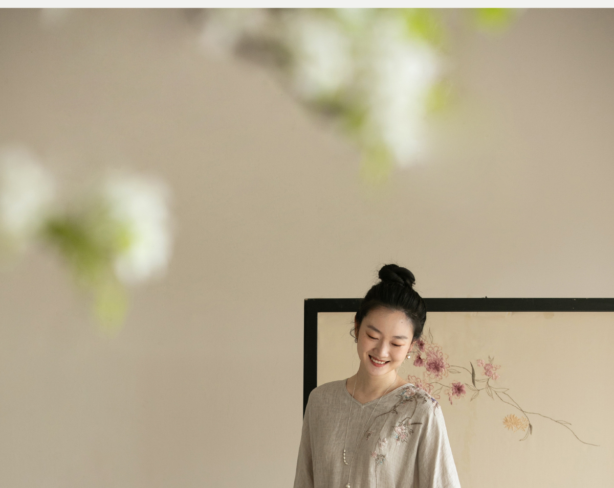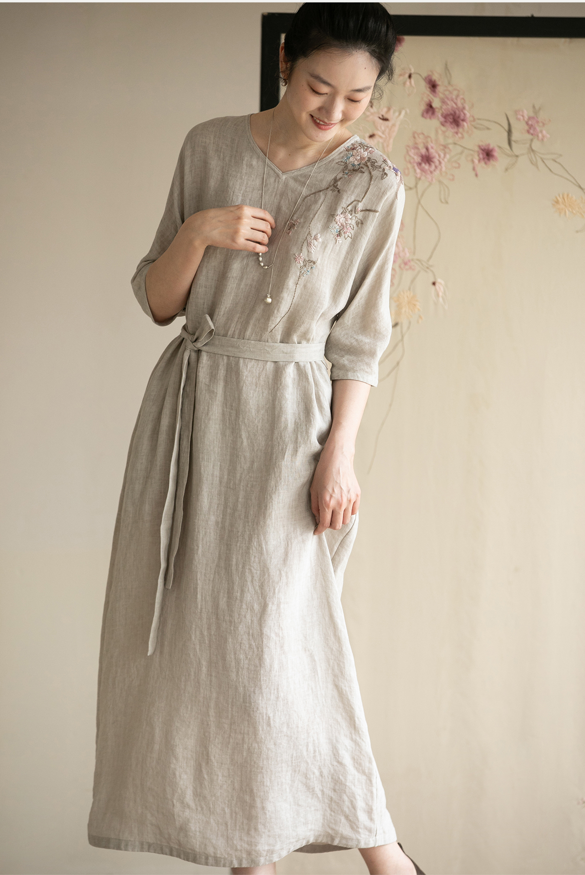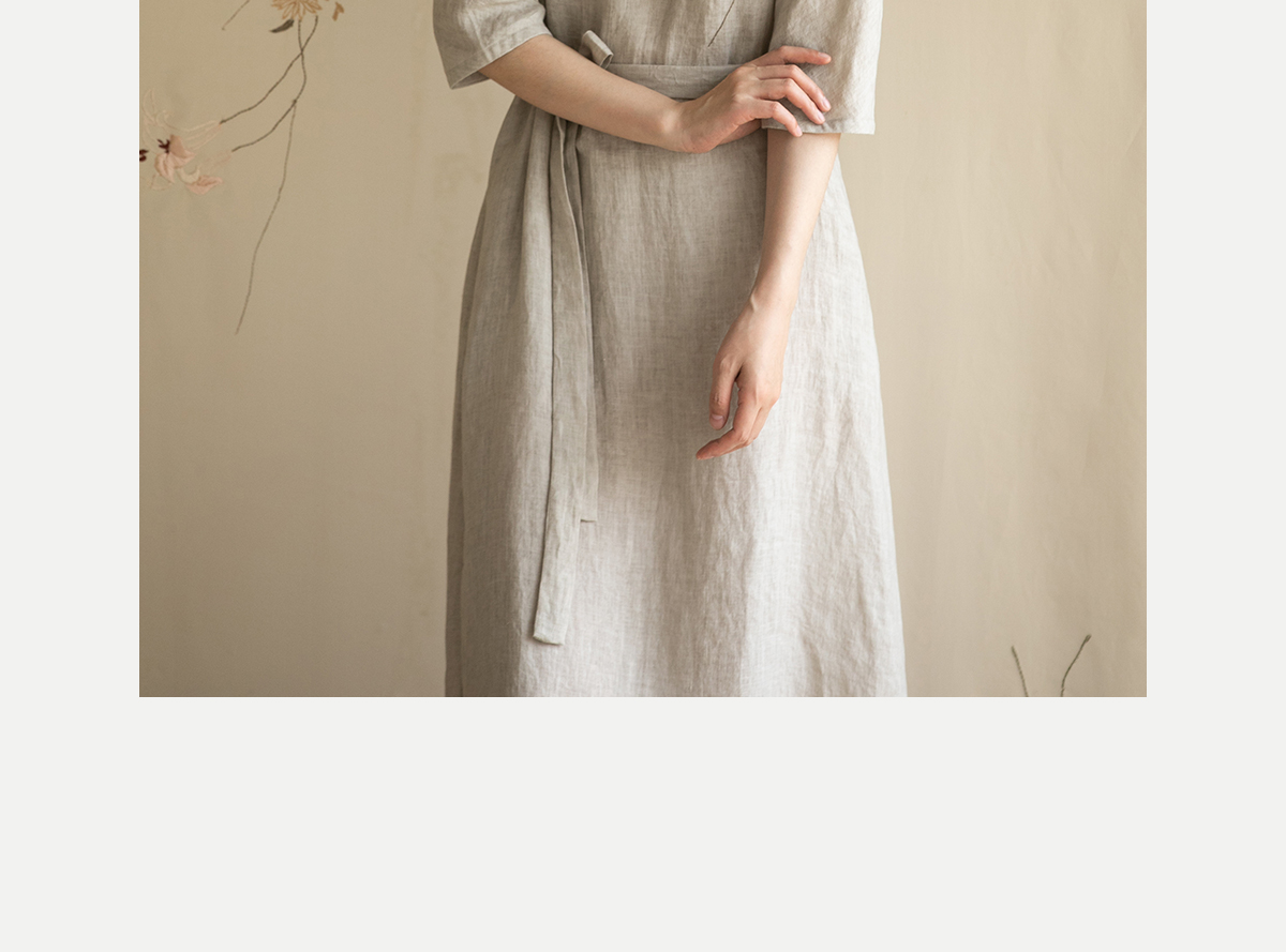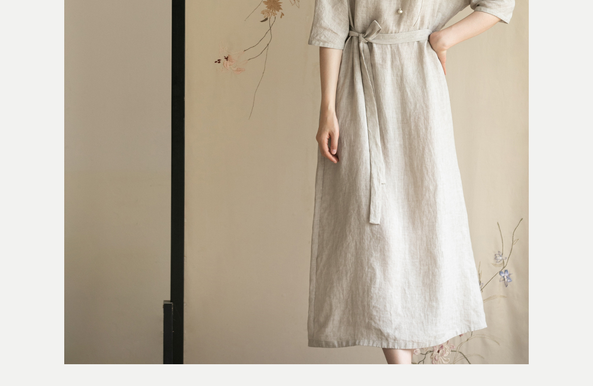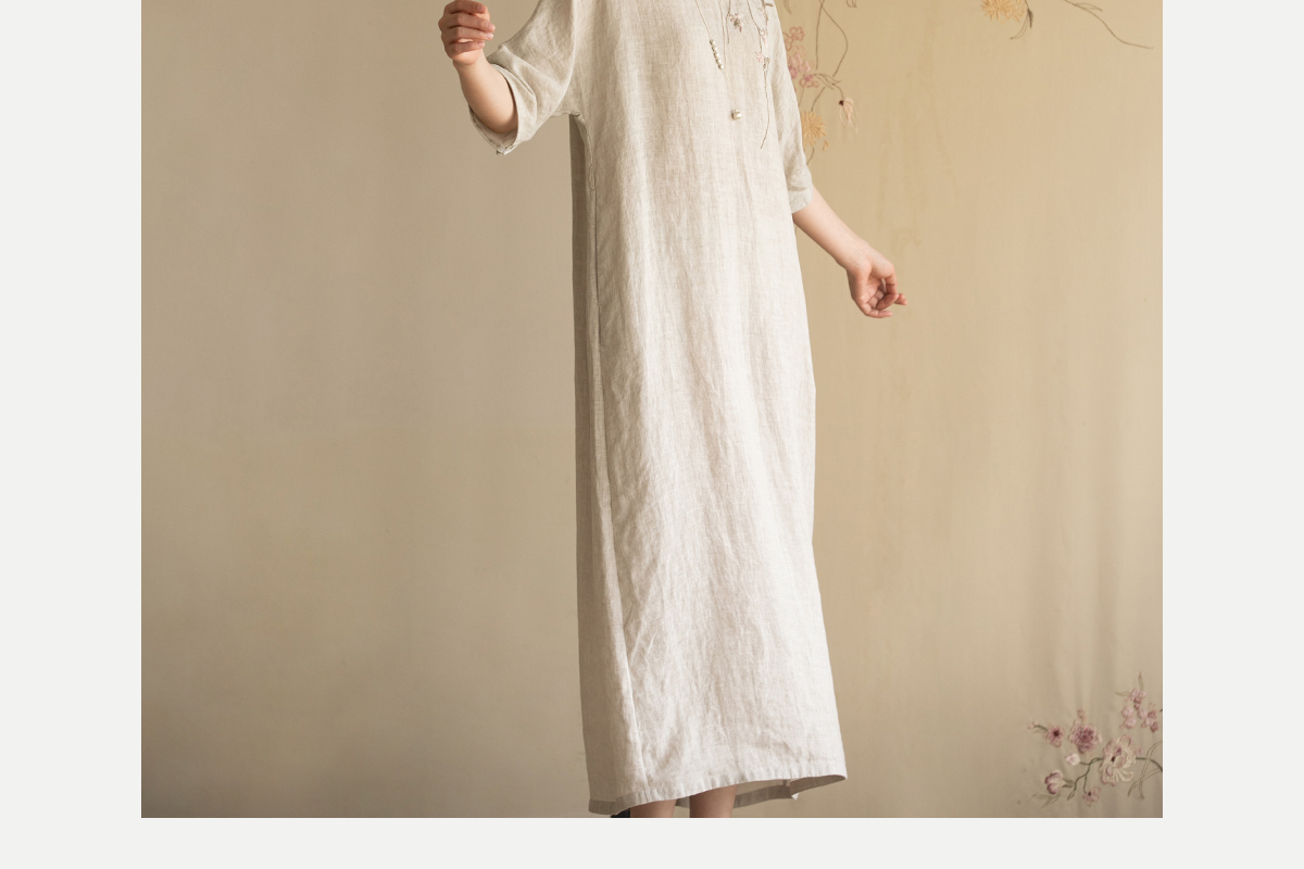 牧衣游原创手工刺绣汉麻连衣裙新品轻薄柔软质朴V领宽松长裙 知源
