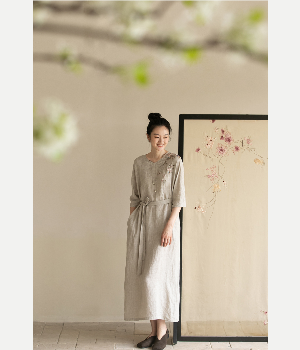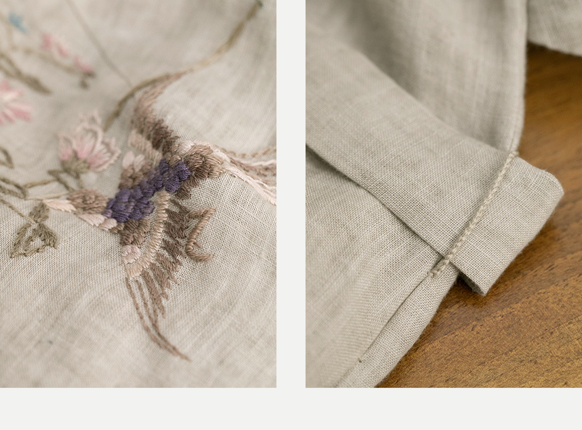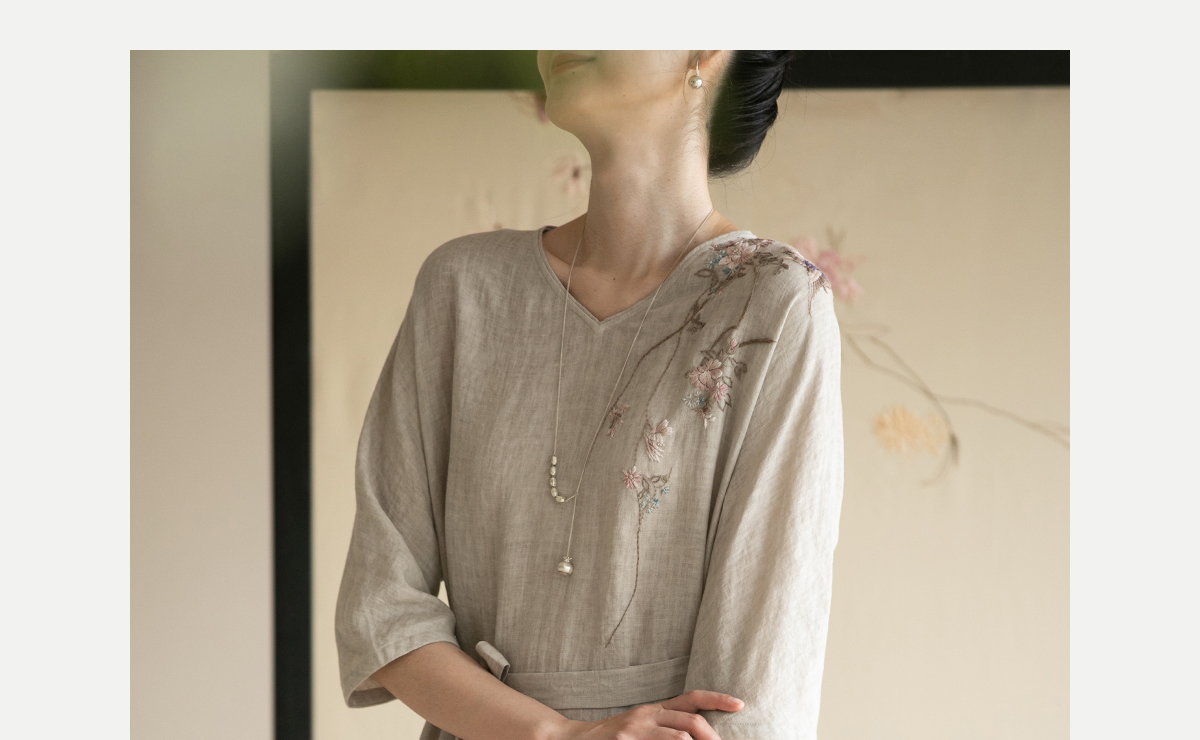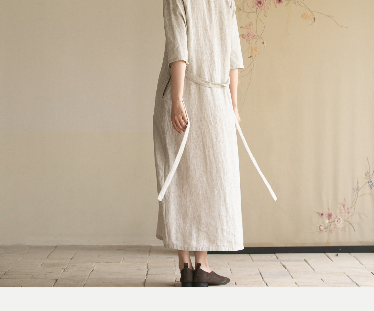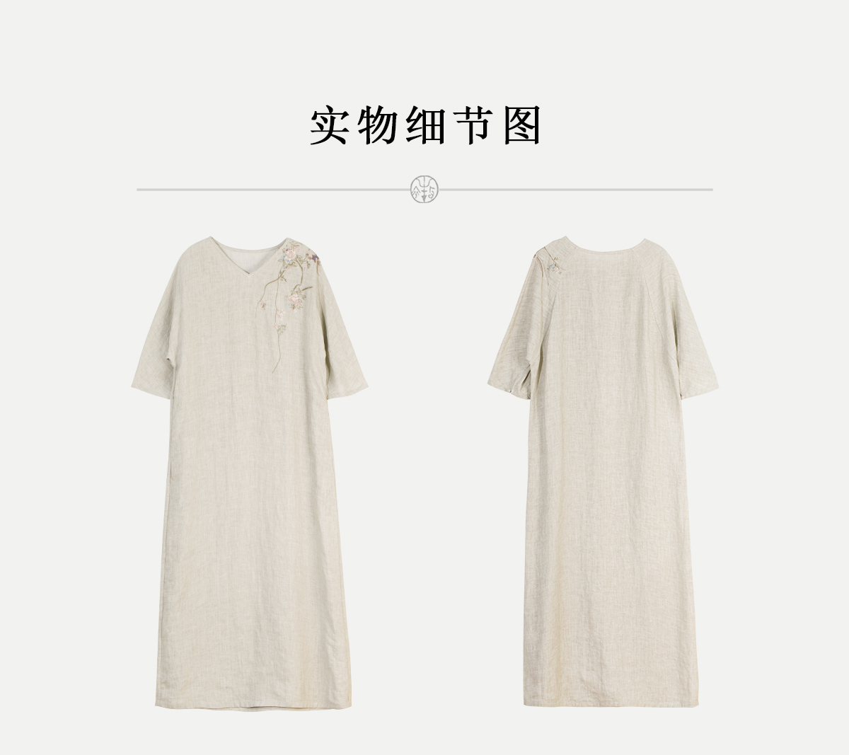 牧衣游原创手工刺绣汉麻连衣裙新品轻薄柔软质朴V领宽松长裙 知源