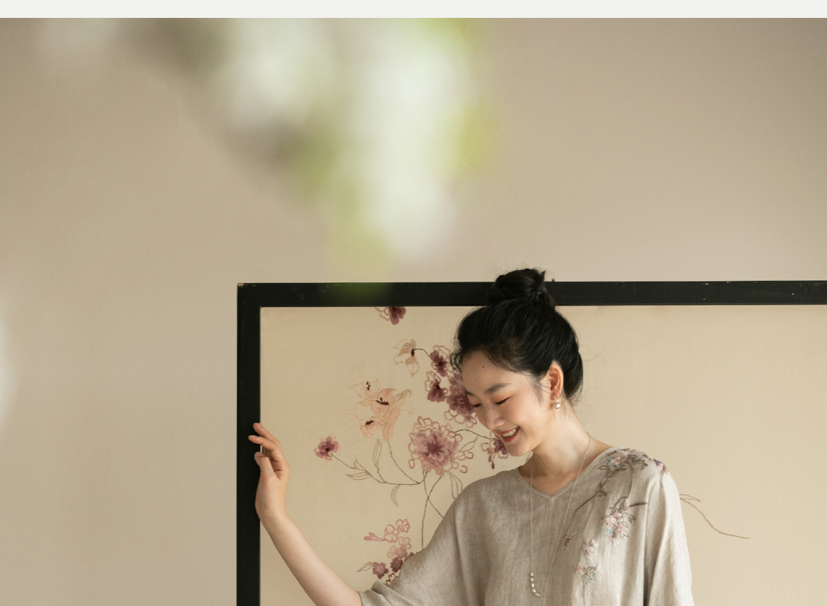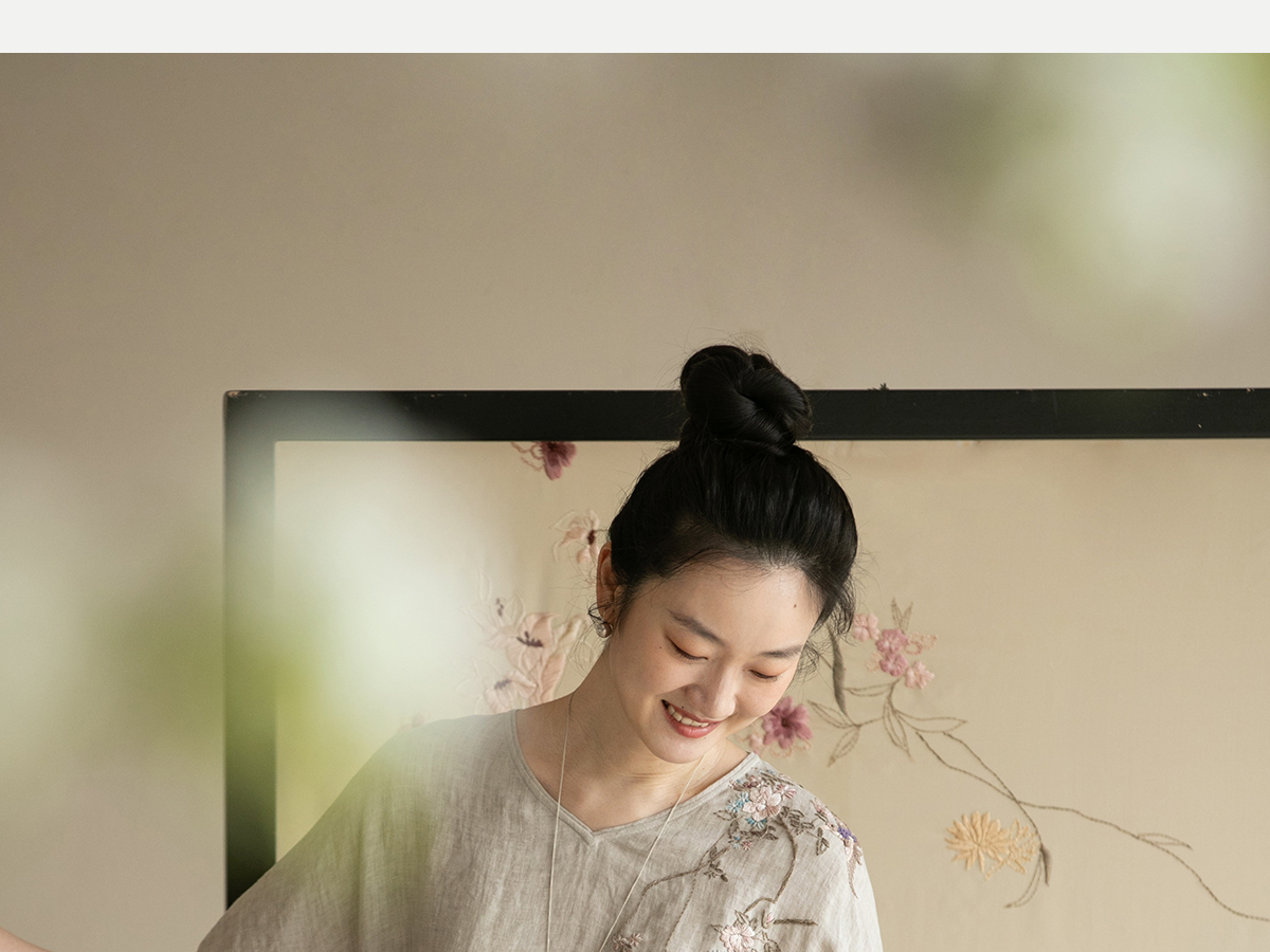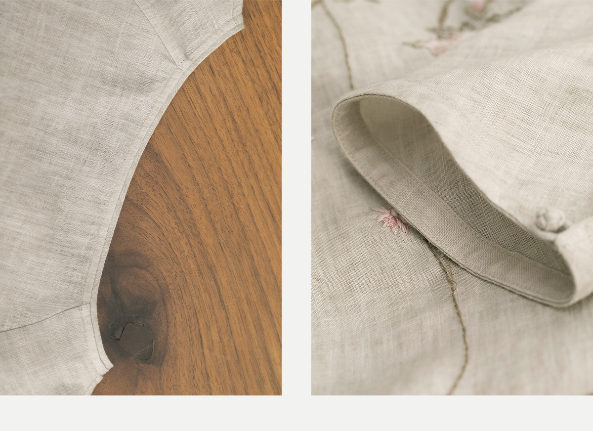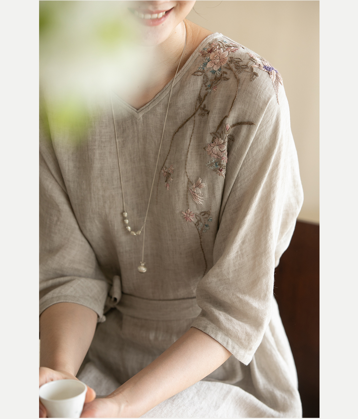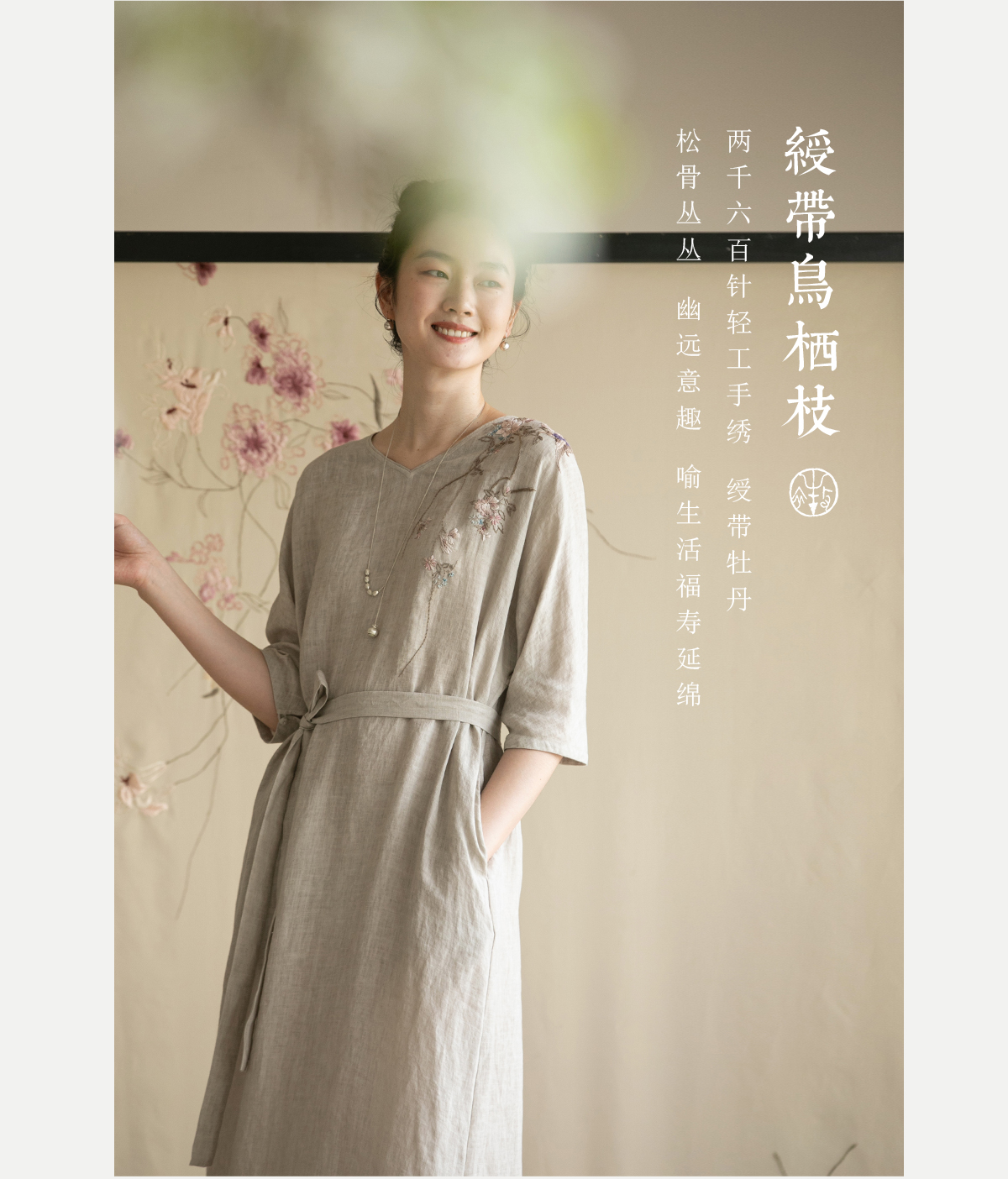 牧衣游原创手工刺绣汉麻连衣裙新品轻薄柔软质朴V领宽松长裙 知源