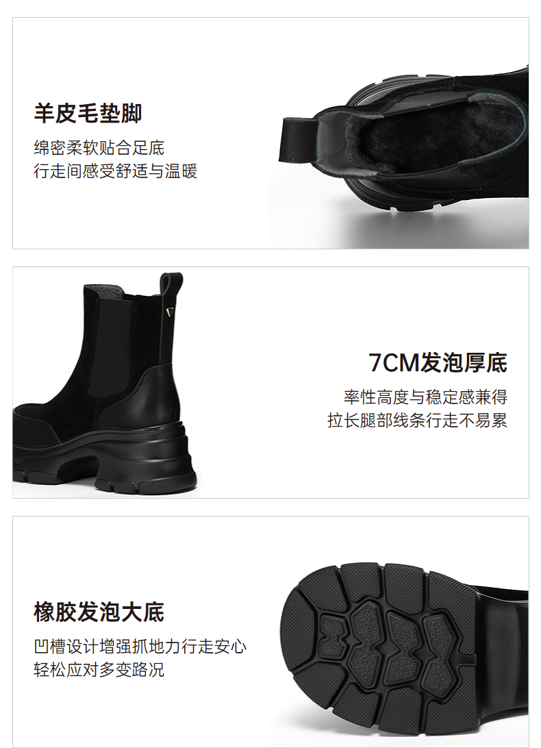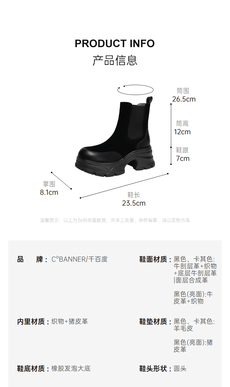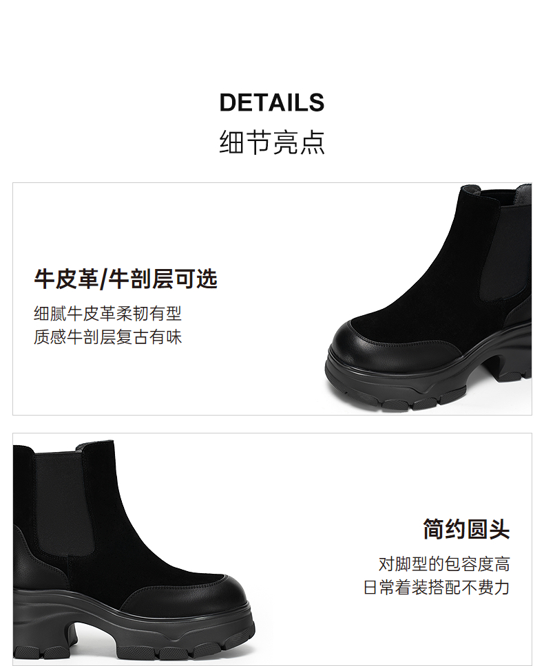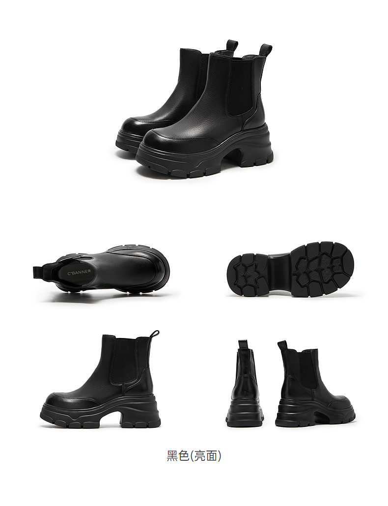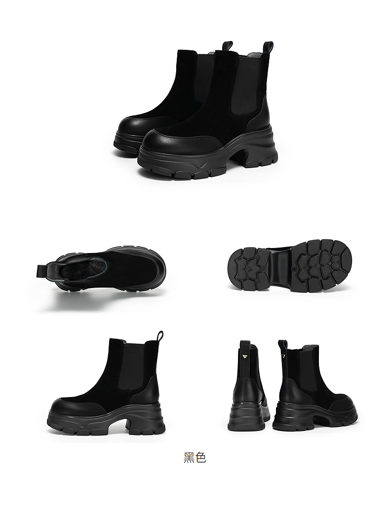 千百度厚底拼接切尔西靴女增高烟筒靴保暖粗跟短靴子A25650976