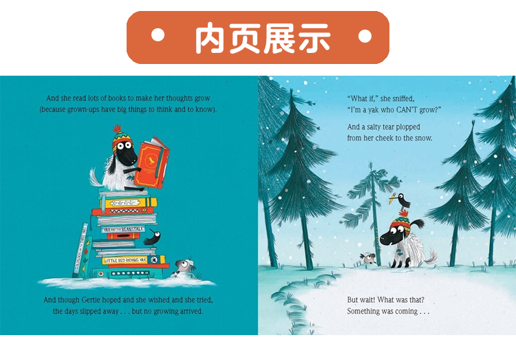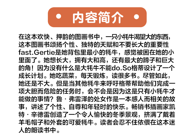 在这本欢快、押韵的图画书中,一只小牦牛渴望大的东西,这本图画书颂扬个性、独特的天赋和不要长大的重要性fast.Gertie是她背包里最小的牦牛,感觉被困在她的小里面了。她想长大,拥有大和高,还有最大的蹄子和巨大的角!因为没有什么是大牦牛不能do.So格蒂设计了一个成长计划。她吃蔬菜,每天锻炼,读很多书。尽管如此,她还是不大。但是当其他牦牛来呼吁格蒂帮助他们完成一项大胆而危险的任务时,会不会是因为这是只有小牦牛才能做的事情?鲁·弗雷泽的处女作是一本感人而相关的故事,讲述了个性、自尊和年轻时的快乐。畅销书插画家凯特·辛德雷创造了一个令人愉快的冬季景观,挤满了戴着羊毛帽子和外套的可爱牦牛。读者会忍不住依偎在这本迷人的朗读书中。