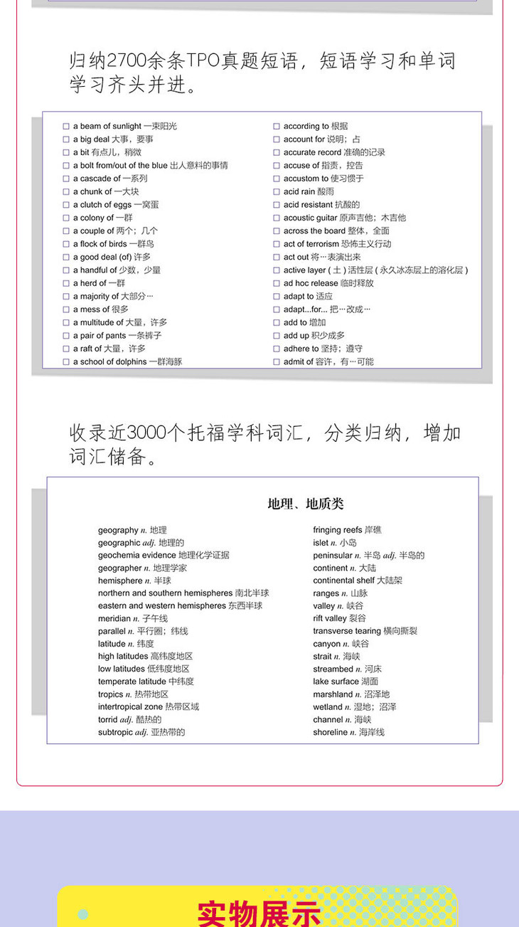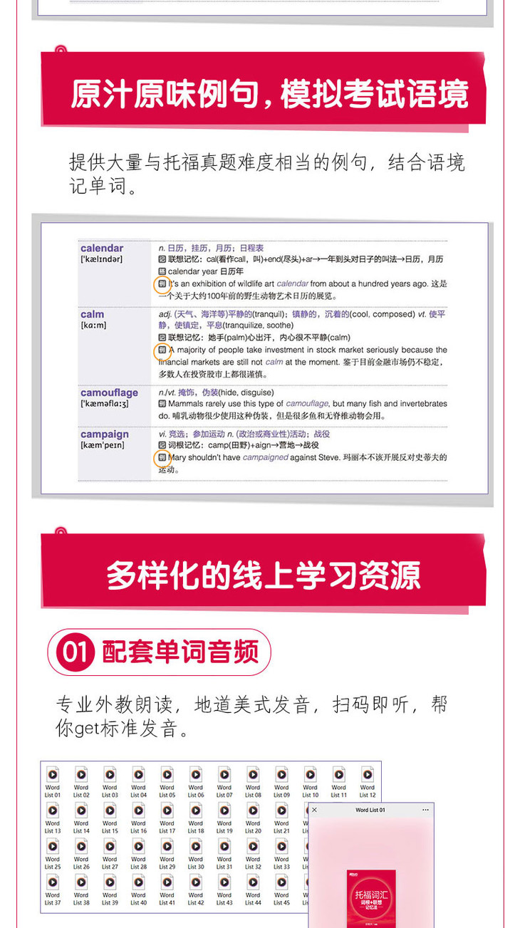 ★ 提供加油包手册(线上资源),收录400多个词根、词缀,2700余条真题短语,近3000个托福学科词汇等实用内容,拓展词汇学习的深度和广度。