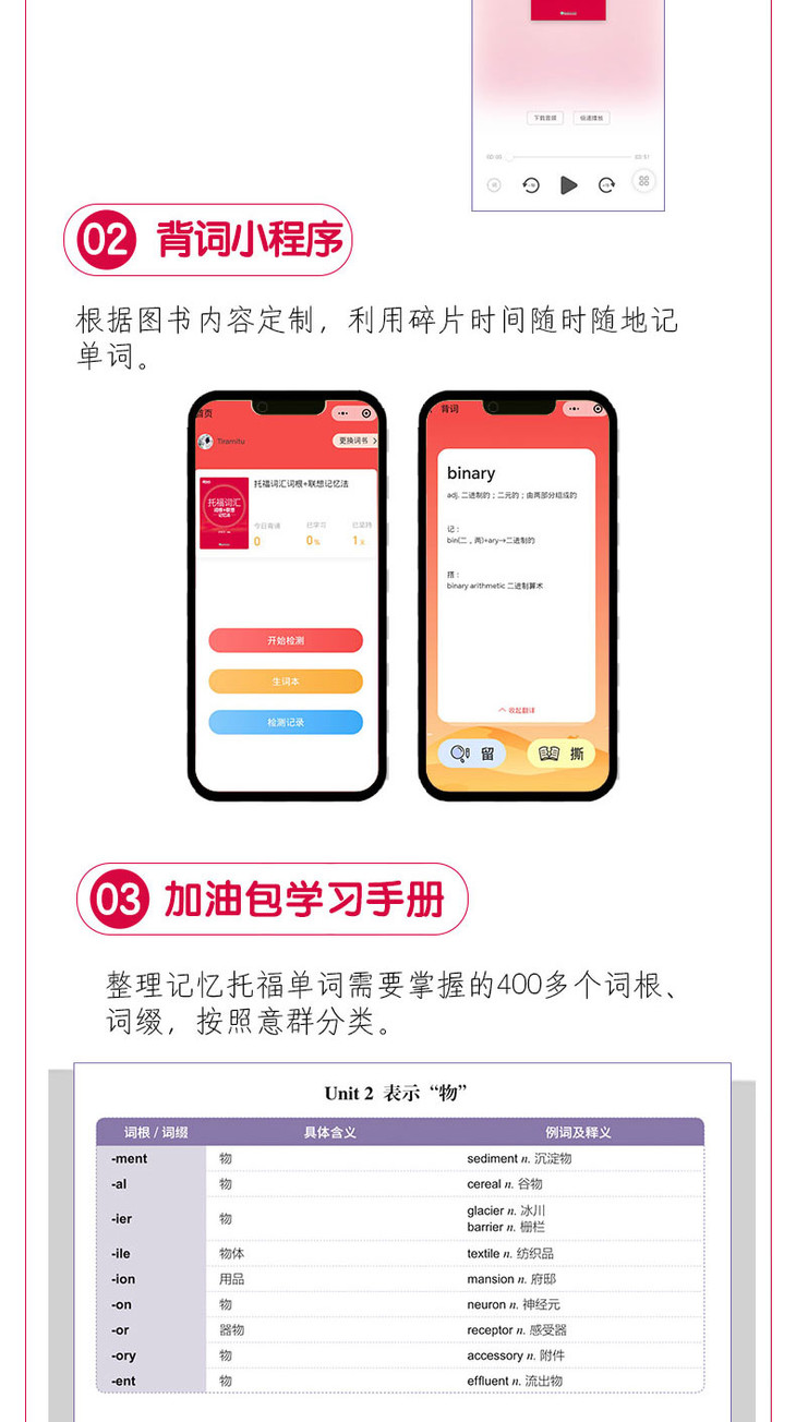 本书提供丰富的线上学习资源,包含单词配套录音、背词小程序及加油包学习手册。其中,加油包收录记忆托福单词需要掌握的400多个词根、词缀,2700余条真题短语,近3000个托福学科词汇等实用的学习内容。该手册作为词汇书的有效补充,帮助考生提升单词记忆效率,强化对短语的积累和使用,为备考雅思打下更坚实的基础。