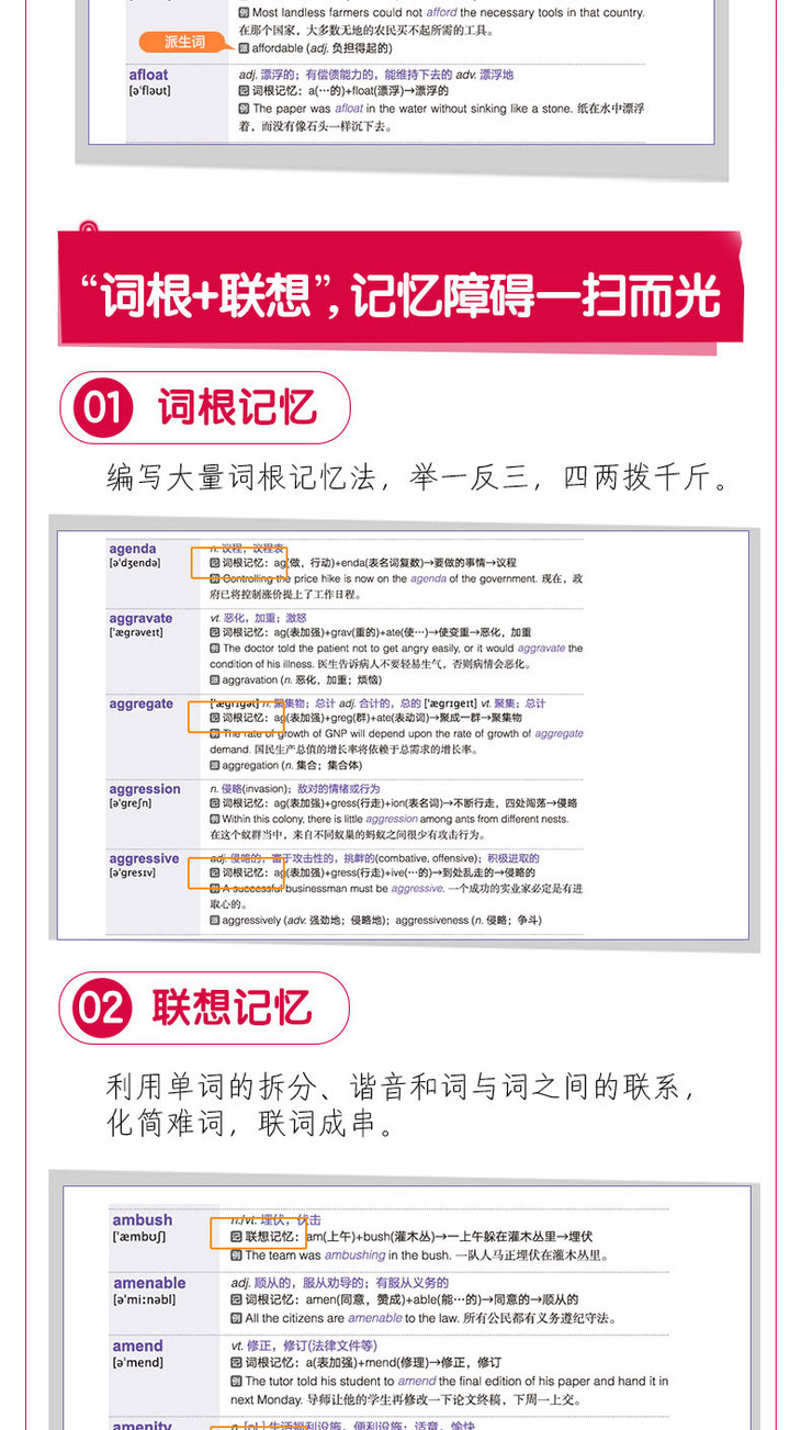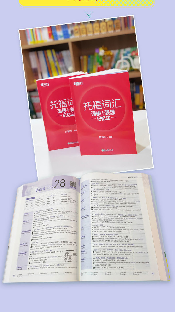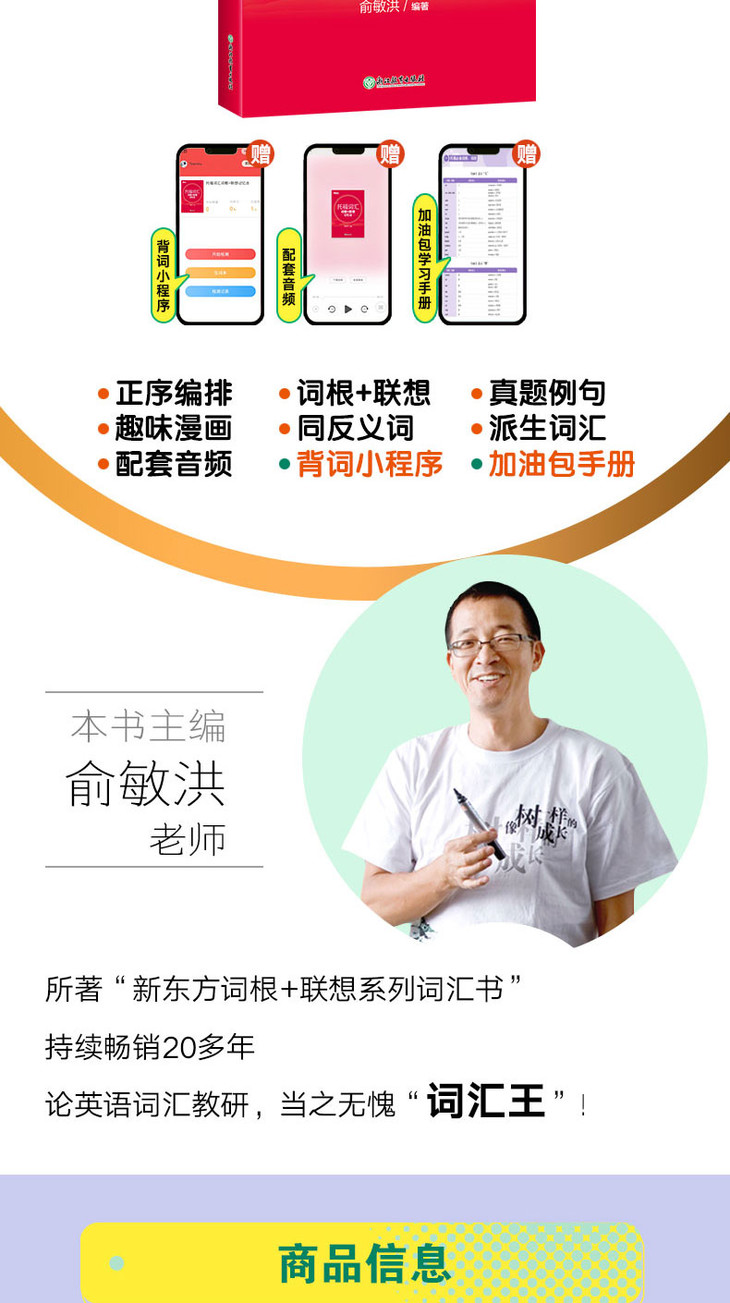 编著有“词根+联想”系列词汇书,对应中高考、四六级、专业四八级、考研、考博等国内考试,以及TOEFL、IELTS、SAT、GRE、GMAT等出国考试,深受读者喜爱。