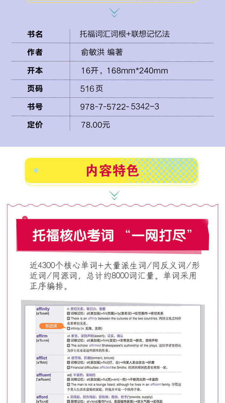 《托福词汇词根+联想记忆法》收录近4300个托福核心单词,提供大量派生词、同义词、形近词和同源词。全书总计约8000词汇量,单词采用正序编排。