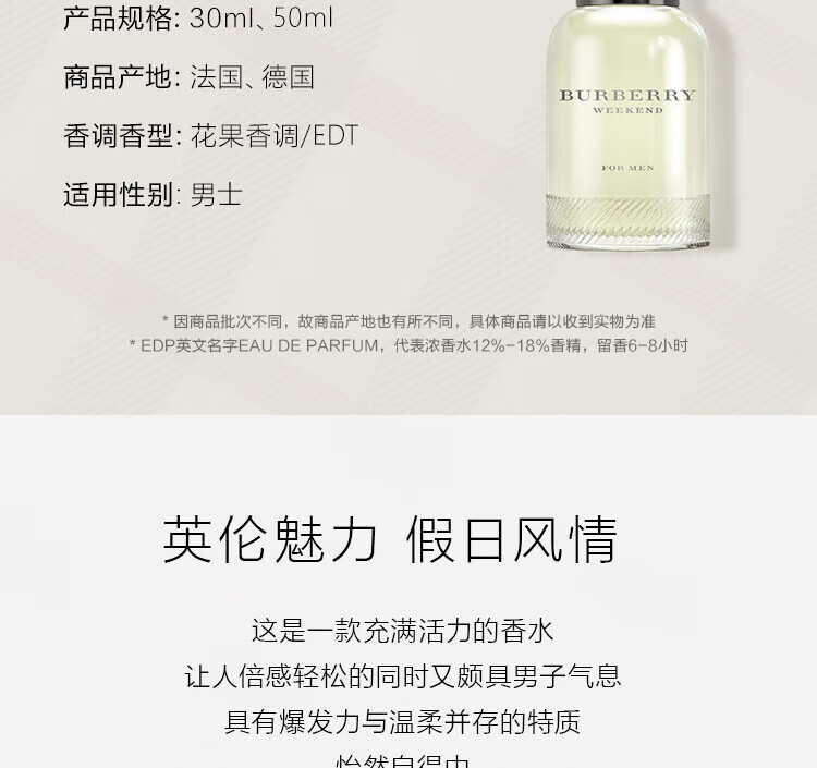 【保税仓】巴宝莉周末男士淡香水白盒简装版EDT100ml