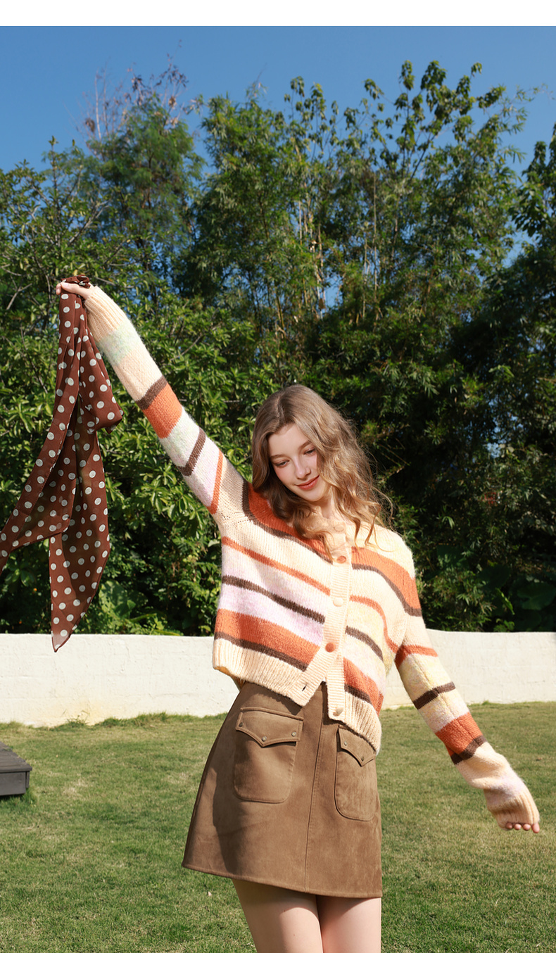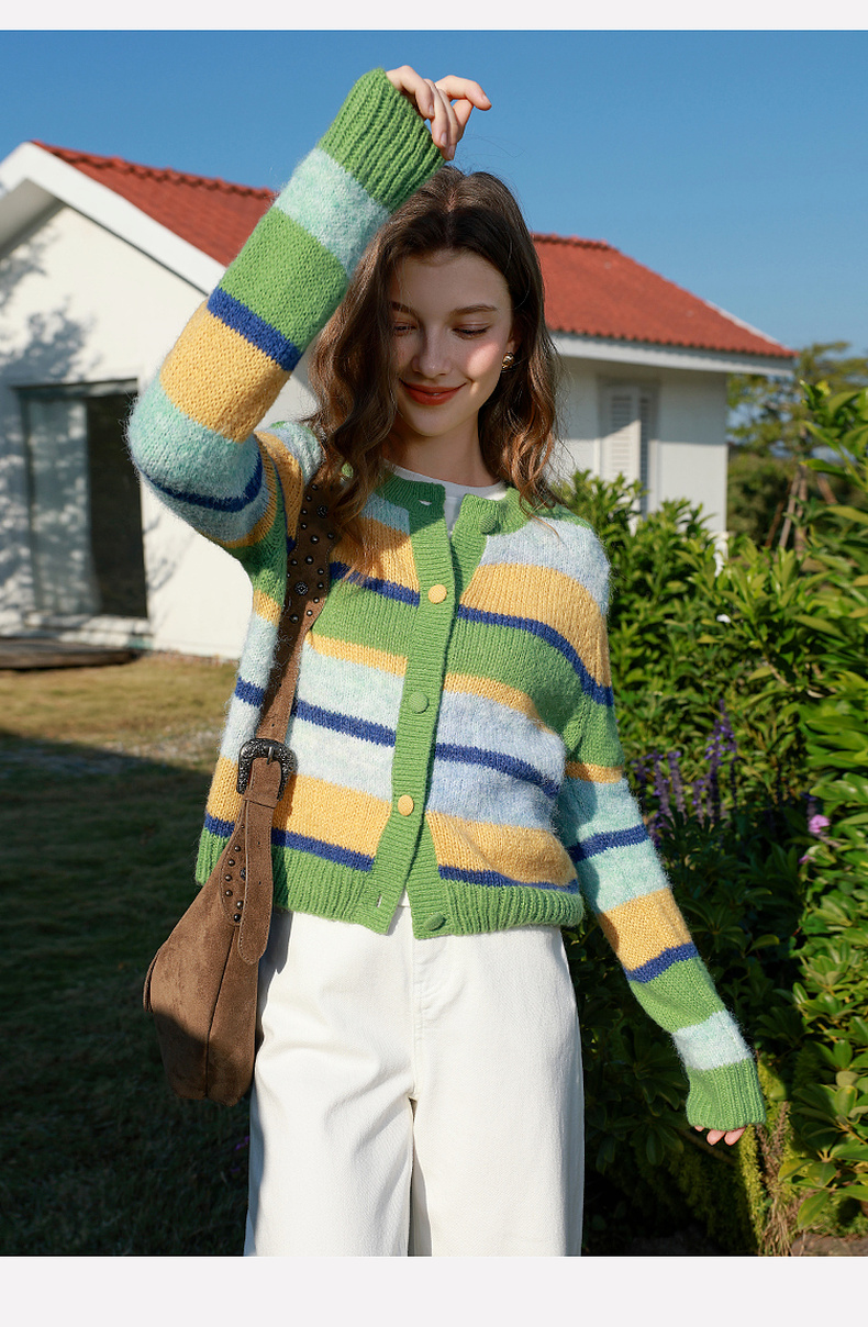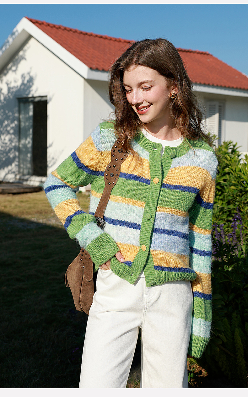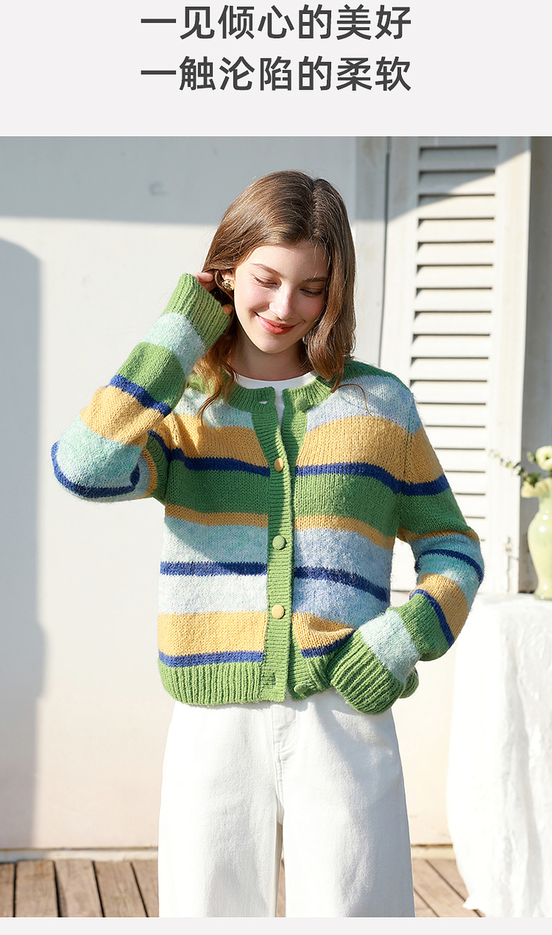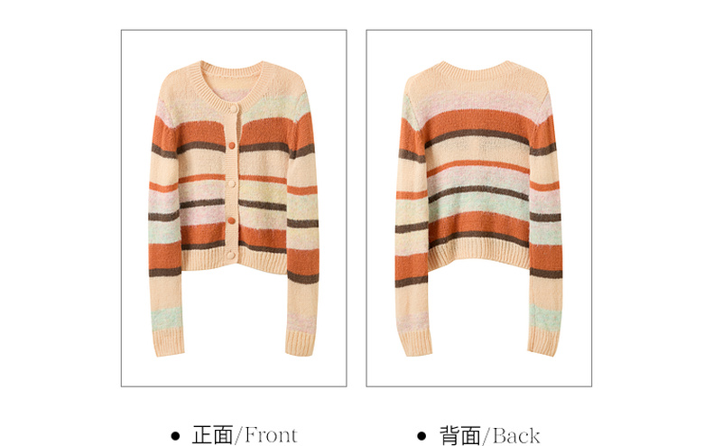 三彩2026春季新款渐变段染条纹针织衫圆领毛衫短款开衫宽松M