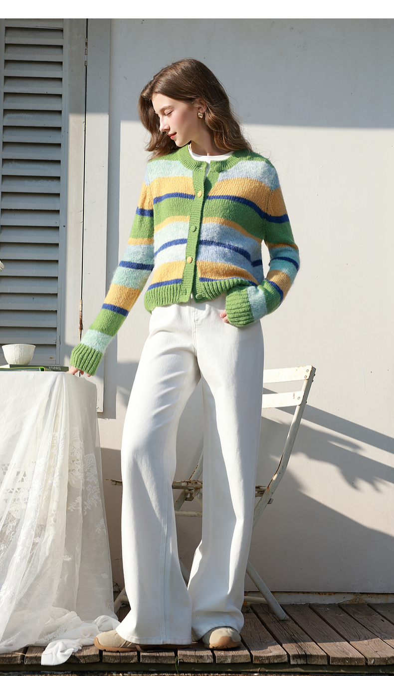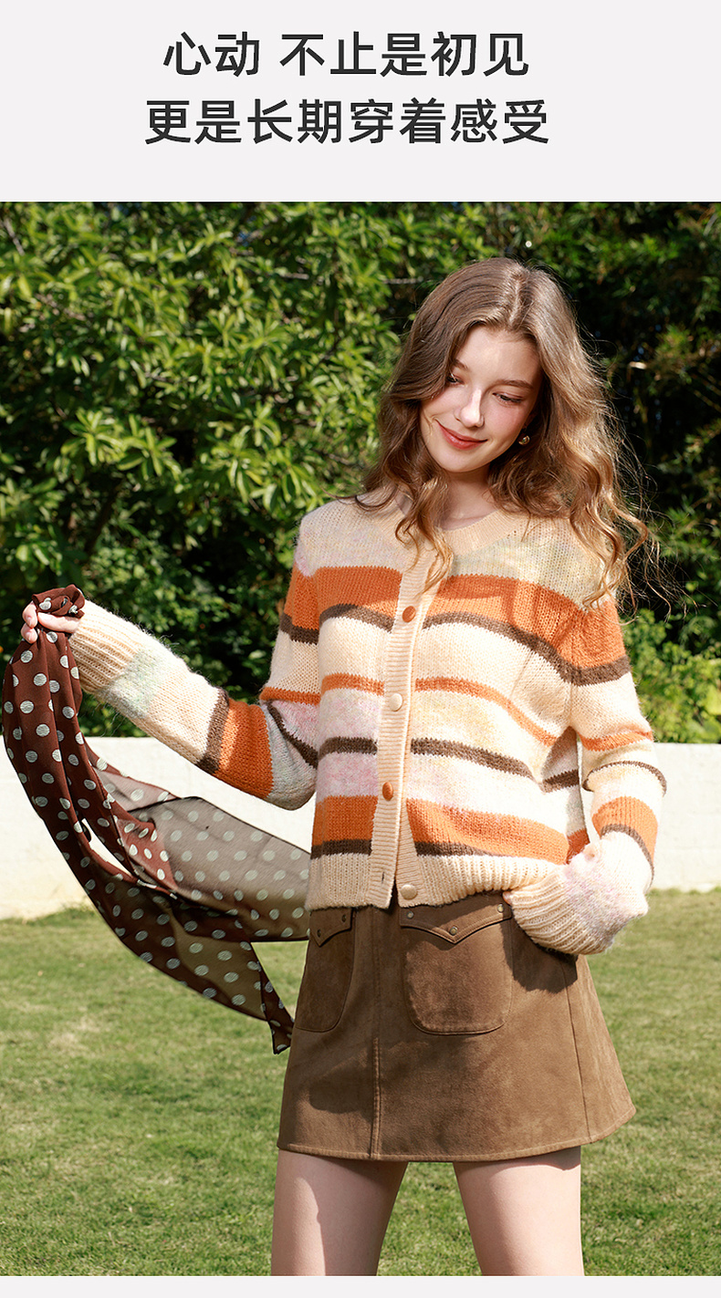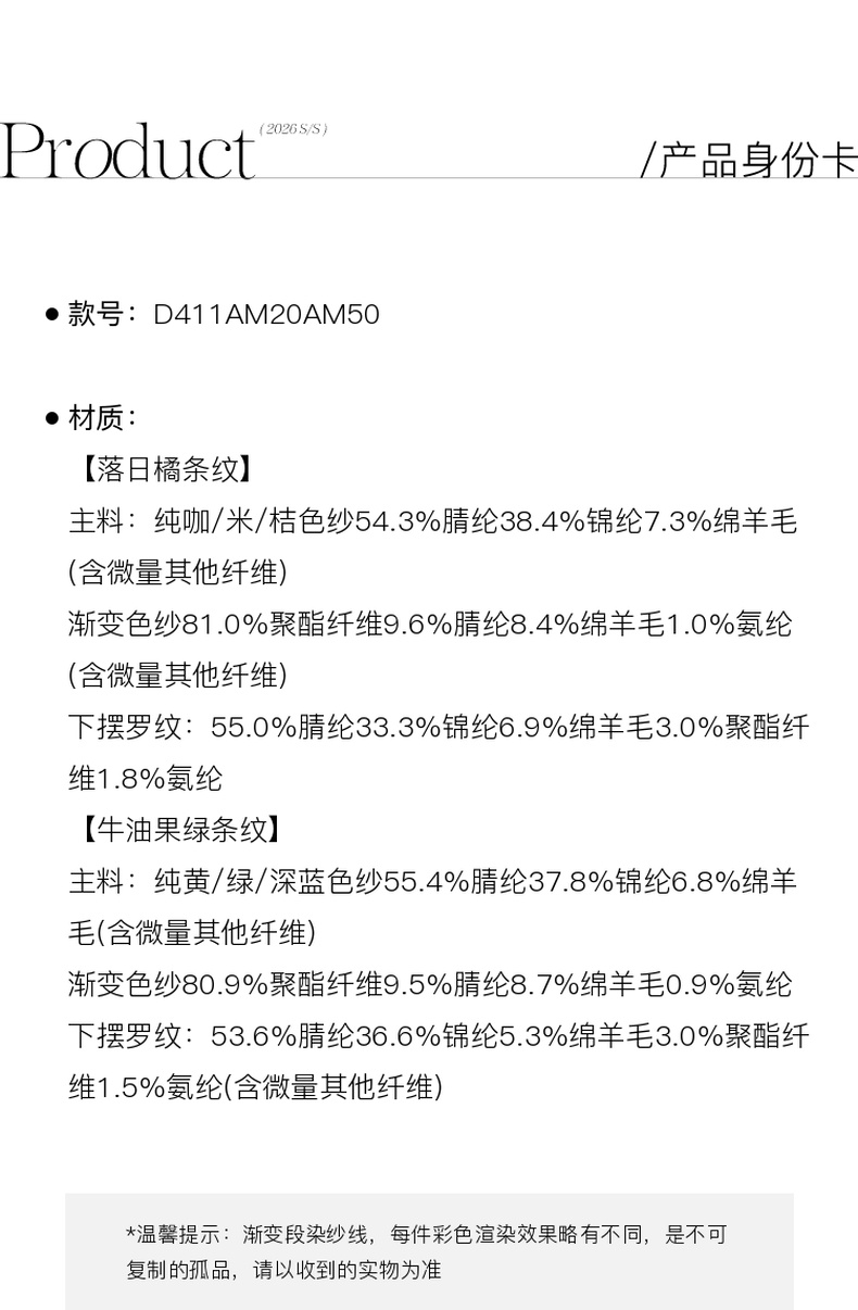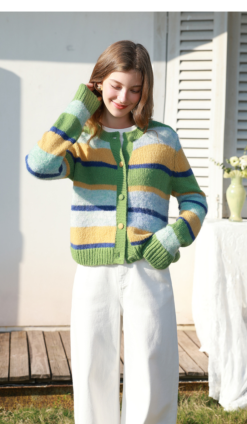 三彩2026春季新款渐变段染条纹针织衫圆领毛衫短款开衫宽松M