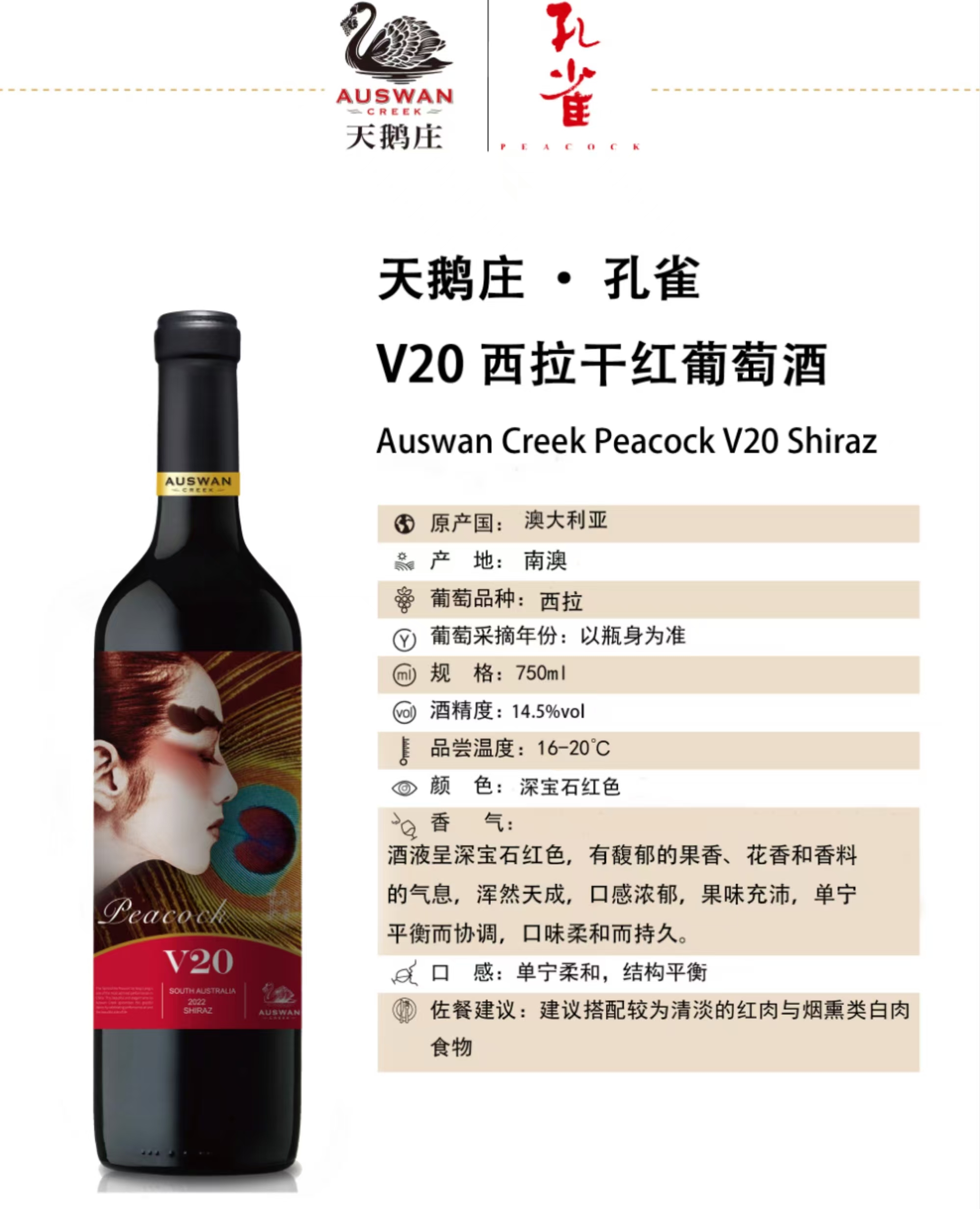 天鹅庄auswan 孔雀V20西拉干红葡萄酒 红酒14.5%vol 750ml