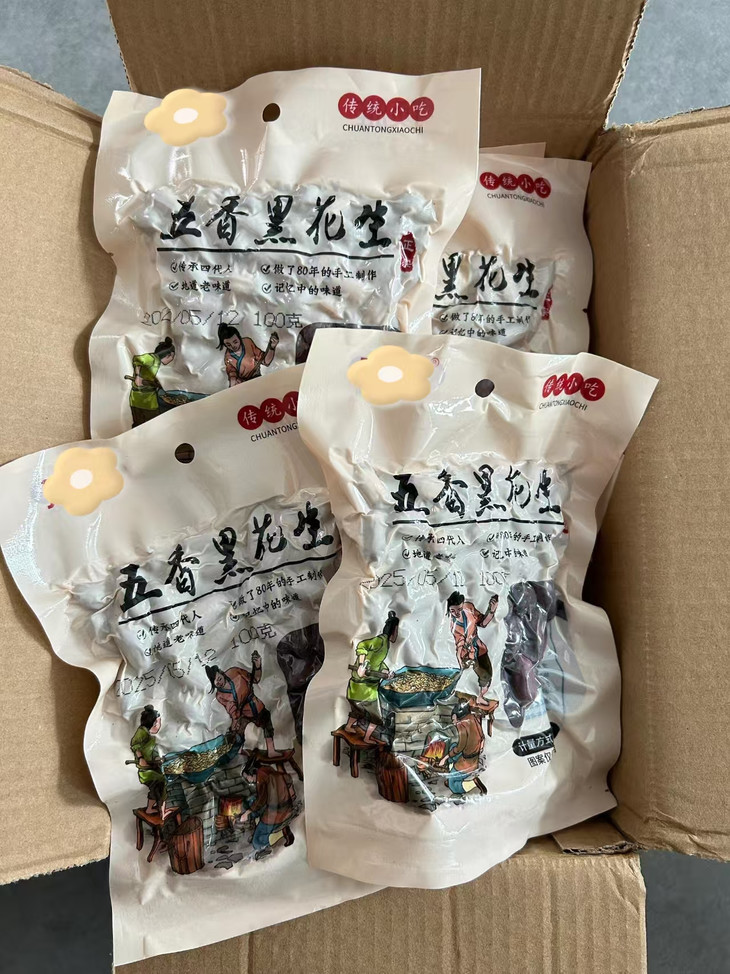 【商品名称】五香黑花生米 【上架规格】100g*5袋 【保质期】240天 【生产日期】最新日期 【储存条件】常温避光 【发货地】山东 【生产地】山东 【发货快递】三通一达、极兔随机发货 【不发货地区】新疆,西藏,港澳台 【加运费地区】北京、上海+1元/件,青海、甘肃、宁夏、内蒙古、海南+3元/件 【发货时间】72小时 【售后规则】 1、食品类不支持7天无理由退换货 2:若收到产品有质量问题或者破损少件,请签收24小时内对产品拍照+快递箱面单照片联系售后处理 3:个人口味问题不在售后范围内 【拦截/拒收扣费】拦截拒收退货扣3元