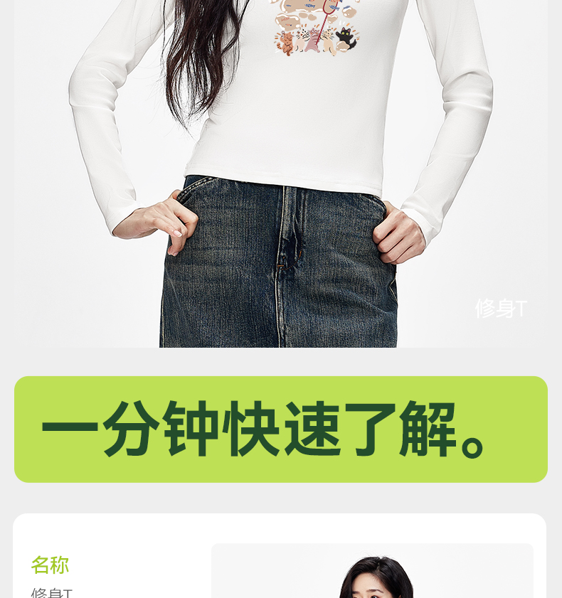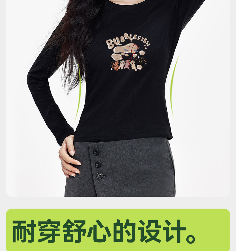 「棉的美学」正肩修身打底衫上衣女趣味印花内搭舒适柔软长袖T恤