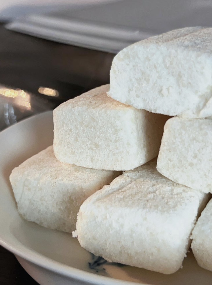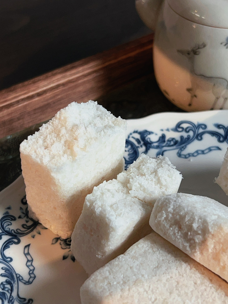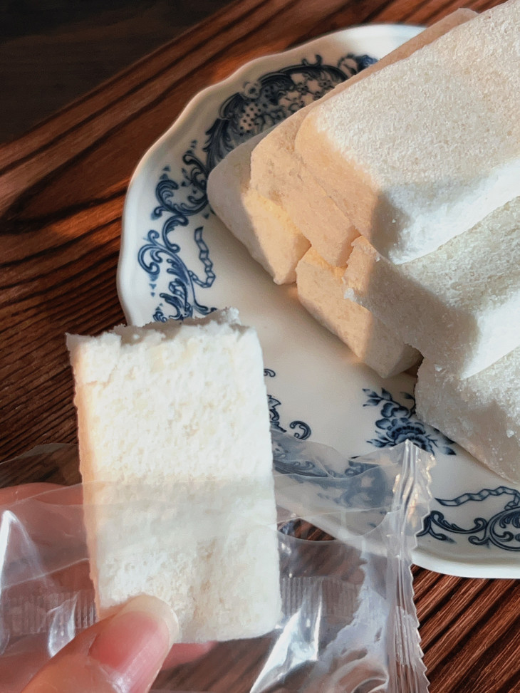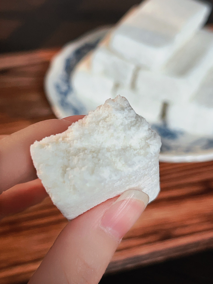怎么会有这么神奇的口感 简直了啊啊啊!! 表层像云朵一样☁️ 轻轻一抿就化开 ~ 糯米和粳米的绝妙配比 让糕体带着微微的Q弹 但完全不会粘牙!!绵密得像在吃空气感奶冻🥛 还有更绝的是 这个茯苓糕自带的清香!!! 不是那种中💊的苦涩味 而是淡淡的木质调回甘 越嚼越上头 冷藏后吃直接解锁冰糕口感🤣🤣