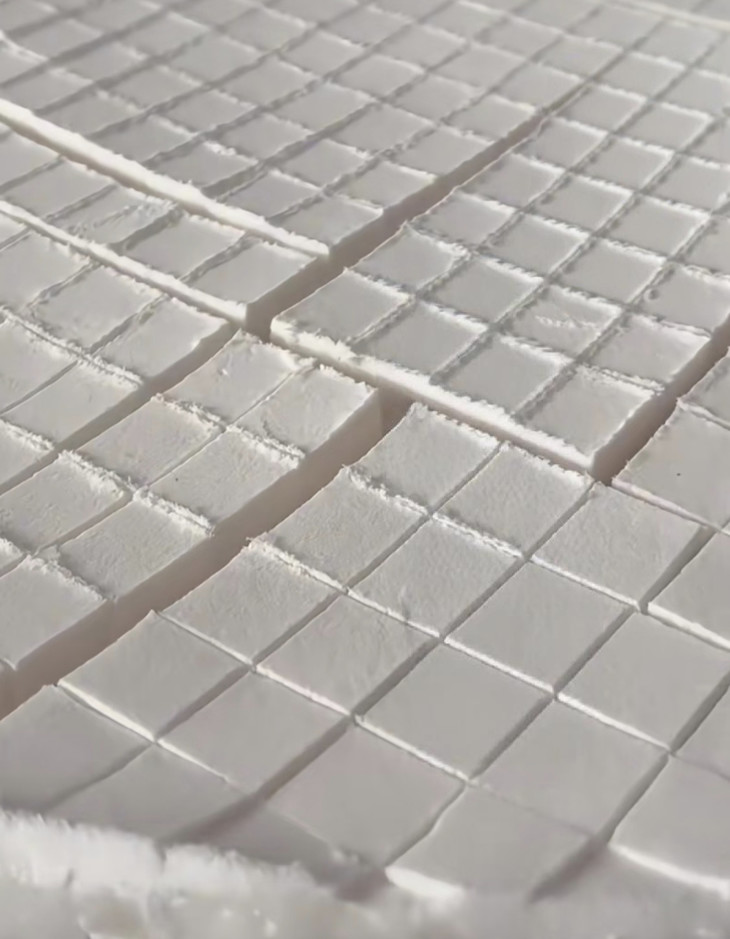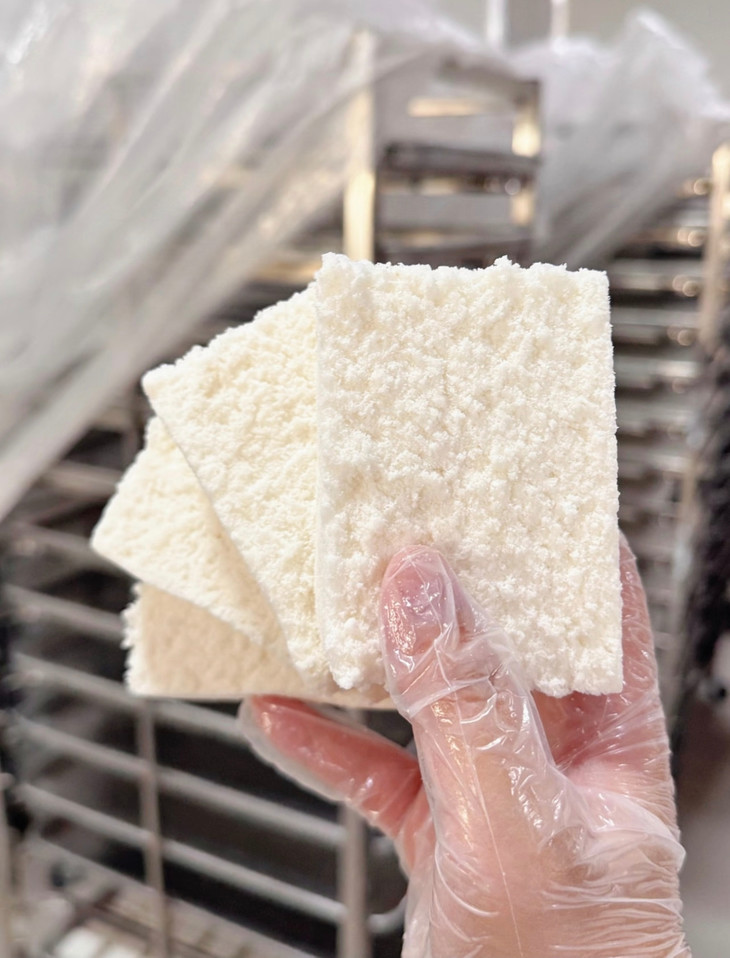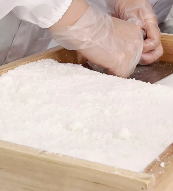 敲重点!! 下一步师傅需要纯手工压模👍 压茯苓糕这个技术活不能采用机器 因为要是机器压 力度小了不成型 力度大了不松软 口感就会非常硬 将一块块茯苓糕压成型 每块大小 厚度都超均匀😋 机器根本做不出这「会呼吸」的松软感~